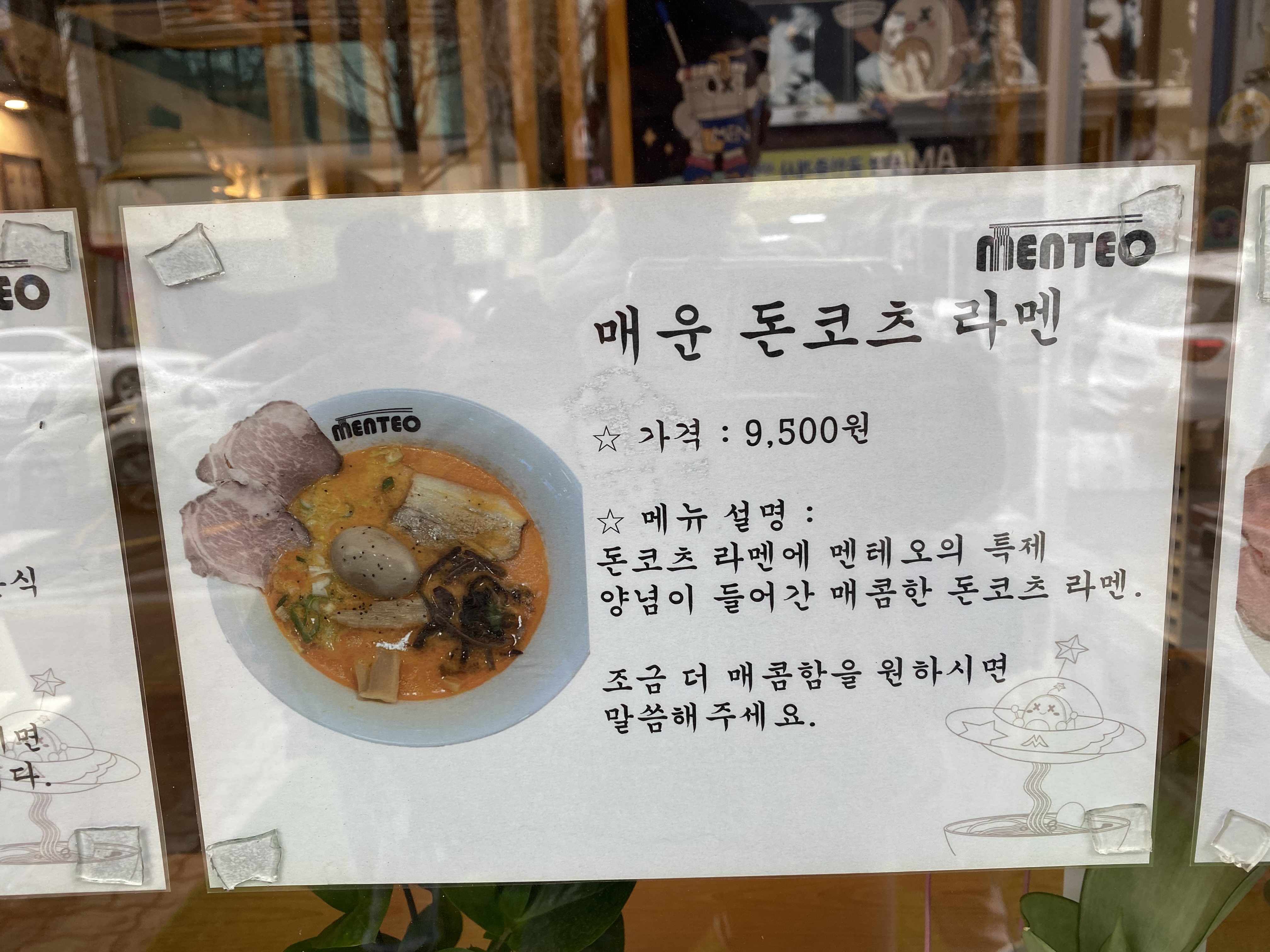 지난 주말 봄이 오려나 싶어 선택한 나들이 계획이었는데 날씨가 구리구리하고 너무 쌀쌀한 게 도저히 나들이를 갈만한 상황이 아니었습니다. 그래서 급히 계획을 변경해 실내 놀이도 하고 초등 입학하는 준비도 할 겸 겸사겸사 백화점 나들이 투어로 계획 변경~!!! 그전에 금강산도 식후경이라~ 왕생로길 주변에 일본 음식 골목길 투어를 떠나보기로 했지요. 평일 쓸쓸히 홀로 맛을 봤다면 이번엔 가족 총출동이라 날씨는 별로여도 기분은 좋았지요^^ 멘야마쯔리 마제소바를 먹었던 곳으로 가보니 이야~~ 맛집으로 소문이 난건지 아님 마침 점심시간이라서 그런지 길게 웨이팅을 하고 있더군요. 라멘에 목숨 건.... 그런 건 또 아니라 여기 아니면 다른 곳 가보면 되겠다 싶어서 다시 주변을 기웃기웃해봅니다. 그러다 눈에 띈 라멘집이 'menteo'입니다. 앞번에 혼자 지나갈 때는 없었는데 최근에 개업한 가계가 아닌가 싶더군요. 점심시간인데 사람도 없는 게 알려지지 않은 집이거나 맛이 없거나 둘 중 하나 아니겠나 싶어 궁금증이 들었습니다. 마침 아들이 더 이상 힘들어 못 걸어 다니겠다 심통도 났고 라멘! 라멘! 크게 외쳐대는 바람에 급히 방문하게 되었네요.^^