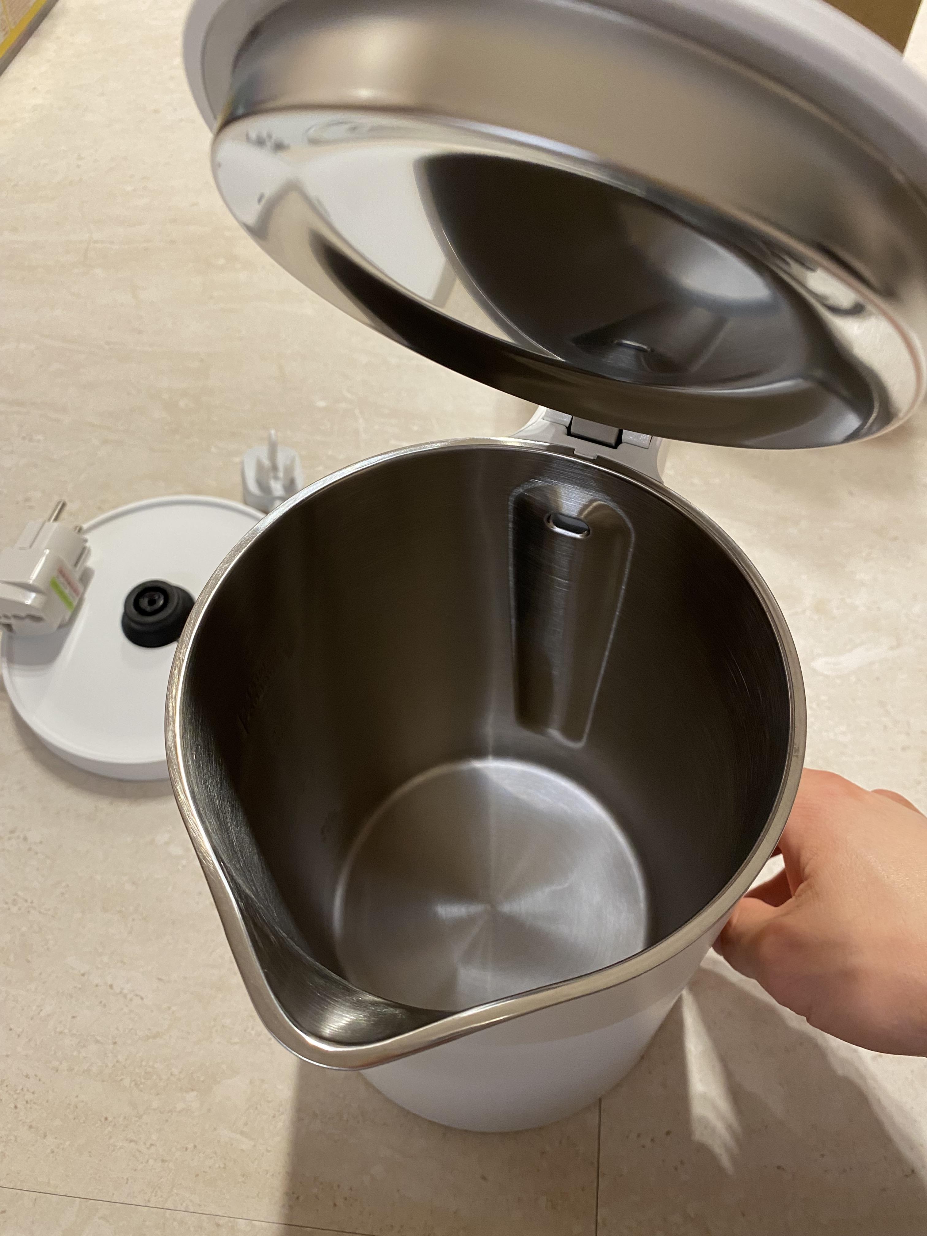 손잡이 윗부분에 전기포트 뚜껑 여는 버튼이 있고 살짝 눌러주면 오픈!! 외부는 플라스틱 소재라 열전달이 안되어서 화상 위험 없고요, 내부는 스테인리스 일체형이라 열이 골고루 전달되어 물이 빨리 끓고 청소하기 무척 좋은 구좁니다.