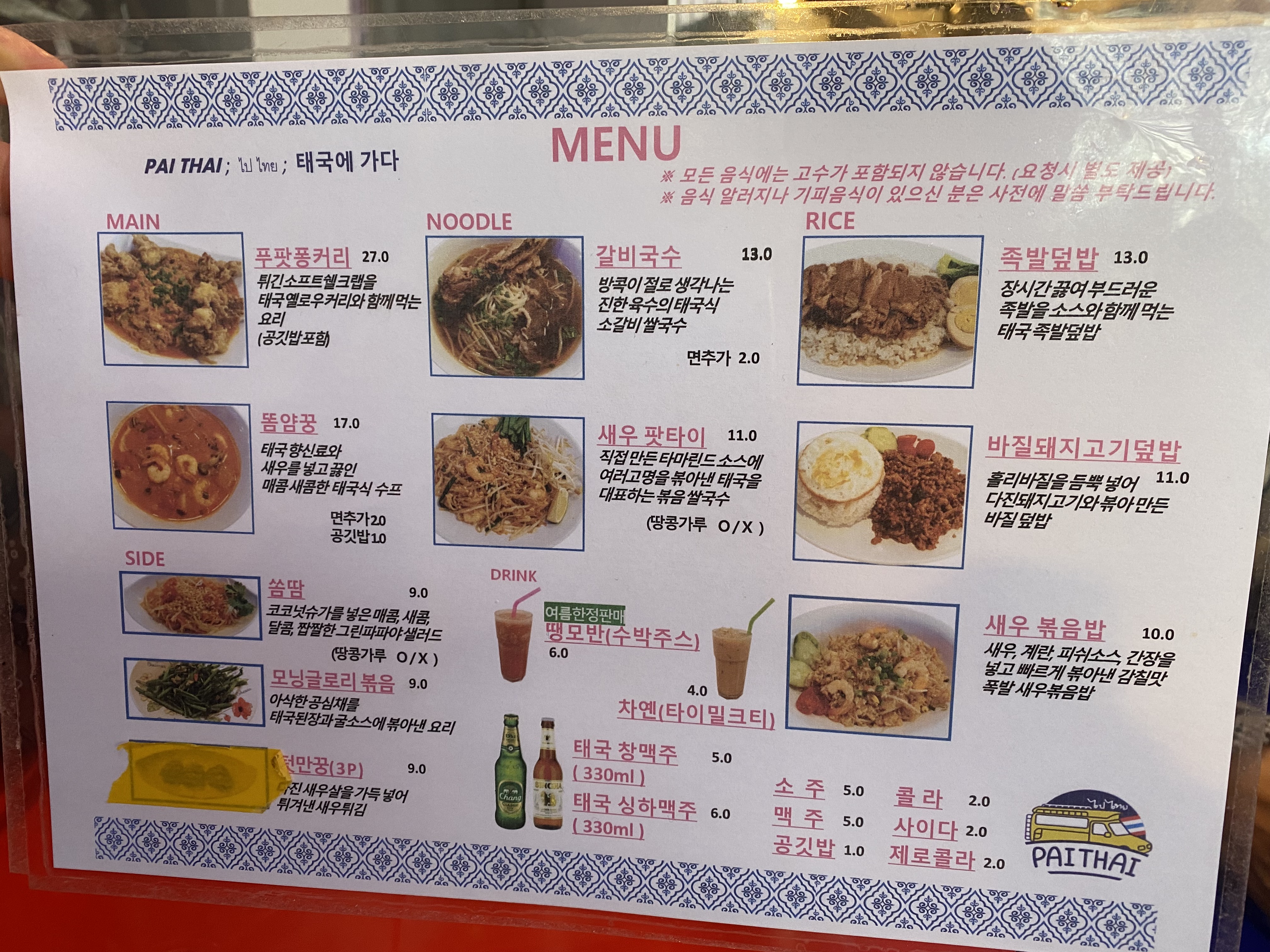 아들이 초등학교 입학 전 봄방학 기간 동안 외식을 하는 시간이 많았는데 오늘은 아들도 찐 맛집으로 인정한 태국 음식점 이용 후기를 올려봅니다. 상호가 태국어로 되어 있는데 'PAI THAI' 간판이 보이고요, 한국어로는 빠이타이 입니다. 요기는 울산 블로거분께서 먼저 후기로 올려놓은 걸 보고 꼭 한번 가봐야겠다는 생각으로 keep 해놓은 곳인데 예전 현백에 태국 음식점 있을 때 즐겨먹었던 갈비 국수가 생각이 나서 아들과 함께 방문했답니다.