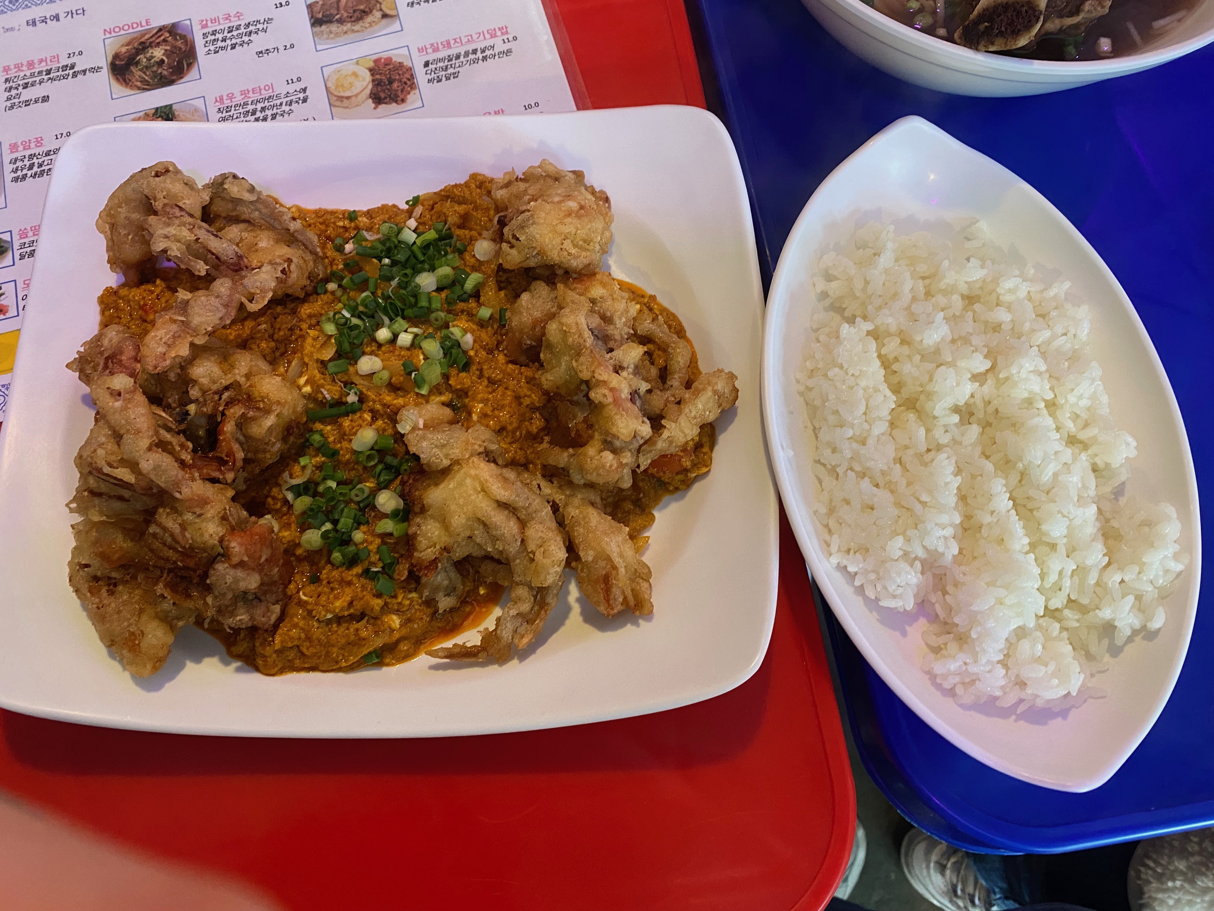 대략 여섯 팀 정도 손님들이 있었는데 각 테이블마다 공통으로 푸팟퐁커리를 먹고 있더군요. 그래서 저희도 커리 하나와 원래 먹고 싶었던 갈비 국수 하나를 주문했습니다. 새우볶음밥도 맛있게 보였는데 워낙 소식 좌 와이프님이라 두 개만 시켜보고 모지라면 추가로 볶음밥을 시키기로 했지요.