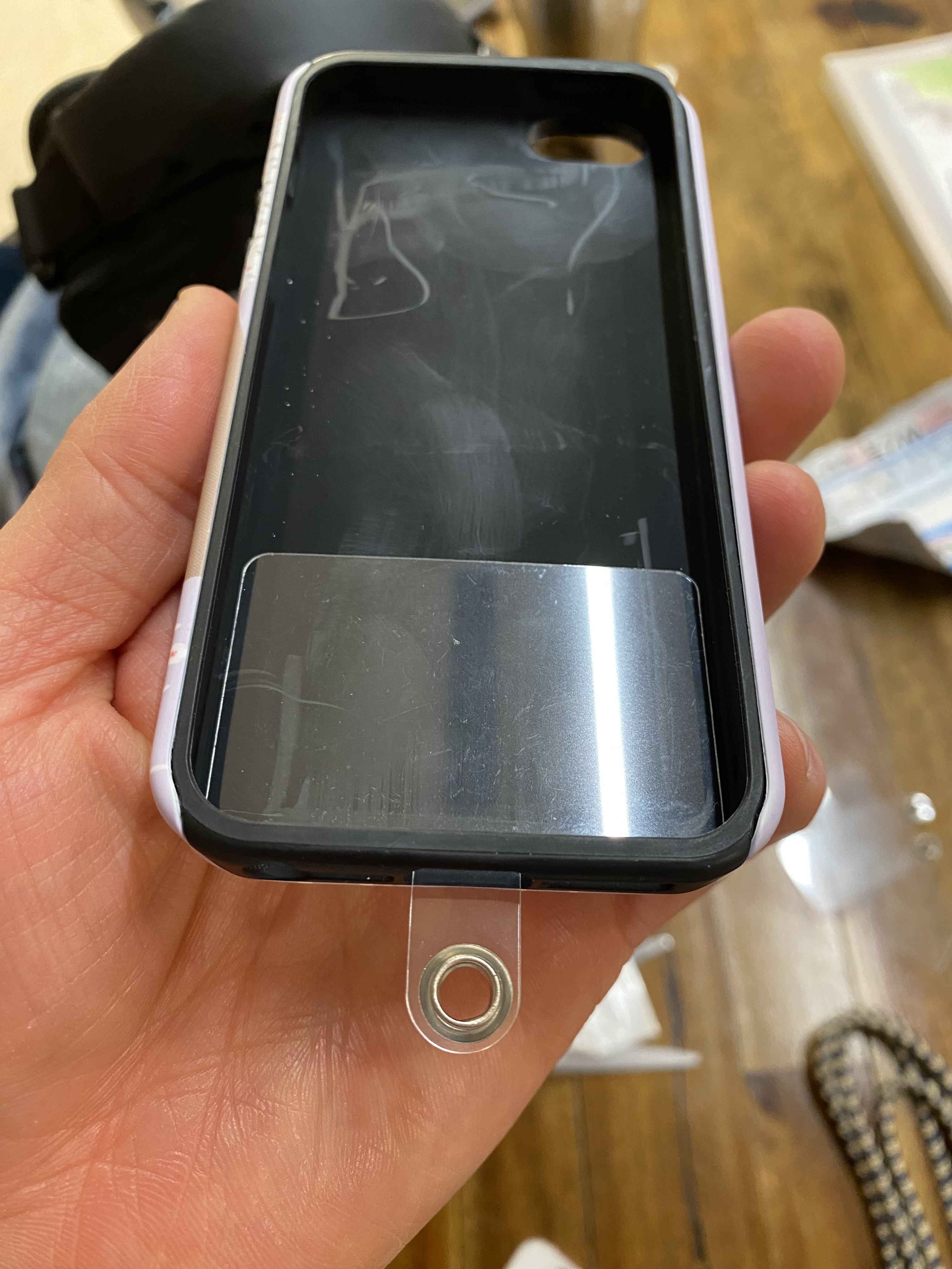 우와~~~ 사이즈 완전 딱 맞습니다. 태그 홀더라 핸드폰 케이스 안에 쏙!! 마치 아이폰se에 맞게 만들어진 것인 양 아주 퍼펙트하게 잘 들어갑니다.