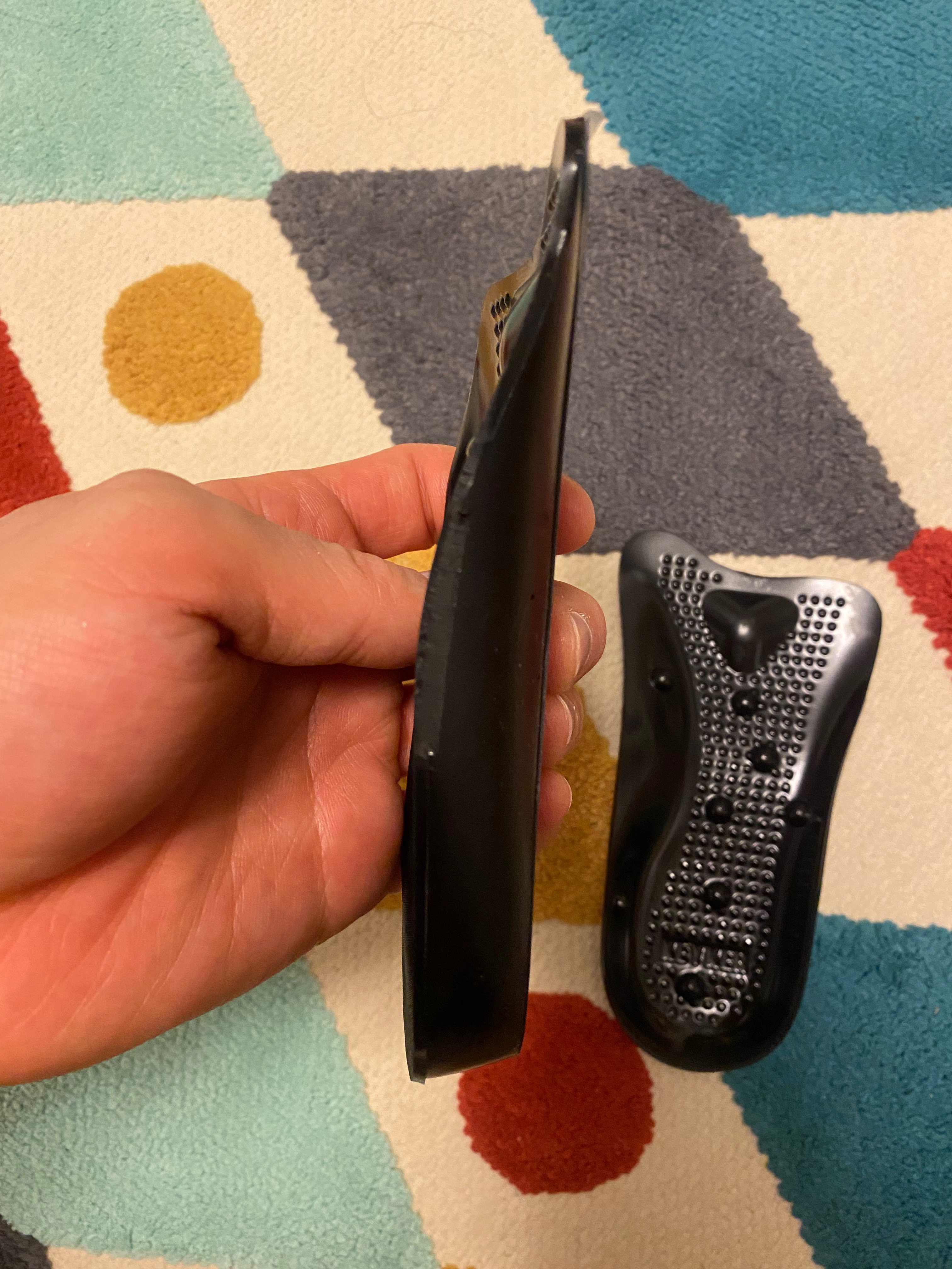 색깔이 검정이라 좀 구매할 때 망설였는데 뭐 어차피 계속 신다 보면 때 타니까 검정이 차라리 나아 보입니다. 만져보면 말랑말랑하고 제법 도톰하게 느껴지는 게 충격 흡수를 잘 해줄 거 같네요. 사진에서 오돌토돌 돌기가 나와있는 부분이 윗면으로 발바닥이 닿는 부분 되겠습니다.
