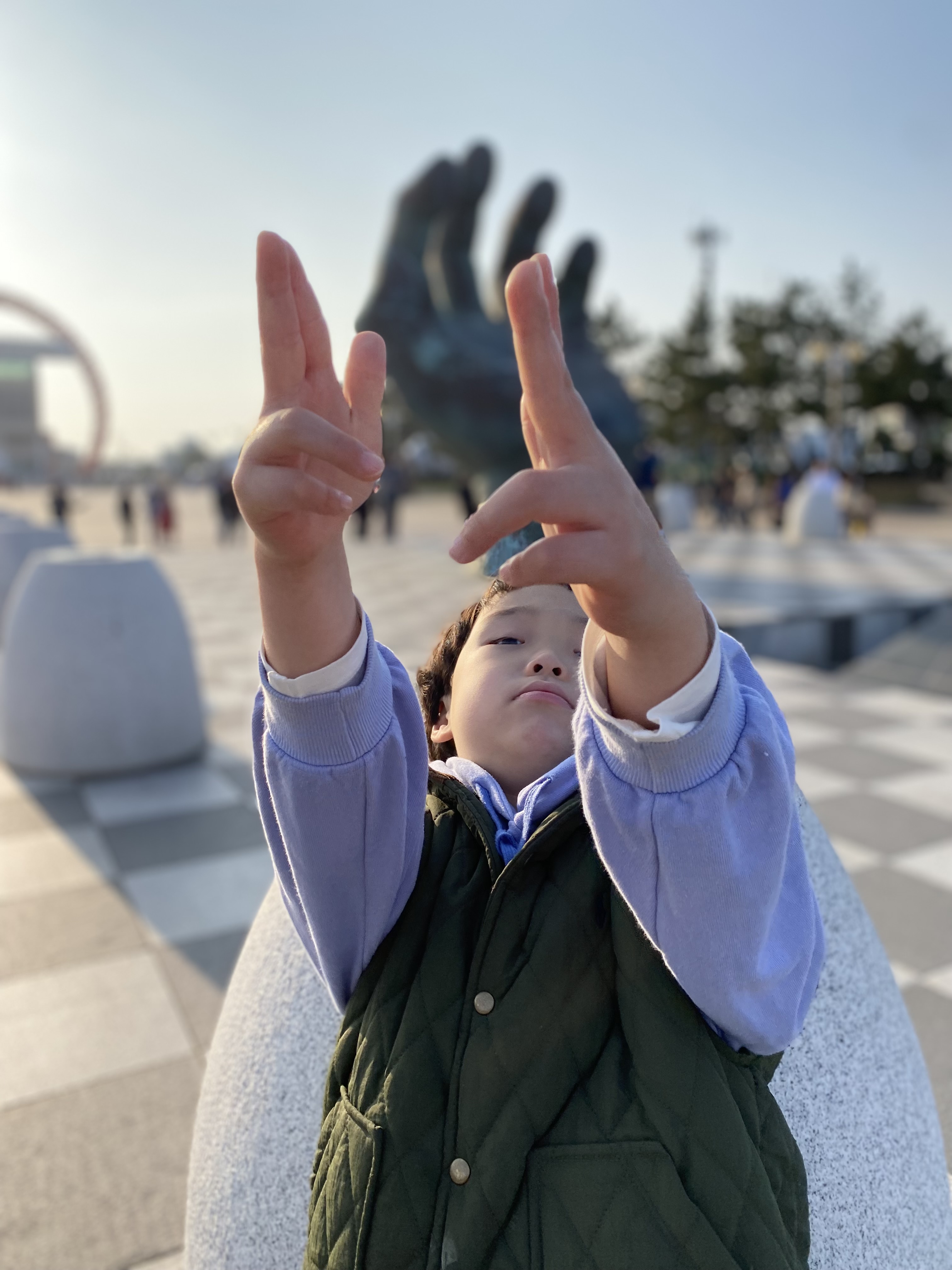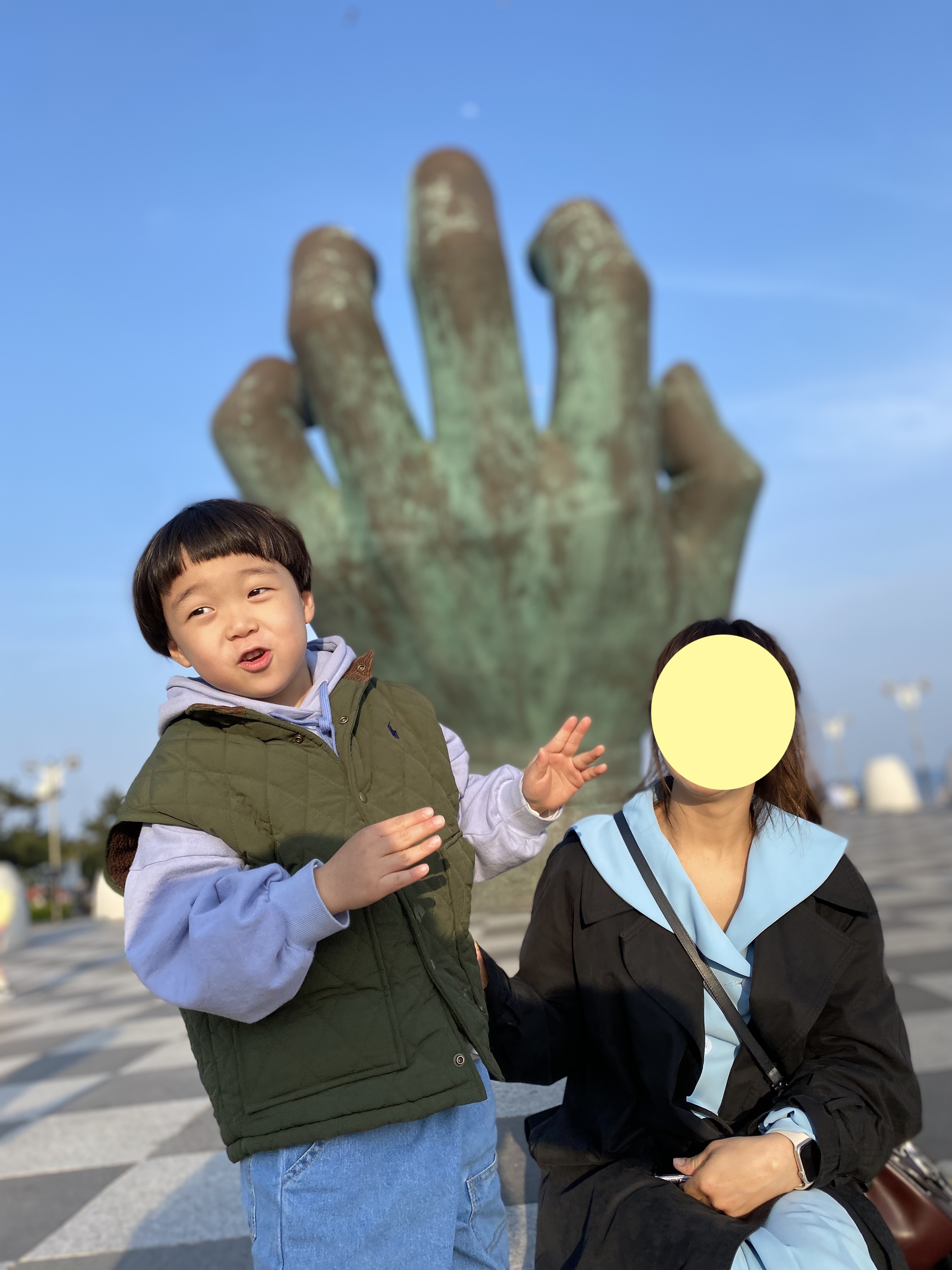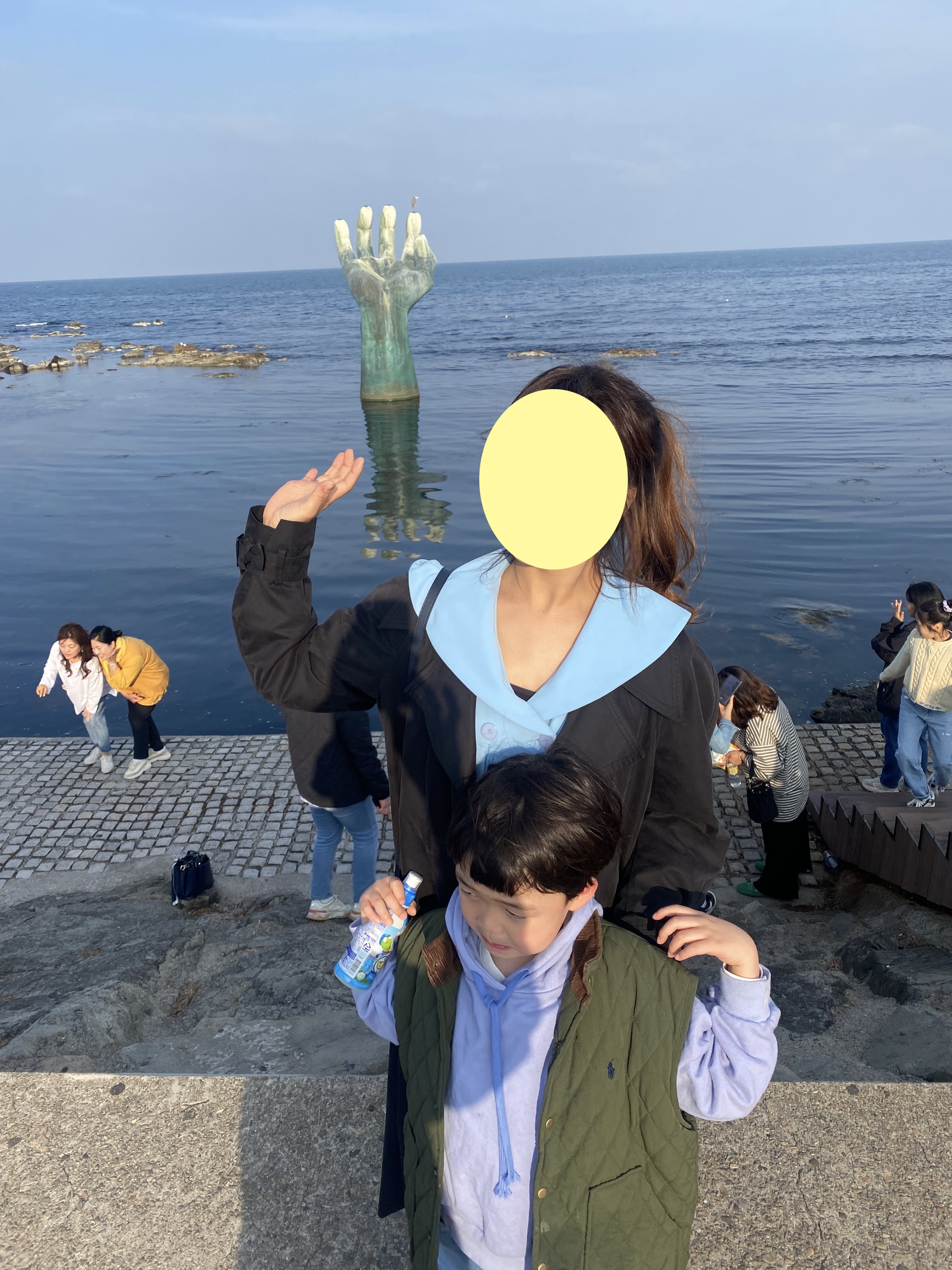 여기서부터는 호미곶 광장에 있는 손 동상과 바다에 설치되어 있는 손 동상에 관련된 사진인데요 아들에게 옛날에 초거대 거인이 여기 살았었는데 그때 거인의 손을 두 군데다 설치해놓은 거라고 MSG를 많이 쳤지요~ㅋㅋㅋ 초1 아들은 아직 스마트 기기에 노출이 적게 되어서 그런지 아빠 말을 엄청 신기해하며 잘 들어줬답니다^^