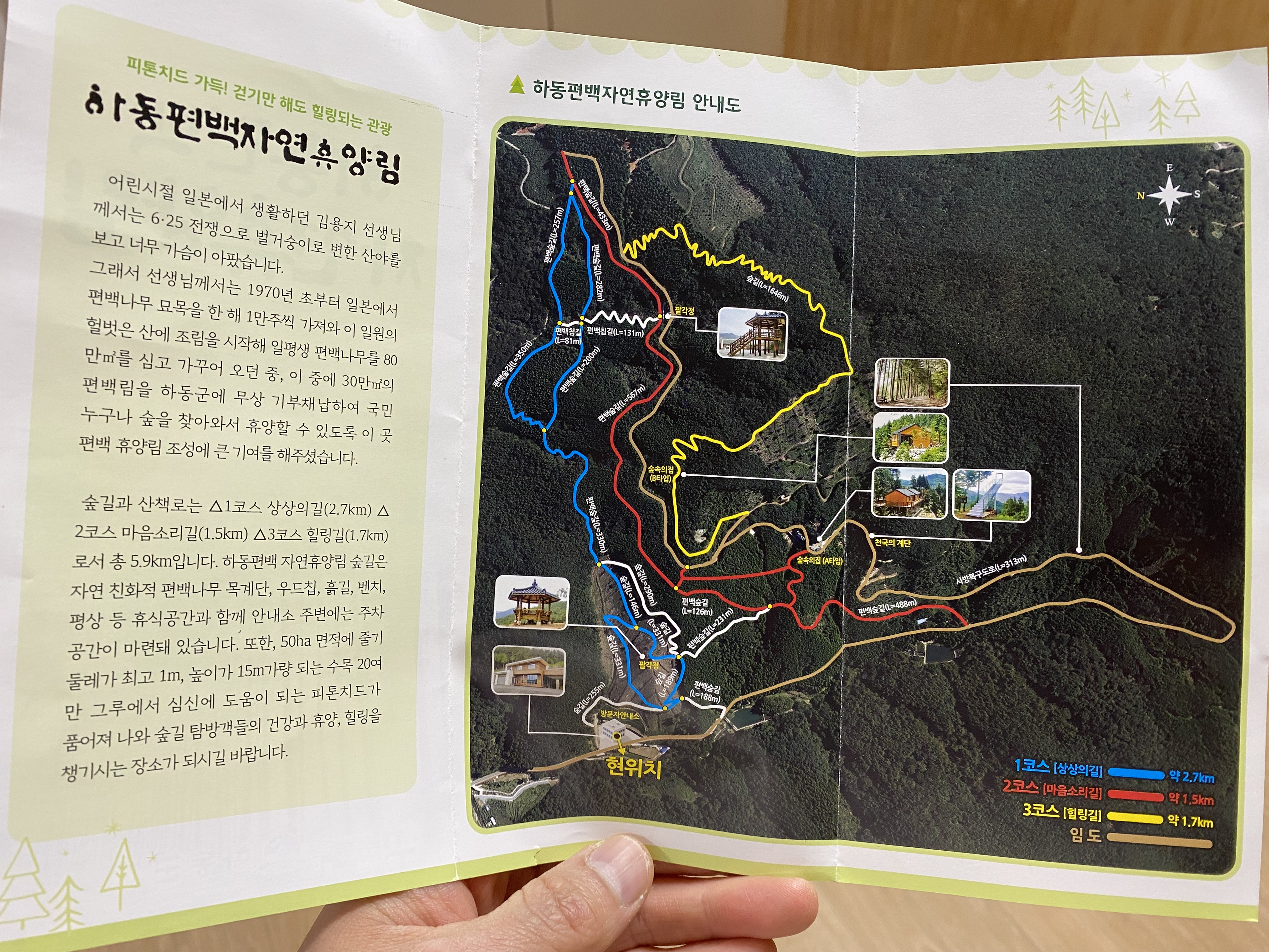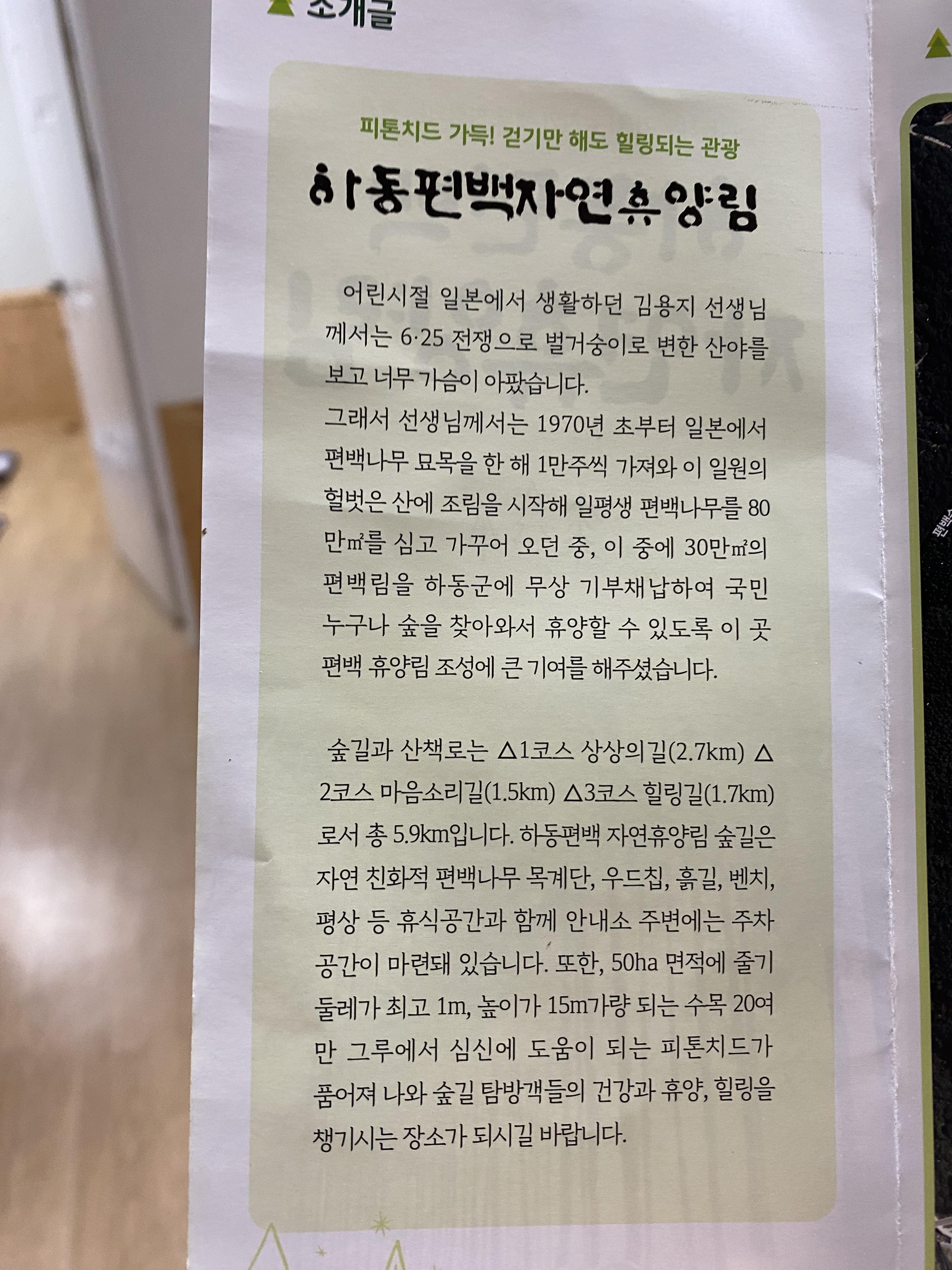 안내 팜플렛에 휴양림 소개가 자세히 되어 있는데 산책로 코스가 여기는 그냥 등산 코스입니다. 그래도 가보면 무척 좋을 거 같습니다. 저희는 8살 아들 좀 더 키워서 요런 산책로 코스 다녀보려고요ㅠㅠ 여기 휴양림이 만들어진 역사가 안내되어 있던데 김용지 선생님이 혼자서 이 드넓은 산을 편백나무로 가꿨다고 하네요. 30만 제곱미터 편백림을 하동군에 무상 기부하여 휴양림 조성을 했다는.... 정말 대단하신 분입니다.