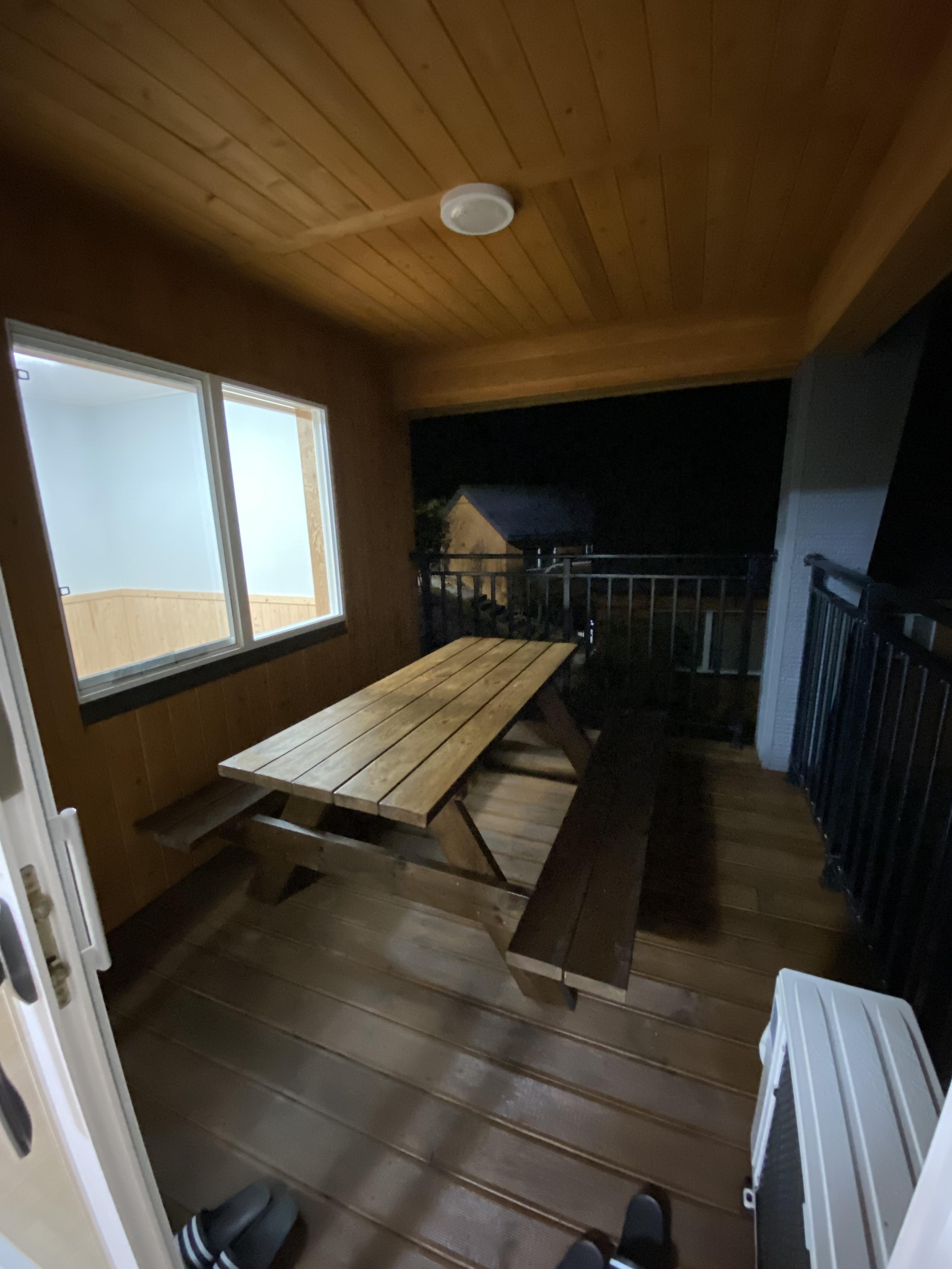 방은 세명은 충분히 잘 수 있는 공간이고 야외 테라스에서는 고기를 구워 먹을 수 있는 테이블이 마련되어 있습니다. 밤이라 몰랐으나 테라스 나가면 눈앞에 편백나무가 딱!!!!