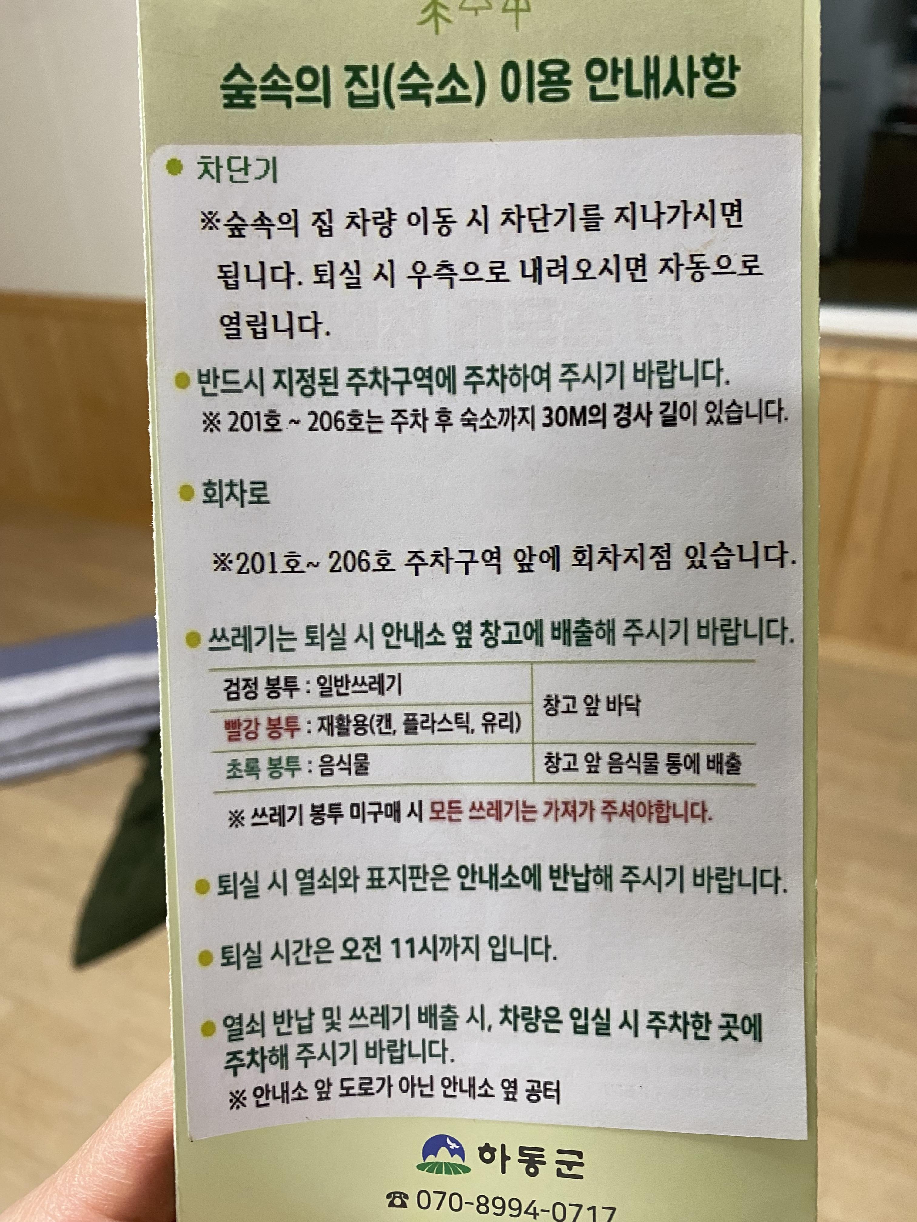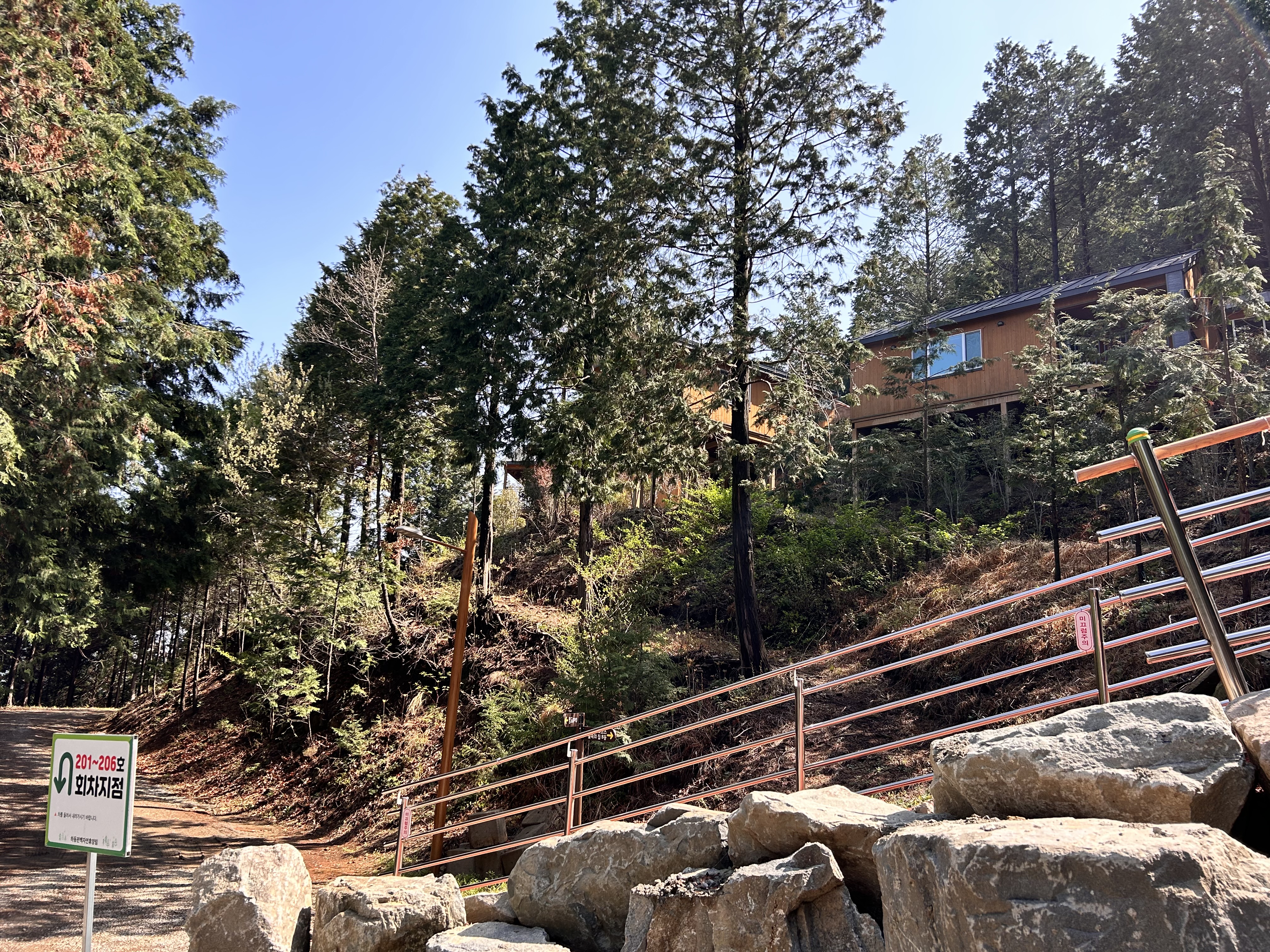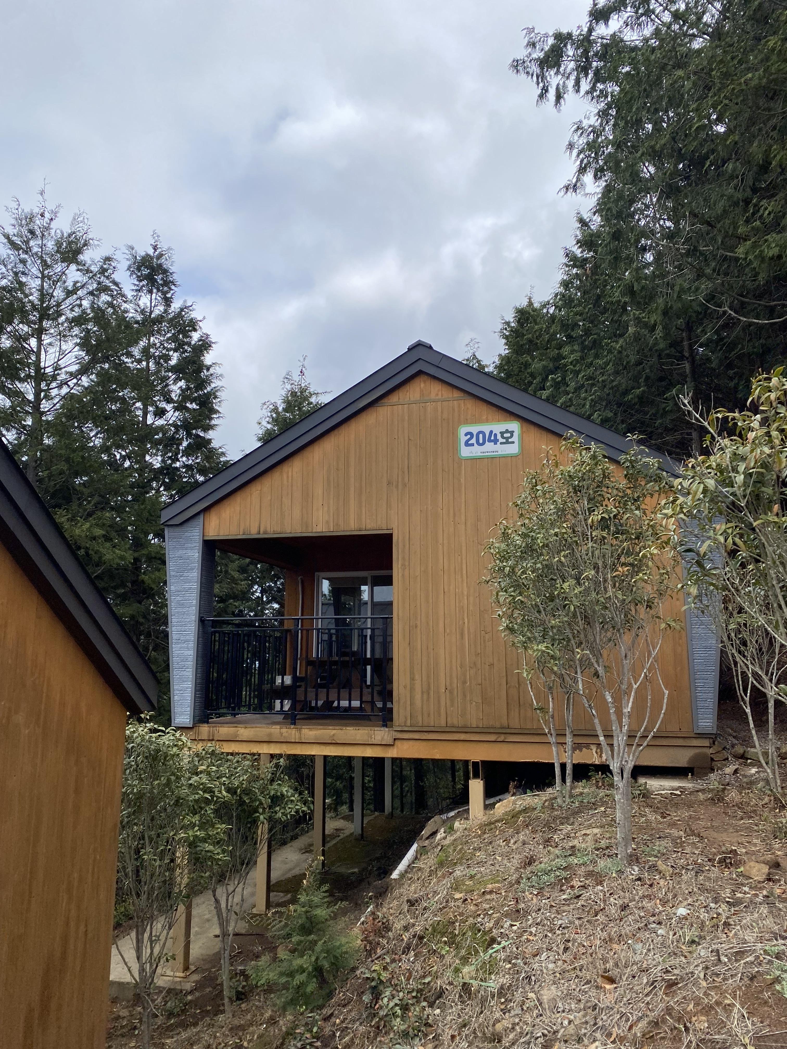 해가 쨍하게 나온 사진은 3일째 퇴실하면서야 비로소 날씨가 좋아졌는데요, 바로 그때 촬영한 사진이고 그 외 나머지 사진은 숙소 머물면서 촬영한 사진들입니다. 역시 여행의 80퍼는 날씨가 좋아야 해요ㅠ. 우측 사진이 저희가 묵은 204호 숙소입니다. 하동 편백자연휴양림은 계속 개발하고 있는 휴양림인데 현재 이용 가능한 곳은 1, 2단지 숙소가 있고 3단지는 올해 상반기에 완공이 된다고 합니다. 그중에서 접근성이 좋은 숙소는 1, 3단지이며 2단지 숙소는 가파른 오르막길에 차량 진입이 안되어서 숙소까지 짐을 힘들게 옮겨야 한다는 점 반드시 숙지하시고 숙소 예약을 하셔야 합니다. 숙소 예약 전에 안내사항에 올라와 있다고는 하는데 자연휴양림 예약해 보신 분들은 알겠지만 예약하는 거 자체가 무척 힘들다 보니 빈 곳 나오면 물불 안 가리고 일단 예약부터 잡아놓거든요. 여기 2단지 숙소는 진짜 가파른 경사로여서 겁나 빡십니데이~