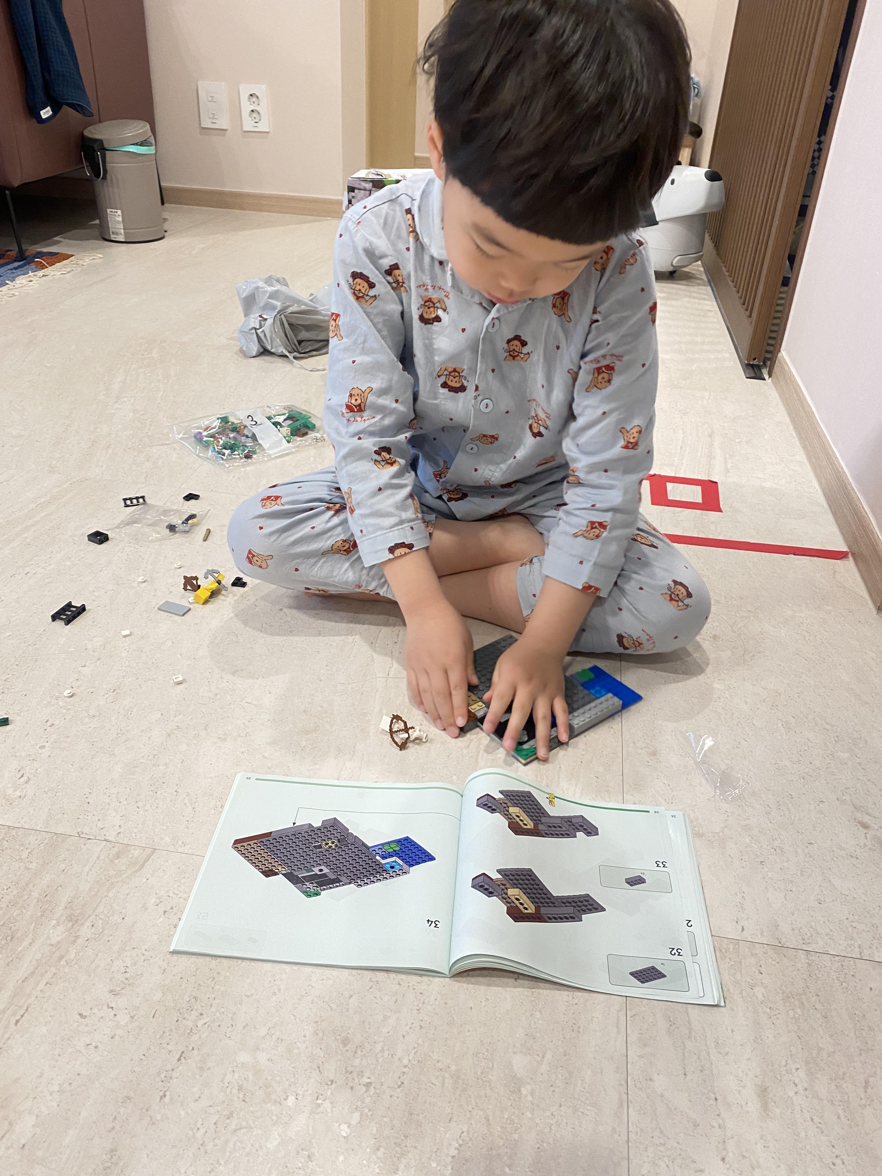 머리는 새집 지어놓은 상태로 1번 블럭봉지를 뜯어서 열심히 조립 설명서를 보면서 초 집중모드 발동~!! 이순신 장군성 조립 때는 조립 설명서를 보면서 필요한 블럭을 찾아주는 정도로만 아빠 비서 역할을 했었는데... 언제 이렇게 컸는지 혼자서 블록 조립을 척척해나갑니다^^