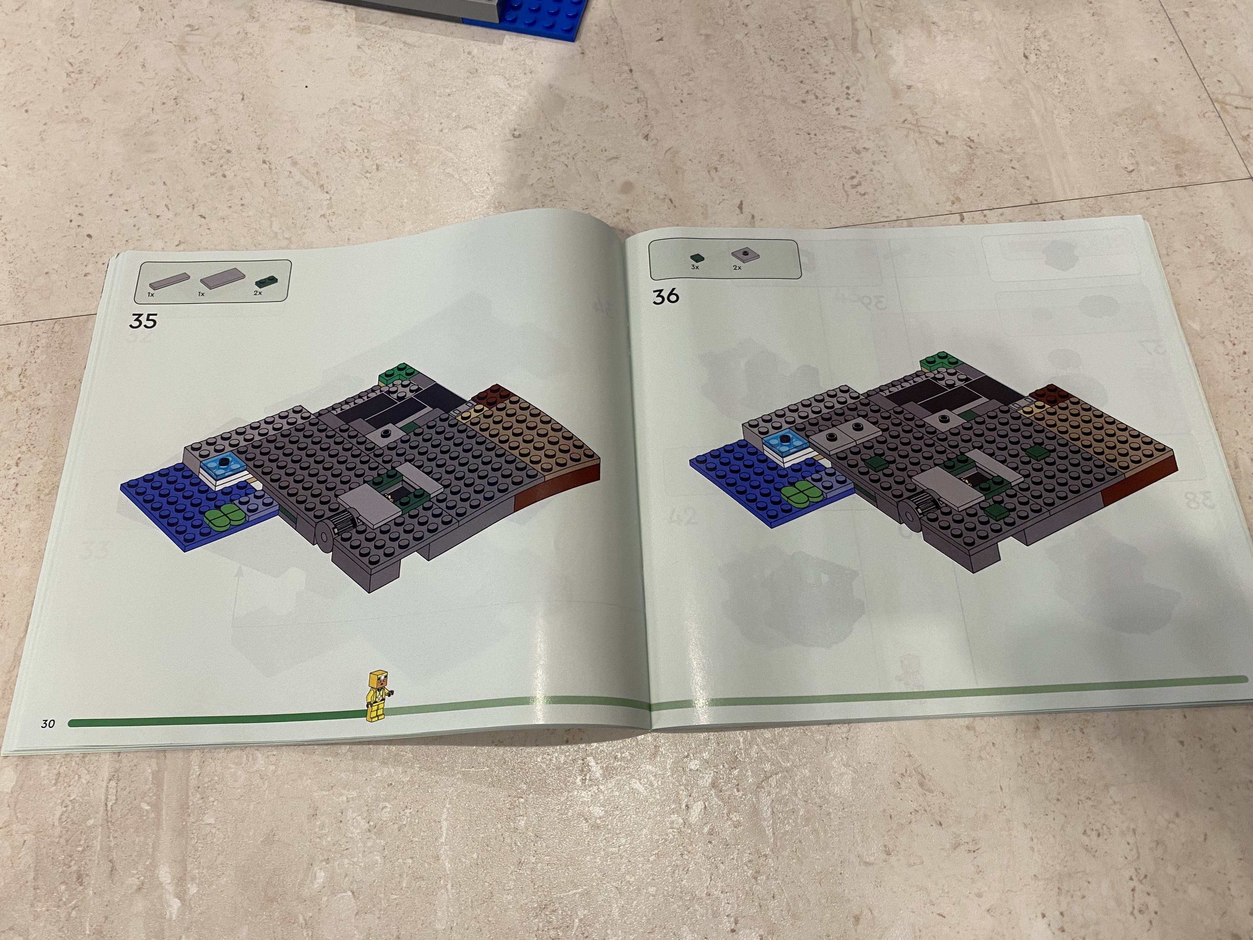 20분 정도 열심히 조립하다 보니 벌써 1번 봉지에 들어있는 블럭들이 조립 완성되었습니다. 옥스포드 블럭과 레고블럭 두 가지를 직접 비교해 볼 수 있었는데요, 일단 마인크래프트 레고 사이즈가 작아서 장군성과 1:1 비교는 조금 힘들 수도 있지만 최대한 거품을 빼고 비교해 보자면 블럭 조립을 하는 데 있어서 아이가 하기엔 옥스포드 보다는 레고가 블럭 끼우기와 분리하기가 쉽습니다. 설명서를 열심히 보고 만들지만 아이들은 한 번에 조립이 힘들어 끼웠다 분리했다 반복하는 경우가 자주 발생하는데 레고 블럭이 확실히 힘이 덜 갑니다. 두 번째로 레고블럭이 옥스포드 블럭보다 블럭 조립에 있어 설명서와 함께 매우 잘 구분되어 있습니다. 1번, 2번, 3번 번호가 쓰여 있는 순서대로 블럭 조립을 진행하면 되어서 이것저것 고민할 필요가 없답니다. 옥스포드 장군성은 블럭 크기가 커서 그런지는 몰라도 설명서에도 자세히 나와 있지 않고 1번, 2번, 3번 순서대로 진행하지도 않아서 조립하는데 무척 애먹었던 기억이... 그래서 같은 8세 이상 블럭이라도 처음 접하는 친구들에겐 옥스포드 보다는 레고 제품을 추천합니다. 저희 집 아들은 그동안 블럭도 만들었지만 프라모델도 이것저것 해보면서 설명서 보는 법, 부품 찾는 법 같은 스킬을 많이 업그레이드해서 이번 레고 마인크래프트 블럭 조립은 아빠의 도움이 거의 없이 대부분 본인이 직접 설명서를 보고 만든 레고 블럭되겠습니다. 왠지 모를 뿌듯함이... 뿜뿜~~!! 어린이날 선물로 강추해 봅니다^^