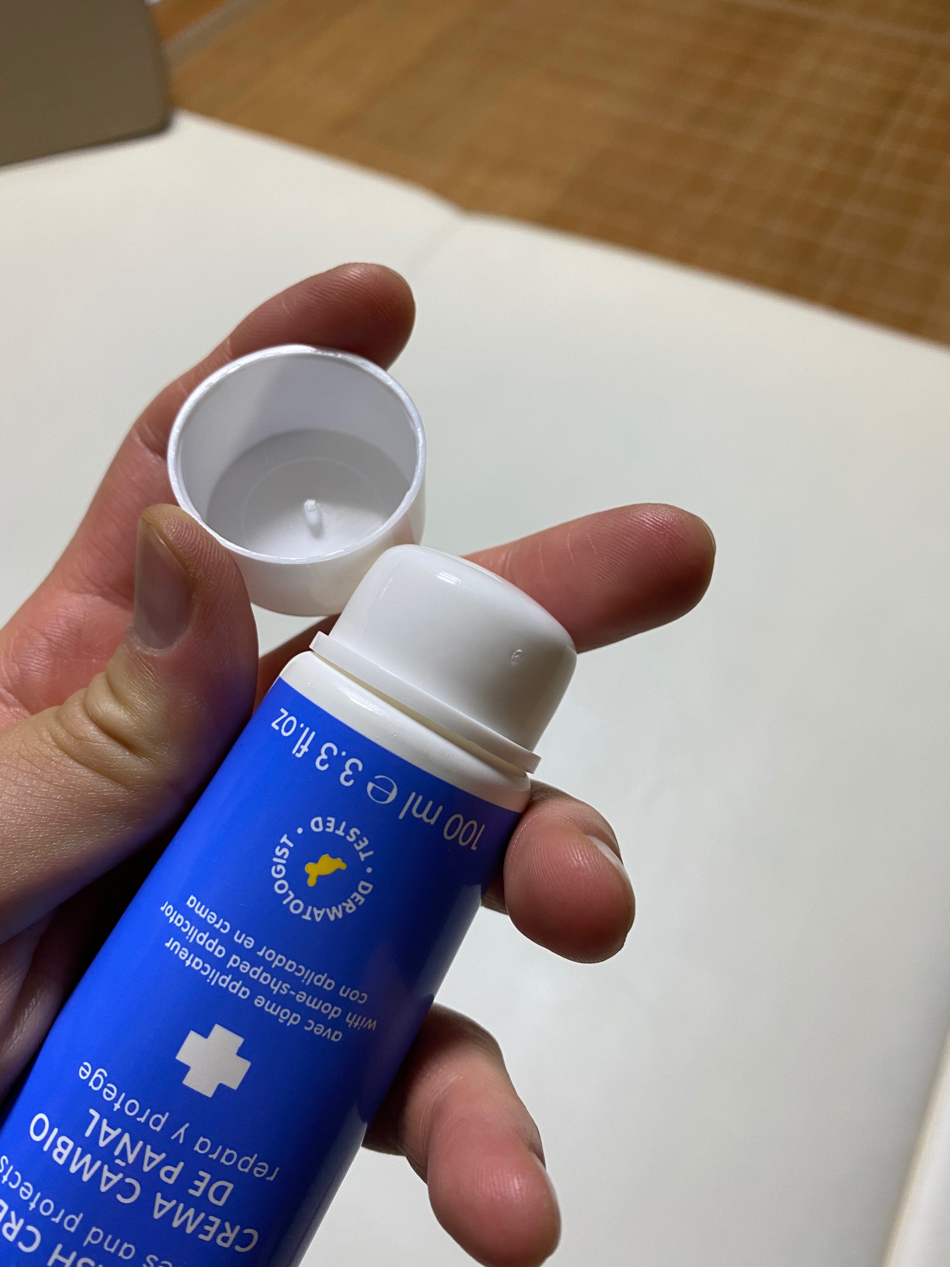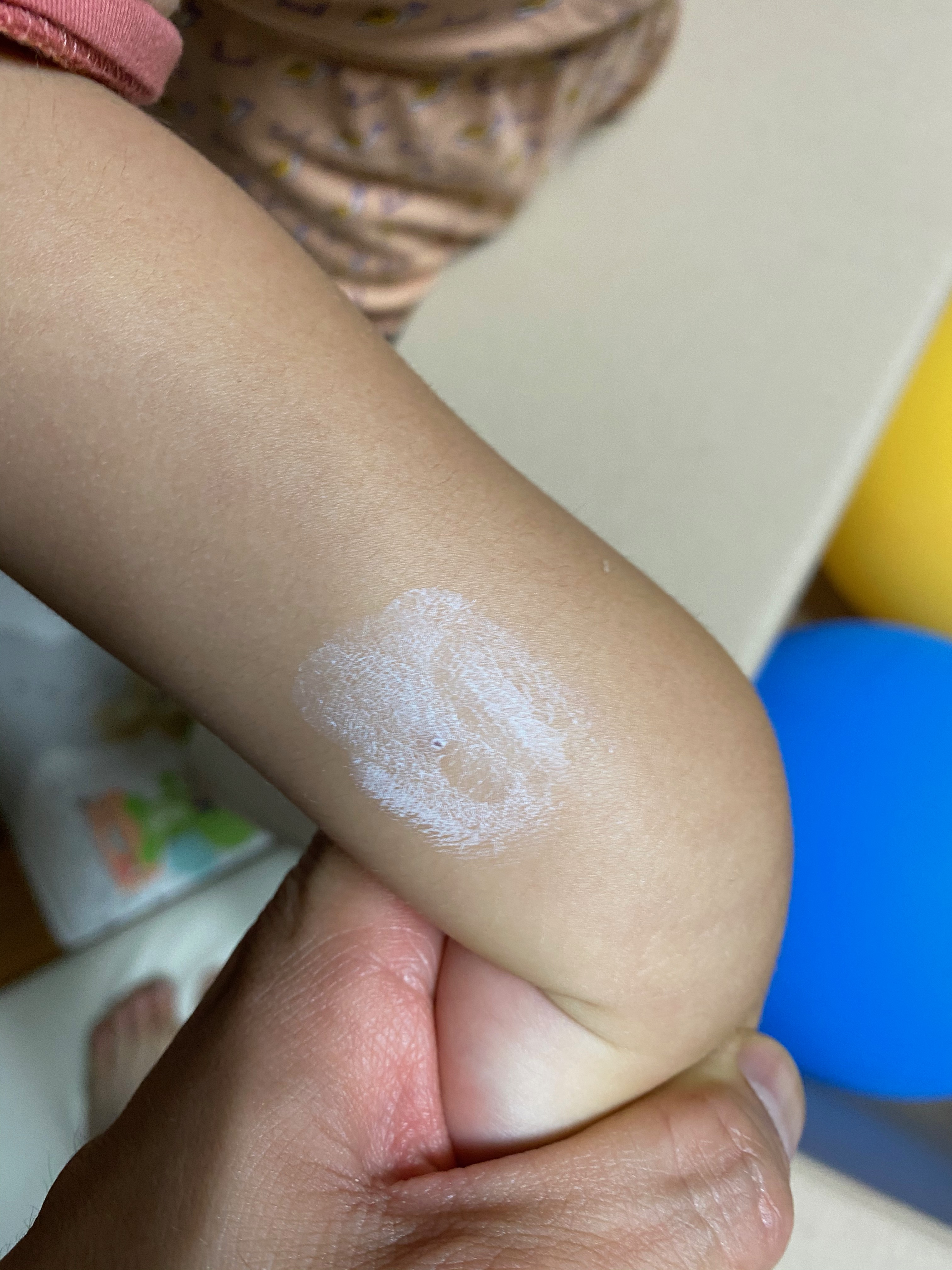 흰색 아주 뻑뻑한 크림이 조그만 구멍 사이로 삐질삐질 올라오더군요. 살짝 덜어 아들 가렵다는 부위에 콕콕콕 찍어 바르듯 발라줬습니다. 다 바르니 마치 베이비파우더를 매우 찐하게 발라준 듯한 느낌이 났어요. 아들 피부에 테스트 완료하고 열심히 몫 주변과 가슴, 어깨, 등판까지 골고루 손 닿는 곳 정성스레 발라주었죠~