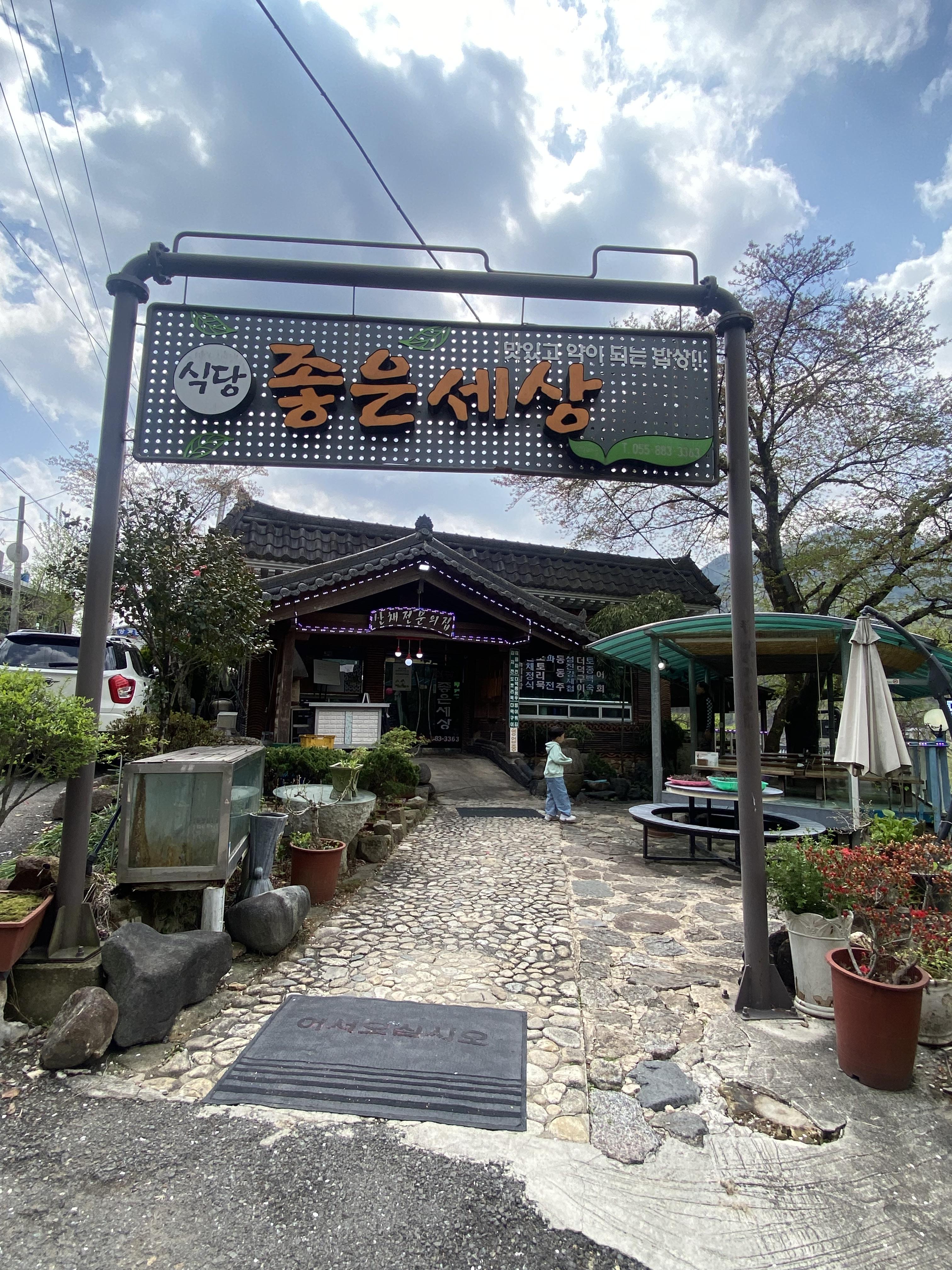 하동~사천 가족여행 아홉 번째 스토리는 바로 맛집 소개 시간 되겠습니다. 쌍계사 구경하고 나오니 배가 꼬르륵~~! 점심시간이 다 되었다는 신호가 열심히 울립니다. 급히 근처 맛집을 검색해 보니 역시 지리산 자락이라 신선한 나물이 메인 밥상에 오르는 음식들이 많습니다. 그중에서 쌍계사를 하산하면 제일 첫 번째 식당인 '좋은세상 식당'에 가기로 했지요.