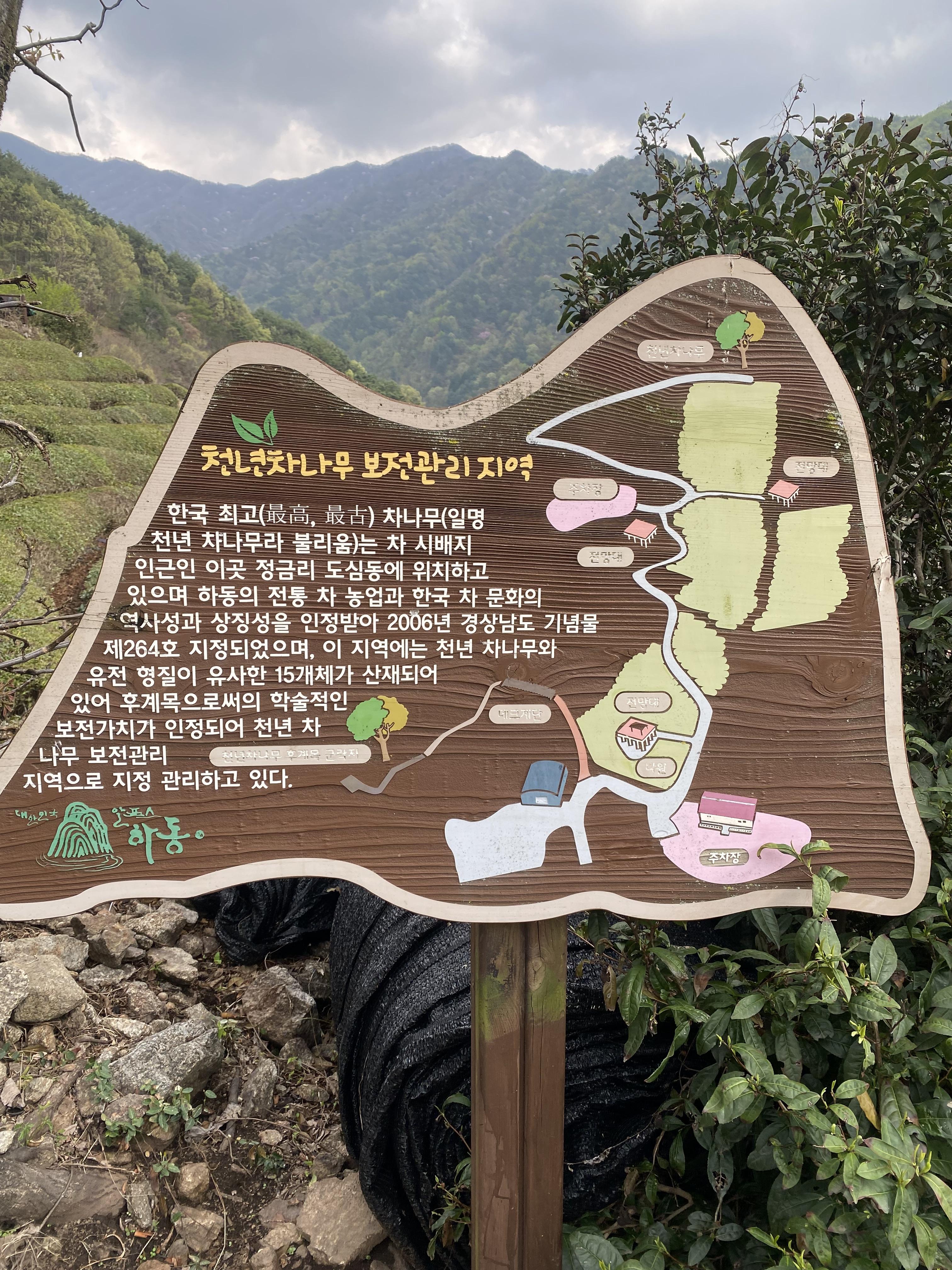천년차나무가 있는 곳은 요렇게 조성되어 있고요, 꼭대기에서 바라다본 아래 풍경은 그 어떤 카메라로도 담을 수 없는 뷰가 펼쳐집니다. 그냥 포기하고 눈으로 가슴으로 담아 갔지요. 그런데 말입니다. 천년차나무가 있다는 곳에 도착해서 안내 표지판을 열심히 읽어보니 아쉽게도 2012년인가 13년인가에 냉해 피해를 입고 그만 천년차나무는 죽고 후손(?)들이 그 자리를 지켜나고 있답니다. 이거 이거 뭔가 속은 기분이.... 산 중턱에 표지판만 자세히 더 읽어 봤어도 후계목들이 산재해있다고 하는데..... 이런 거 자세히 읽는 사람 누가 있습니까? 그냥 솔직하게 천년차나무는 고사했고 후계목들이 그 자리에 대신하고 있다고 첨부터 안내가 되어있다면 좋았을 텐데 말이죠. 그래도 힘들게 도심다원 차밭 맨 꼭대기까지 올라가서 전체 뷰를 감상하는 건 나름 괜찮았습니다. 궁금하신 분들은 직접 경험해 보시는 걸 강추!!! 하동 여행으로 괜찮은 장소네요^^