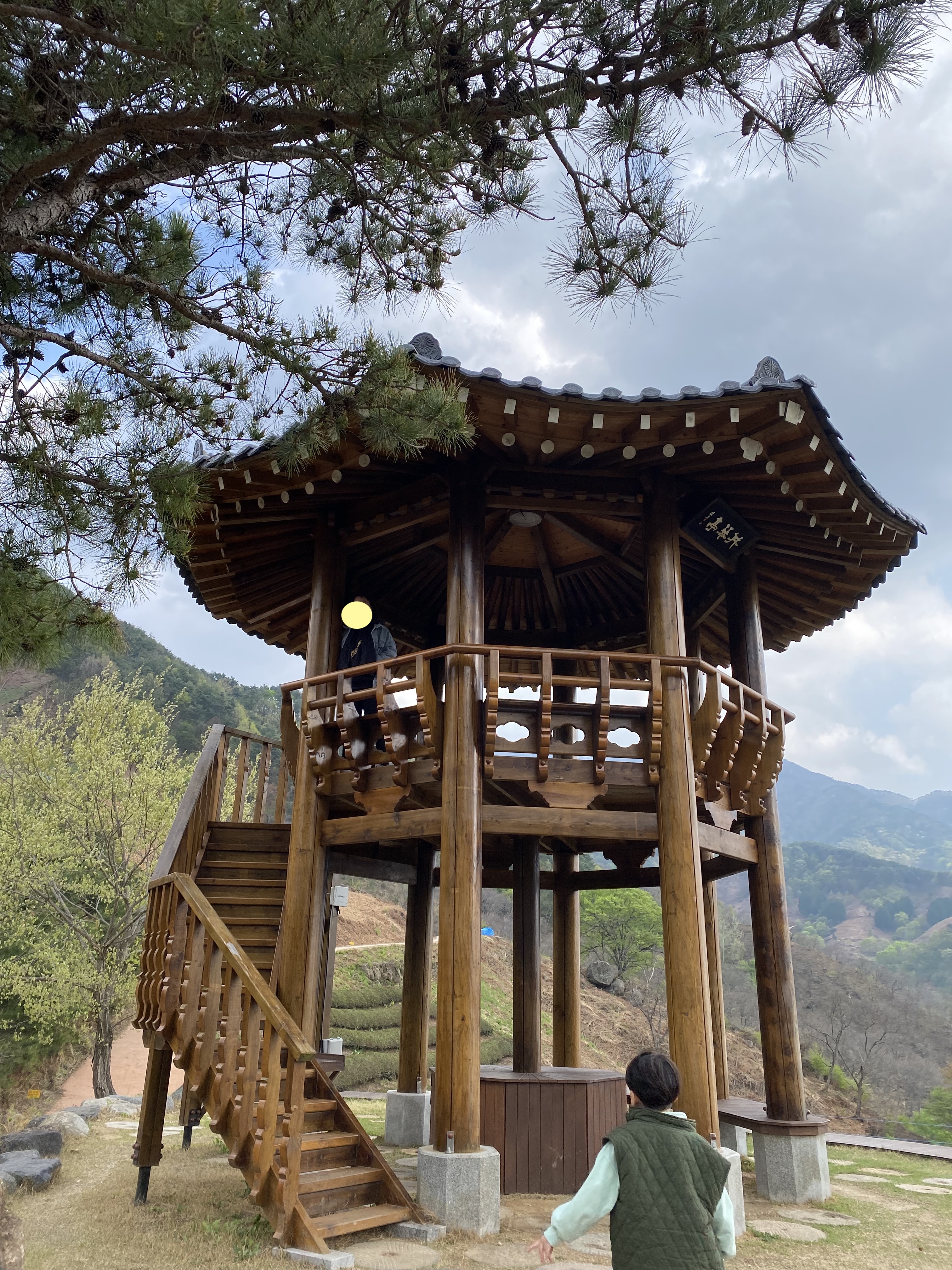하동~사천 열한 번째 스토리 시작합니다. 막바지로 접어든 여행 후기인데 오늘 글은 도심다원을 방문하고 나서 그 이후로 이어지는 스토리입니다. 도심다원 차밭 전망대에서 전체 뷰를 즐기다 보면 왼편 산봉우리가 끝나는 지점에 정자 같은 게 보입니다. 아래 사진을 보면 거의 티가 안 나는데 직접 눈으로 보면 정자 같아 보이는 곳입니다. 산 능성을 따라 차량도 간간이 지나가는 모습을 보기도 했죠. 전망대에서 뷰를 감상하던 도중 부부가 일심동체라 같이 궁금증이 생겼답니다. 저기가 도대체 뭐꼬??? 뭔데 저리 사람들이 넘어갈꼬? 도심다원 카페로 다시 복귀해 스텝에게 물어봤습니다. 뭐냐고~ 다름 아니라 마을을 가로질러 저쪽으로 갈수 있는데 개인 녹차밭에 정자를 만들어 놓은 거라고 합니다. 정식 명칭은 정금차밭 정자!