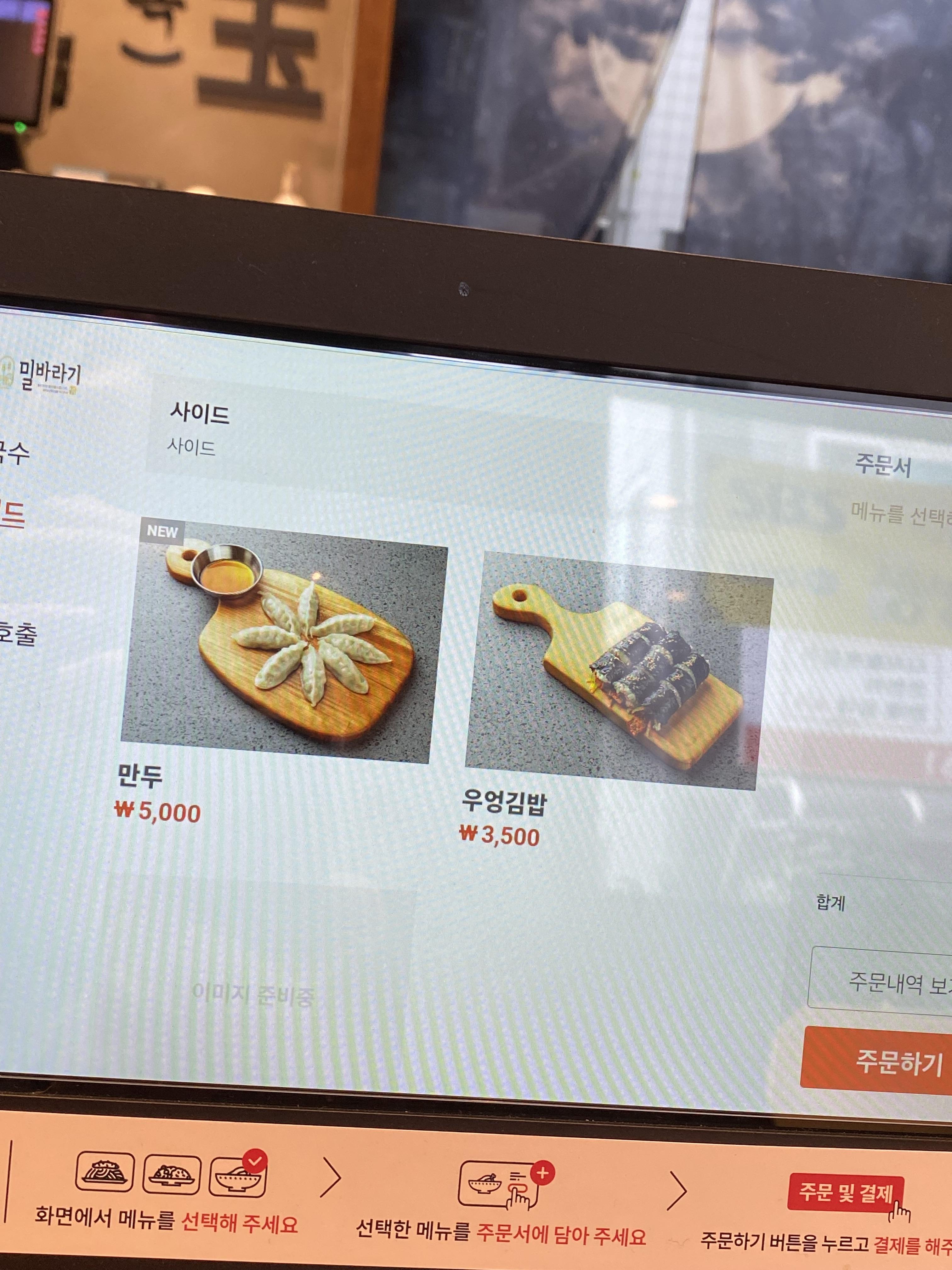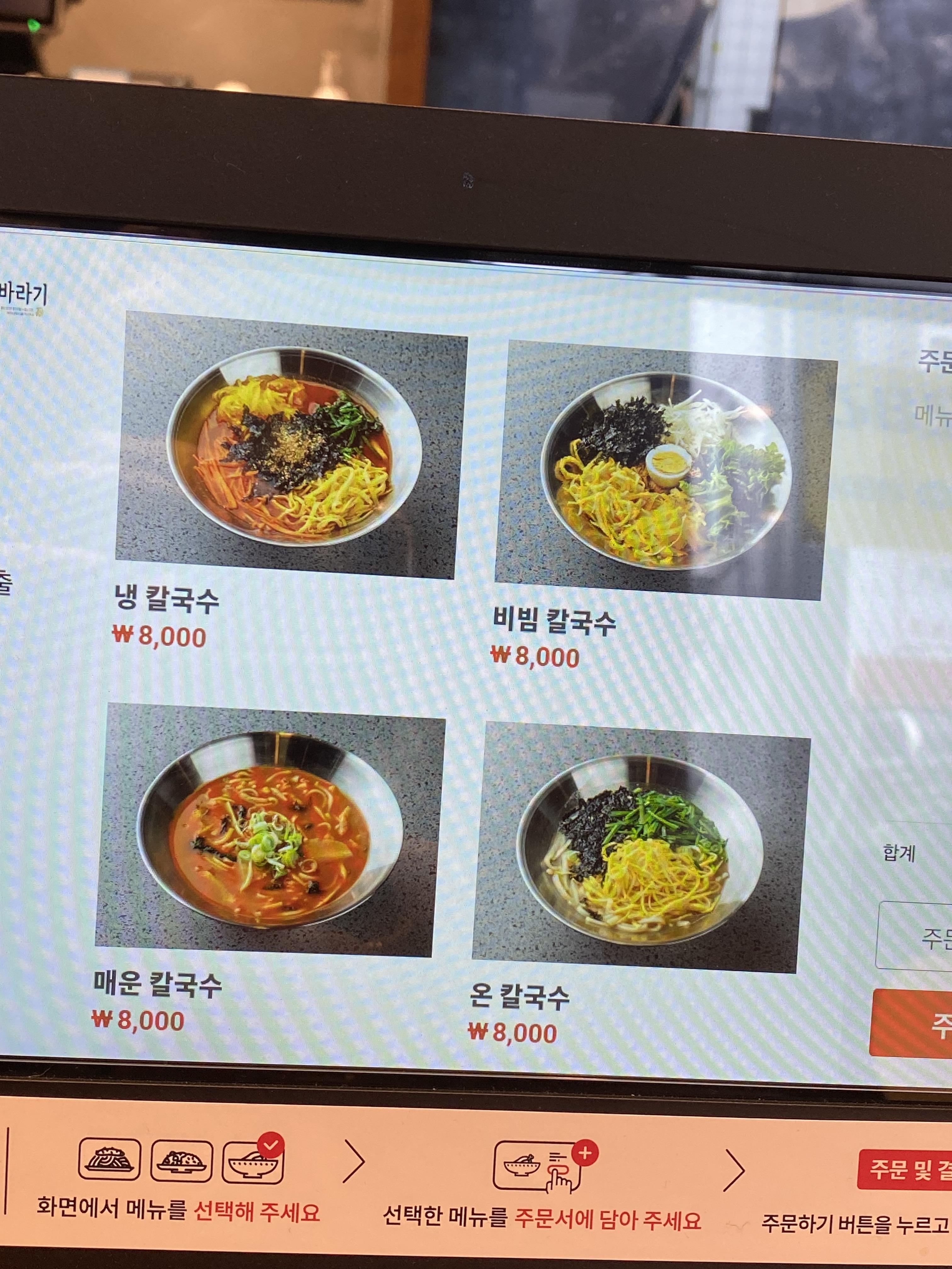 메인 네 가지, 사이드 두 가지 그 외 음료수로 종류가 단출해서 선택하는 데 고민을 덜어주는 구성으로 입맛이 다들 맵찔이라 매운 칼국수 빼고 나머지 하나씩 주문해서 맛을 보기로 했습니다.