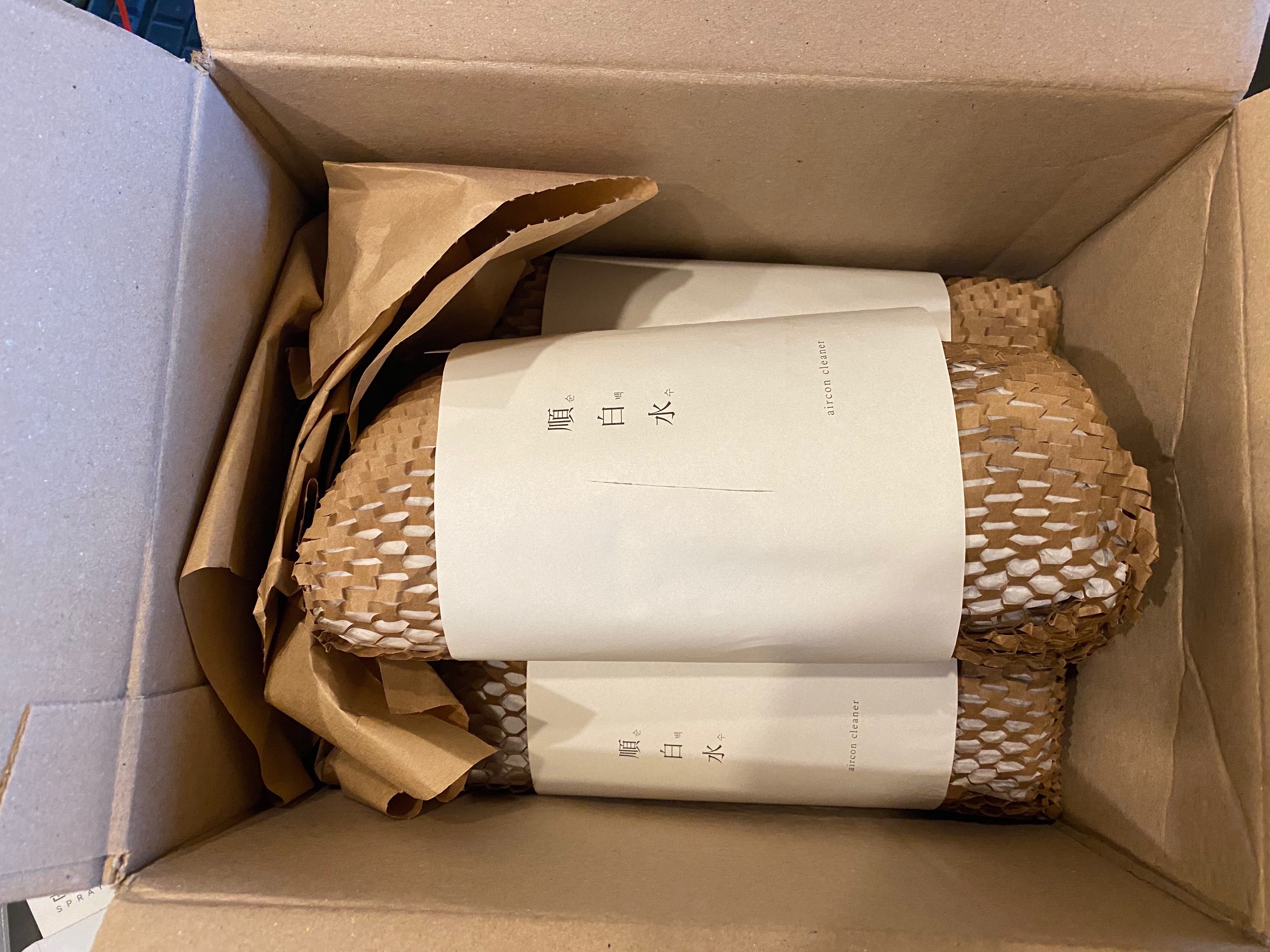 요즘은 냉난방 겸용 제품들이 대세가 된 거 같습니다. 한여름엔 더워서 에어컨을, 한겨울엔 추워서 히터를 켜는데 일 년에 거의 절반을 이런 냉난방 겸용 제품을 사용하게 됩니다. 문제는 이렇게 장시간 사용하게 되면서 내부 청소를 하는 일이 예전보다 잦아졌다는 점인데요, 청소 전문 업체에 맡기면 편리하고 깨끗하게 구석구석 청소를 해준다는 장점이 있지만 비용이 너무 많이 들어 부담이 된다는 점이지요. 저도 학원에 냉난방 제품이 3대에 에어컨 전용 2대 총 다섯 대의 제품들이 있어서 그거 일 년에 한 번씩만 맡겨도 후덜덜 하겠지요? 그래서 업체에 맡기는 것보다는 자주 청소해 주는 것으로 대신하고 있는데요, 에어컨 청소 제품으로는 초창기에 스프레이 분사식 제품들이 많이 유통되었고 지금도 많이 사용되고 있는 제품인데 문제는 요런 제품들은 강력한 세제 성분들이 들어 있고 가격 또한 한 캔에 보통 2~3천 원 정도 한다는 겁니다. 일 년에 한두 번 정도 청소를 하면 모를까 월 2회 이상 사용을 한다면 요것 또한 가격 부담이 되는 거랍니다. 또 거기에 따른 재활용 쓰레기들이 많이 나오니 이래저래 알뜰 살림에는 도움이 안 되겠죠? 그래서 청소도 맘껏 자주 할 수 있고 사용 후 우리 몸도 헤치지 않는 그런 제품을 찾아봤습니다. '순백수 에어컨 클리너'라는 제품이 눈에 들어왔고 저는 자주 청소를 해야 해서 1리터 3개 제품을 구입했지요. 가격은 4만 원대였던 거 같습니다. 이제부터 언박싱 해보도록 하겠습니다.
