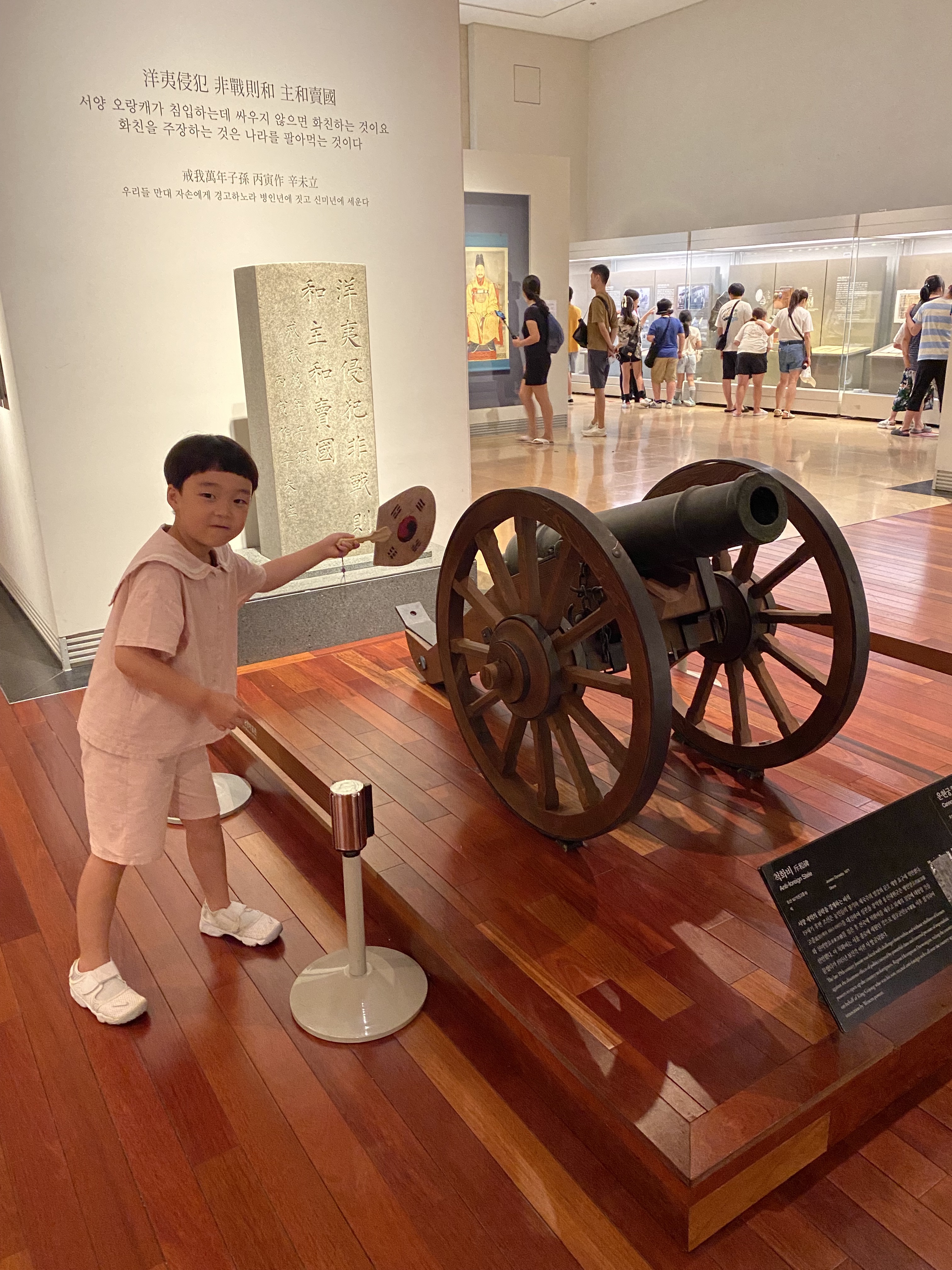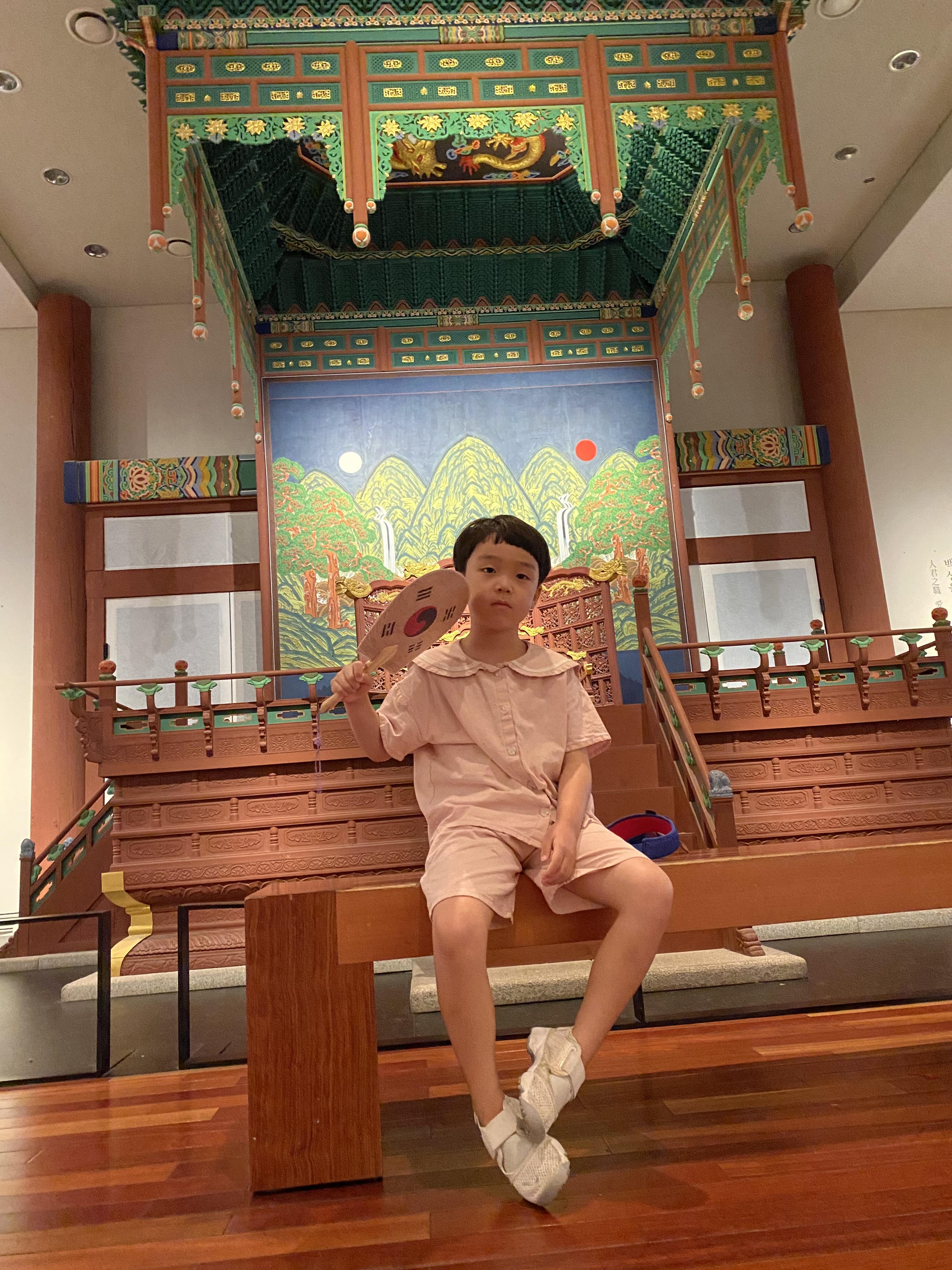 보고 또 봤습니다. 이곳저곳 돌아가며 신기한 유물 관람도 하고 아들 혼자 아빠 핸드폰으로 사진을 마구 찍어댑니다. 식당에서 밥을 먹고 1층 관람하기 전에 들렀던 곳이 바로 굿즈샾이었는데 거기서 구입한 태극부채를 들고 조선시대 임금님이 국정을 돌보던 자리에서 포즈를 잡아봤습니다.