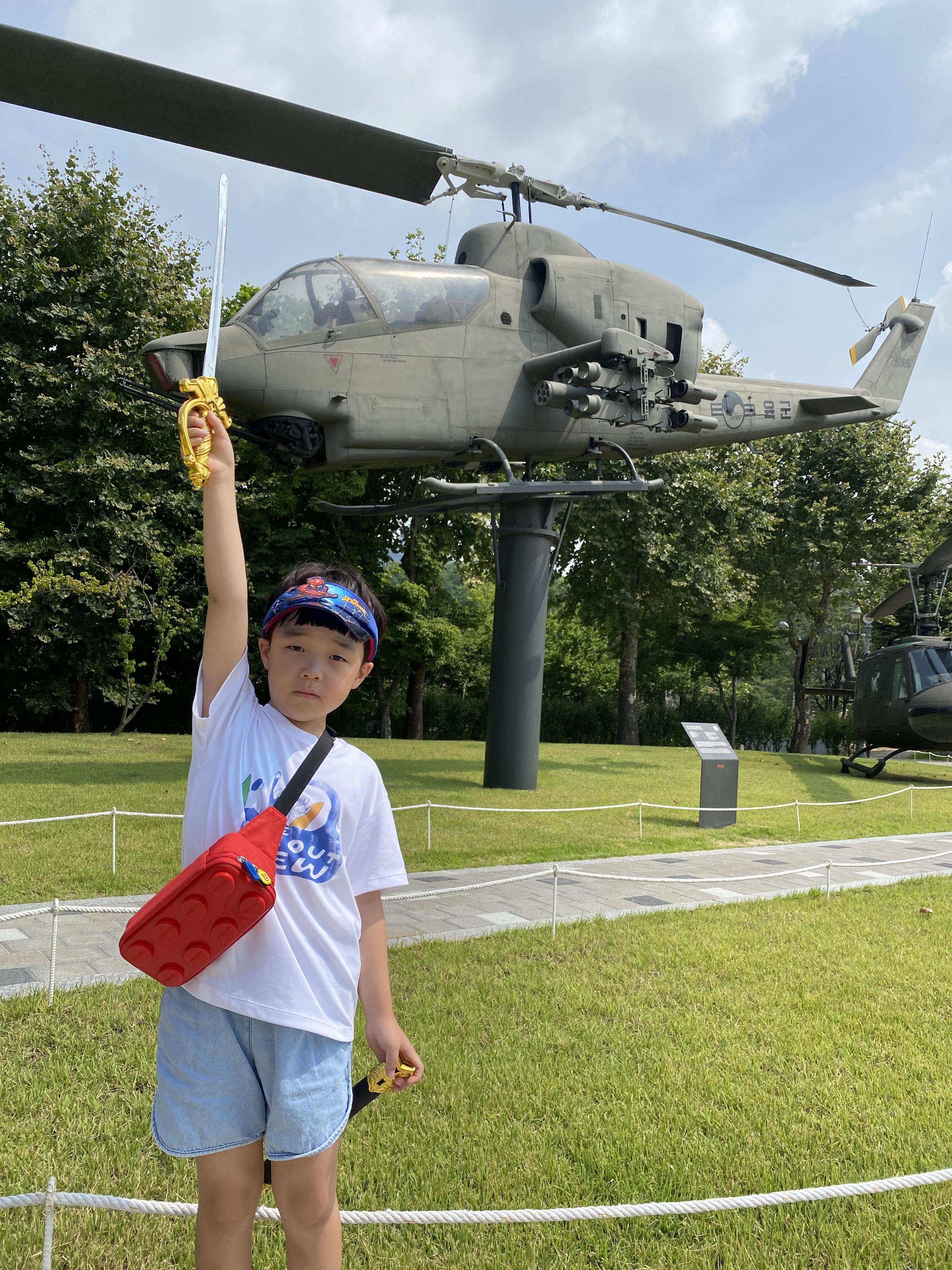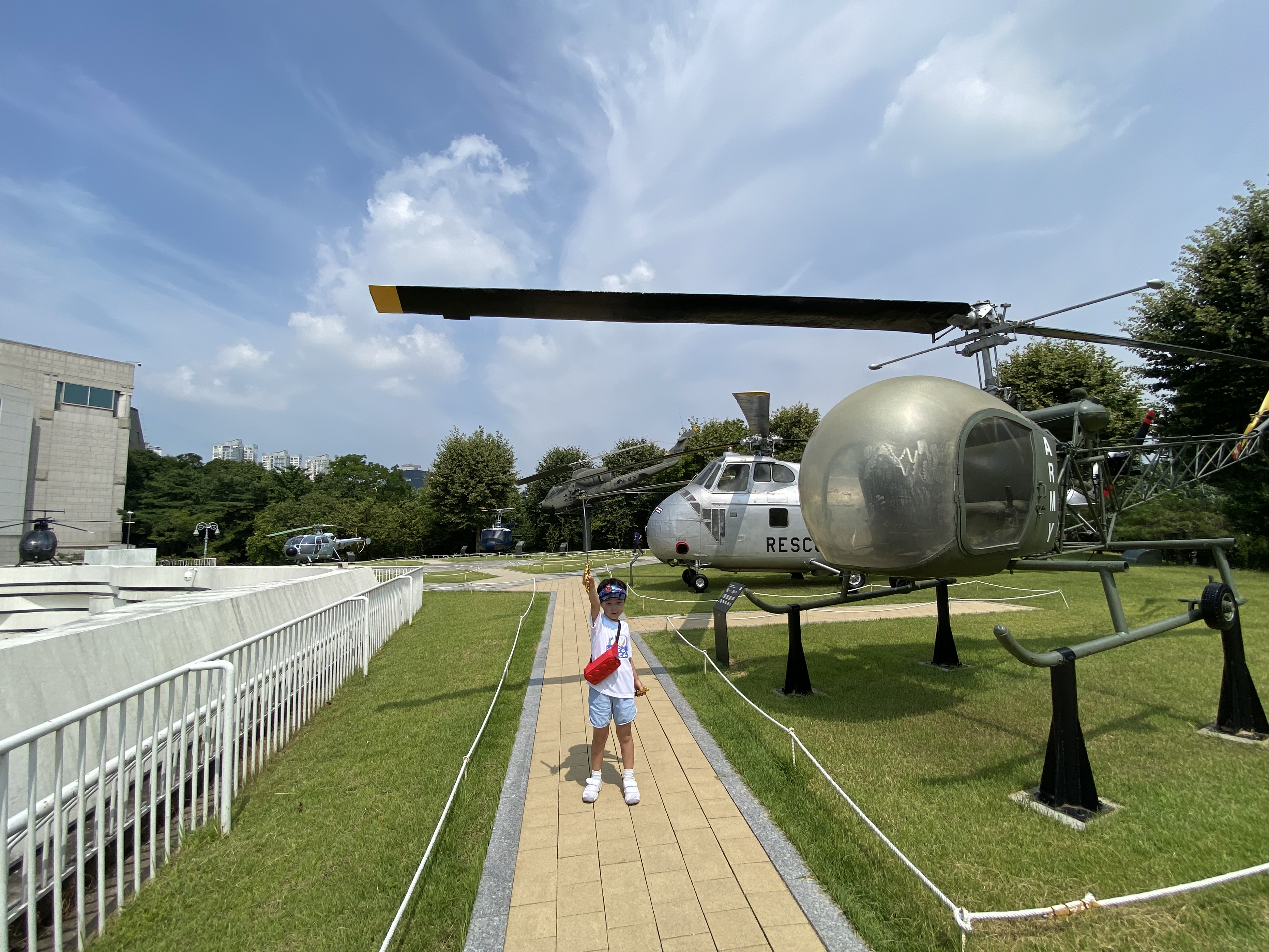 대부분 수송용 헬리콥터에 오래된 연식의 장비들만 전시되어 있었는데 그중 유독 눈길이 갔던 공격용 헬리콥터가 무척 마음에 들었나 봅니다. 아파치 헬기인 줄 알았는데 코브라 공격용 헬기라고 하네요. 어린이 박물관 실내에서 있었던 시간보다 야외에서 헬리콥터를 보는 시간이 더 길었던 거 같습니다. 오전인데도 폭염주의보가 내린 서울이라 무척 덥고 습하고 햇살이 뜨겁고 따가워서 야외에 있기가 힘들었는데 그래도 힘들어하지 않고 열심히 헬리콥터를 관람했답니다. 다음 편 전쟁기념관 나들이 후기에 본격적인 소개가 들어갈 텐데 미리 알려드리는 꿀팁으로는 여기 전쟁기념관은 옥외 전시장이 압권입니다. 어린이들이 가장 좋아할 만한 현대 무기들이 많이 전시되어 있는데 어린이 박물관 앞에 쭈~욱 전시되어 있답니다. 그래서 여기 나들이 계획을 잡는다면 어린이가 있는 가정은 무조건 어린이 박물관을 들렀다 야외 전시장 코스로 쭉~ 돌아본 다음에 전쟁기념관 실내 코스를 잡으시라 강추 드리는 코스입니다. 물론 서울 사는 분들은 다 아는 코스겠지만 지방에서 올라가는 사람들은 전혀 사전 정보가 없는 상태라 직접 가봐야 알 수 있거든요. 그래서 지방에서 올라가는 분들께 알려드리는 팁입니다. 전쟁기념관은 여기 야외 전시장만 보더라도 본전은 뽑을 거예요. 아이들은 무조건 입 떡 벌어지는 장소 되겠습니다^^