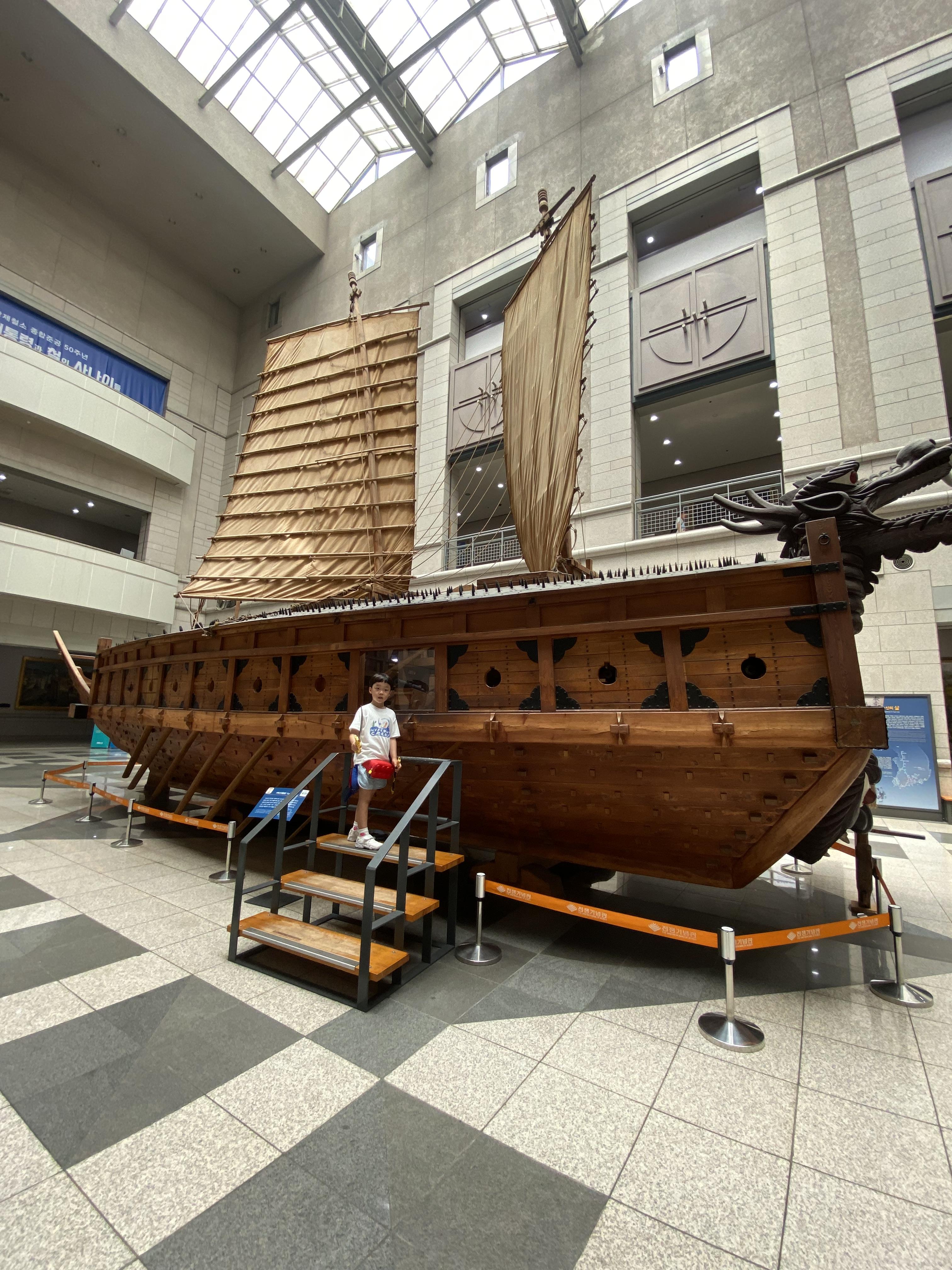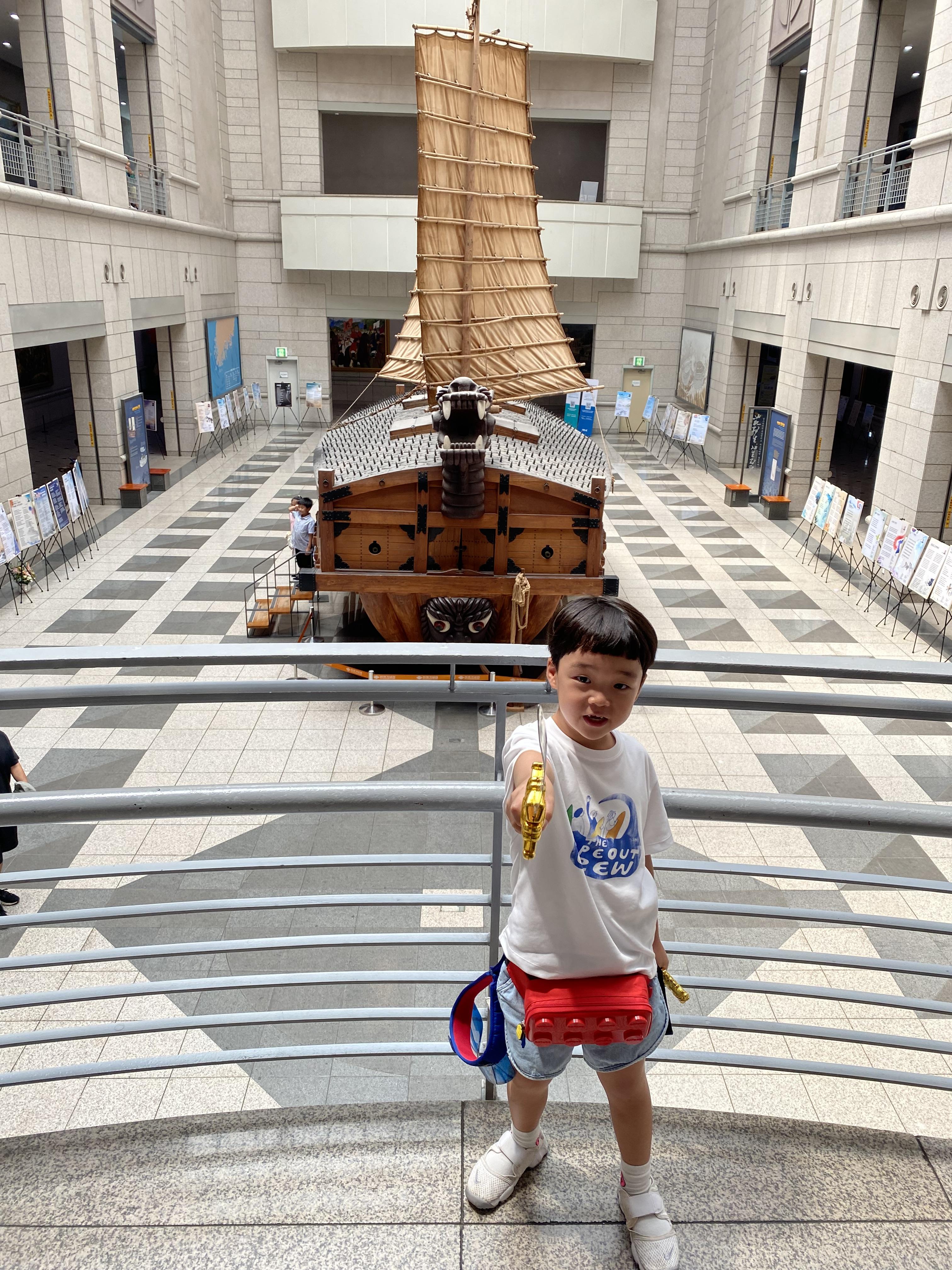 2층 양옆 사이드에 6.25 전쟁실이 마련되어 있는데 무기가 전시되어 있는 걸 겨우 꼬드겨서 관람을 하다가 중항 홀에 전시되어 있는 거북선에 꽂혀 급히 1층으로 내려가 봤습니다. 여기에는 국립 중앙박물관에서 충분히 봤던 고구려, 백제, 신라 시대 무기들이 전시되어 있었는데 거기에 또 급 관심을 가지면서 즐겁게 관람을 하는 아들이었지요.