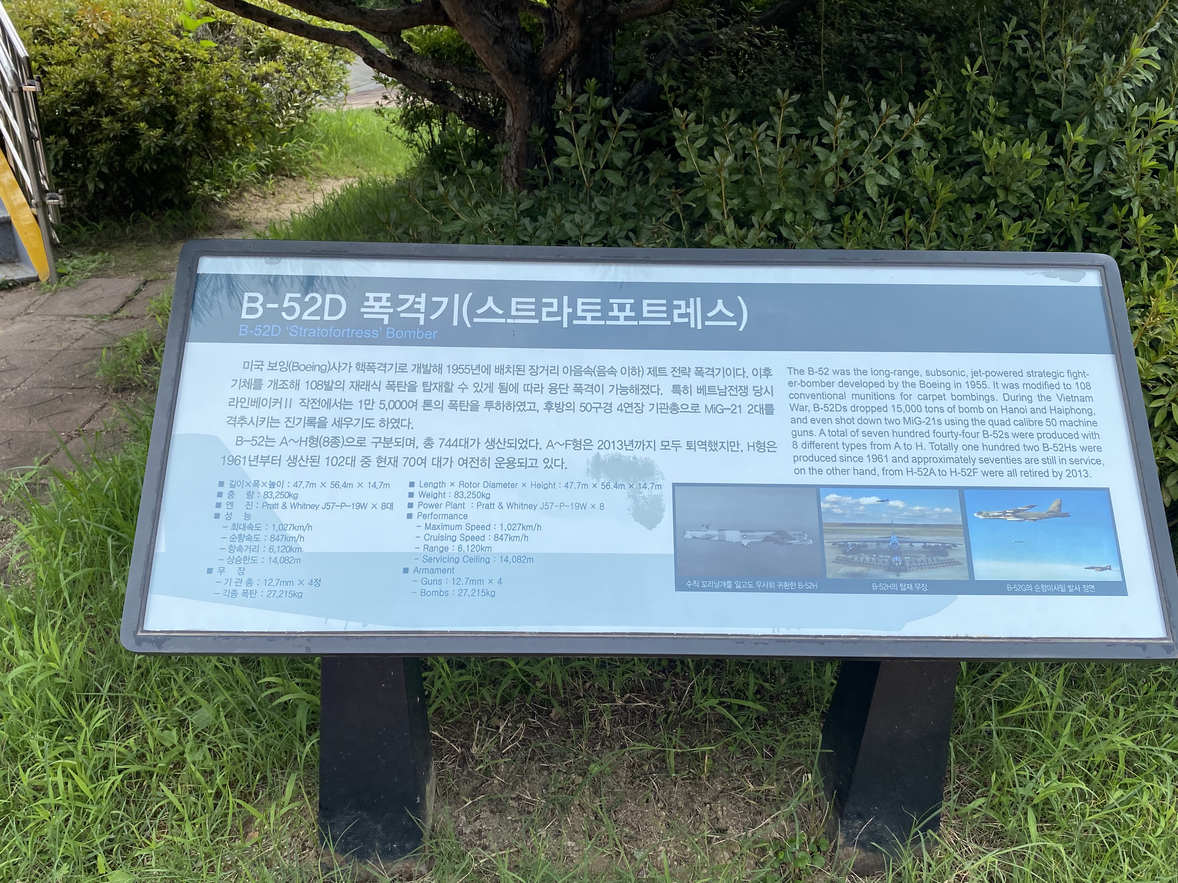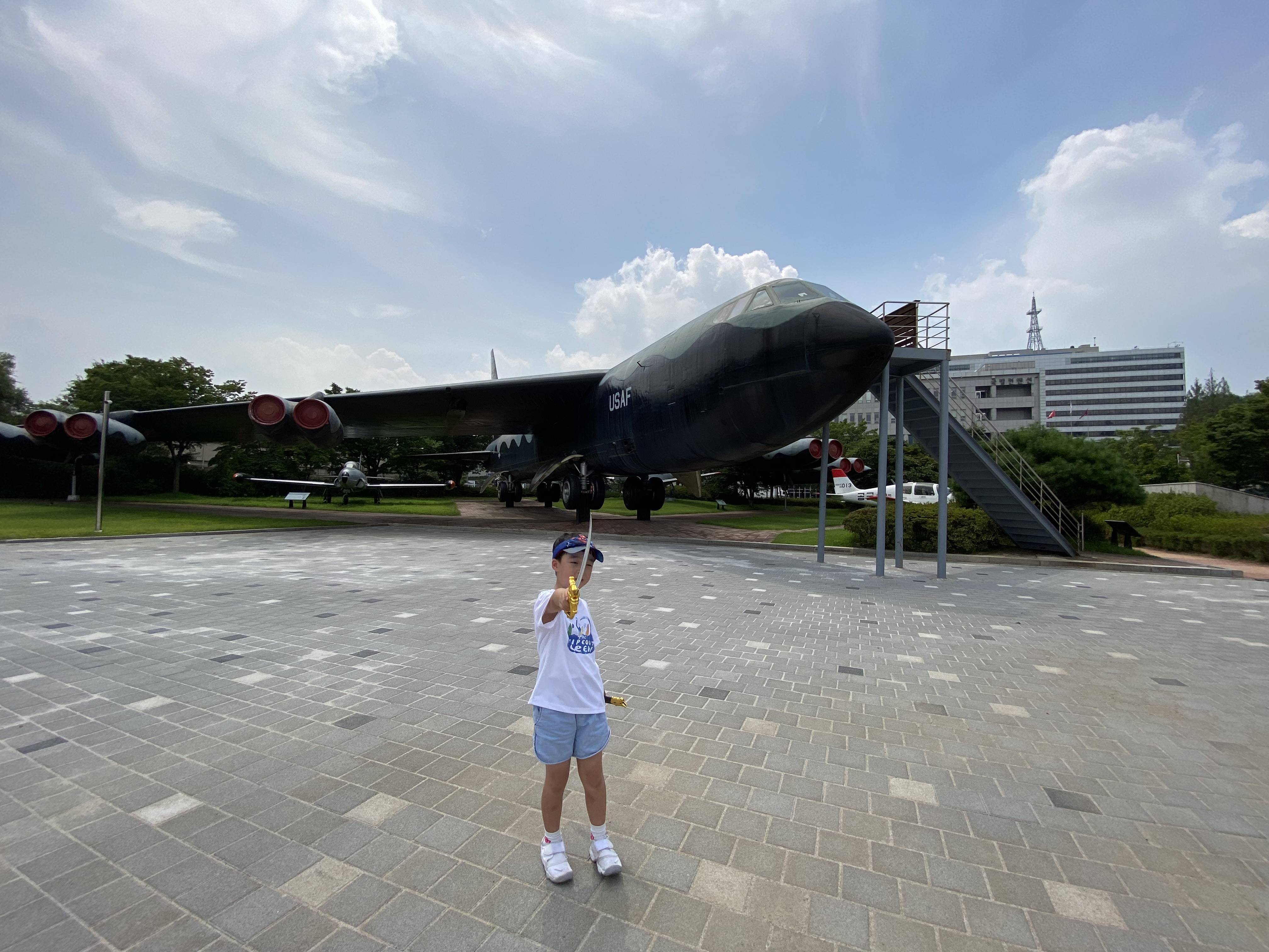 다양한 비행기도 전시되어 있지만 단연 앞권은 바로 엄청난 크기의 B-52D 폭격기입니다. 너무 커서 사진으로 다 담지는 못했지만 참수리급 전투함보다 크기가 더 컸어요. 압도적 크기랄까요? 폭격기 앞에서 한참을 관람했답니다. 전투기는 제공호가 그나마 가장 최신 버전으로 있지만 정비 중이라 가림막이 쳐져 있어 보지는 못했습니다. 그 외에도 다양한 미사일도 있는데 아들 눈에는 성에 안 찼는지 그냥 팽 당했습니다.