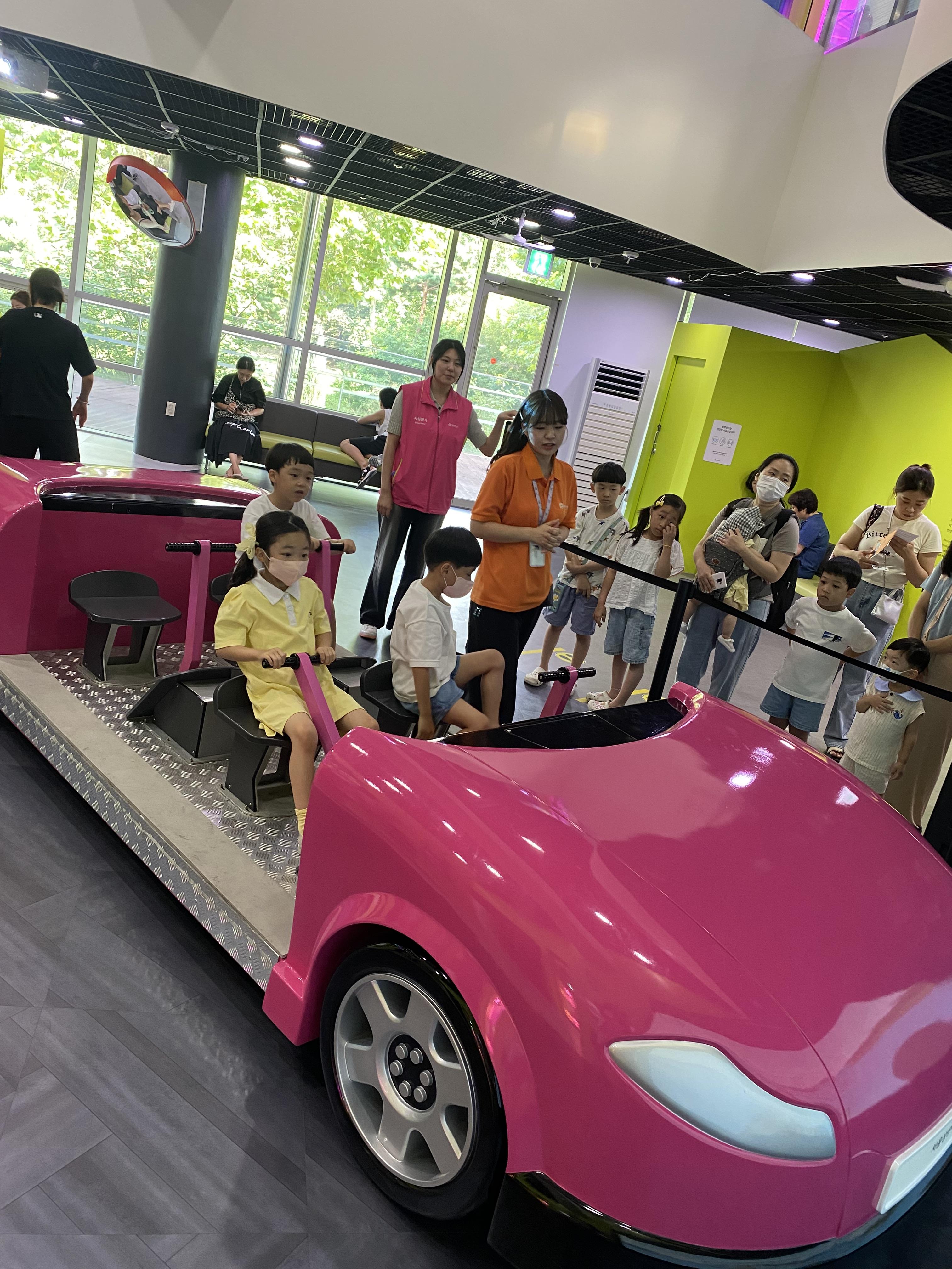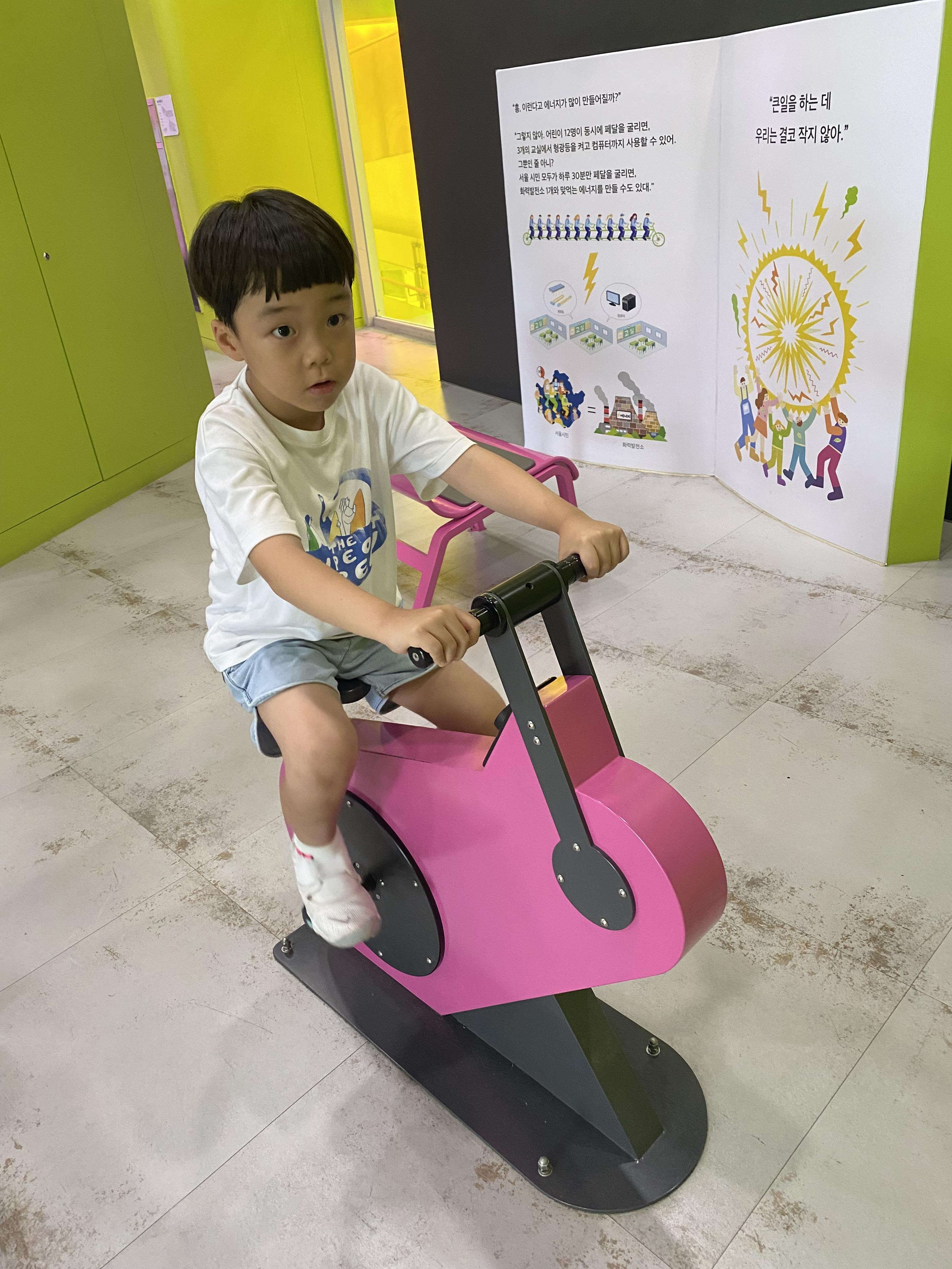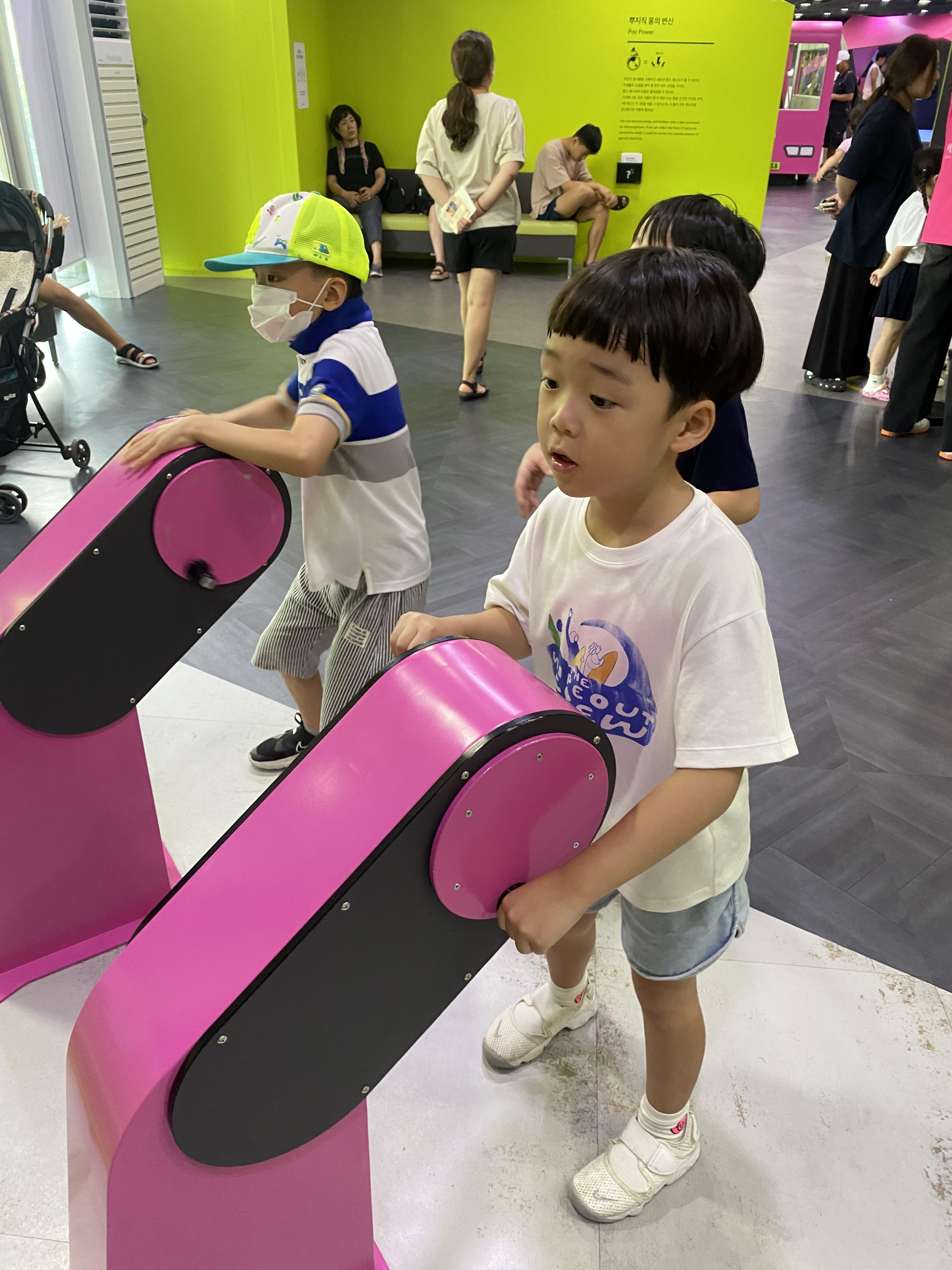 요건 자동차 체험인데 열심히 앞뒤로 당겨야 전기에너지가 충전되어서 차가 목적지까지 도달하는 그런 체험이었지요.