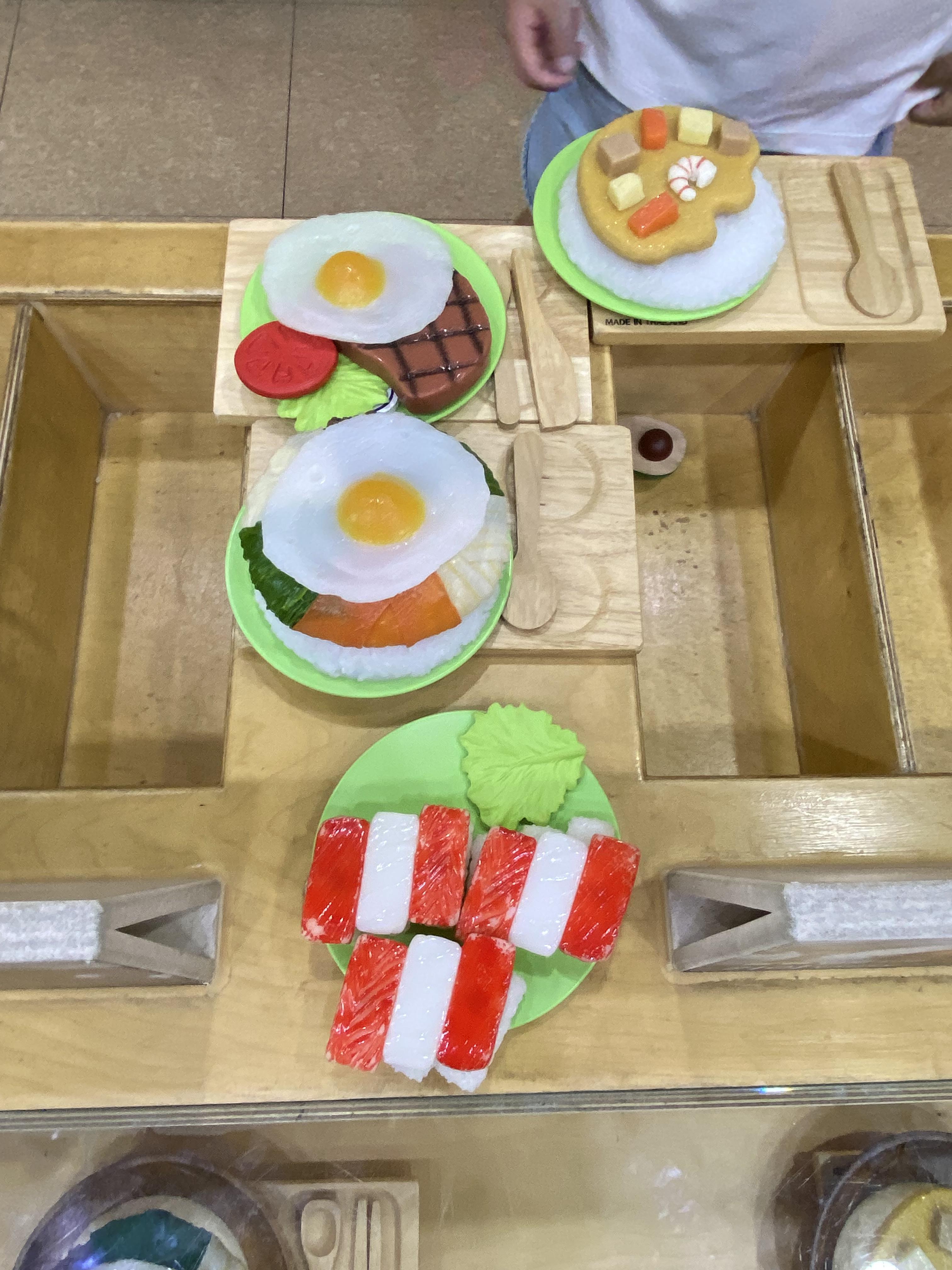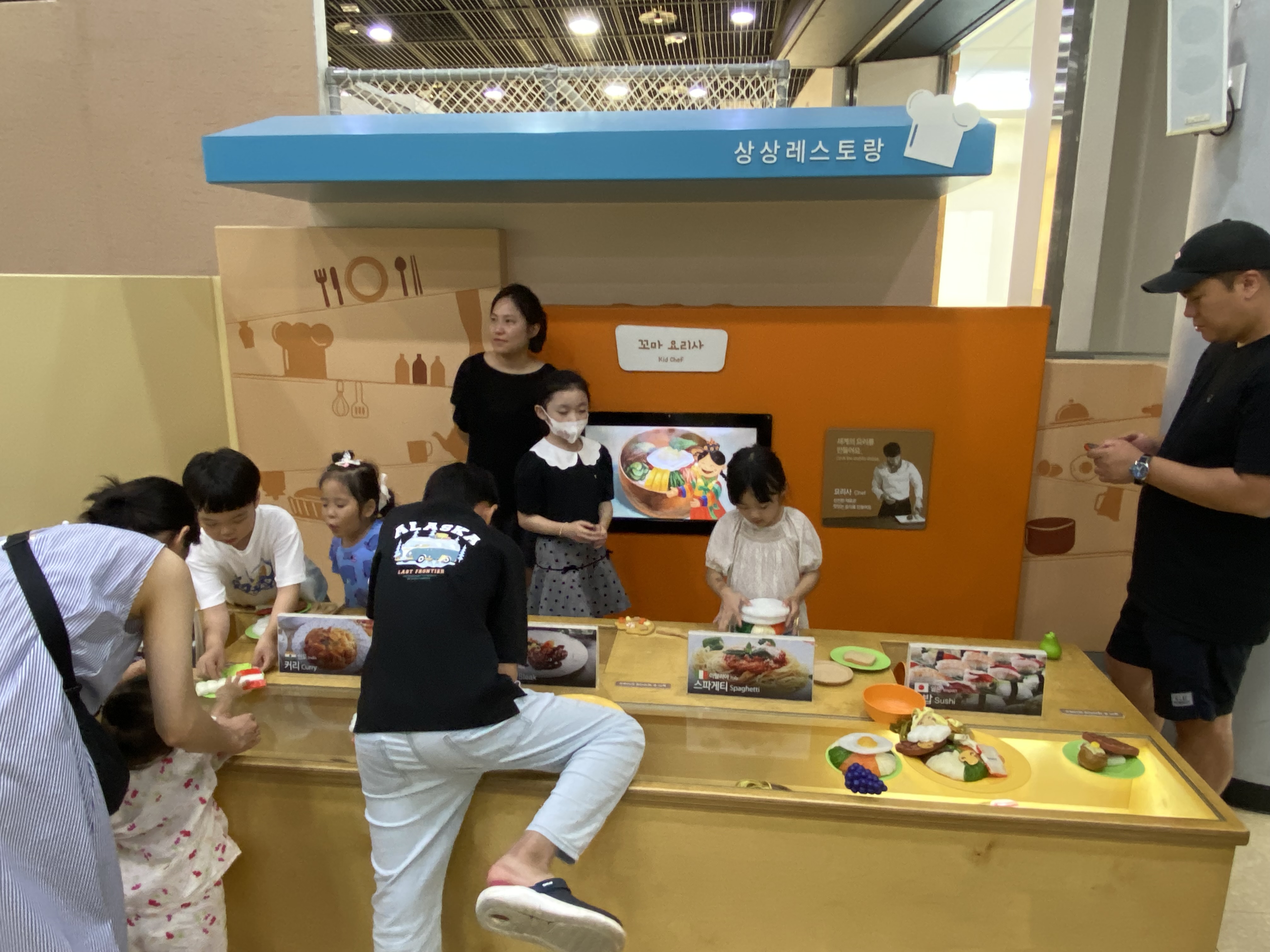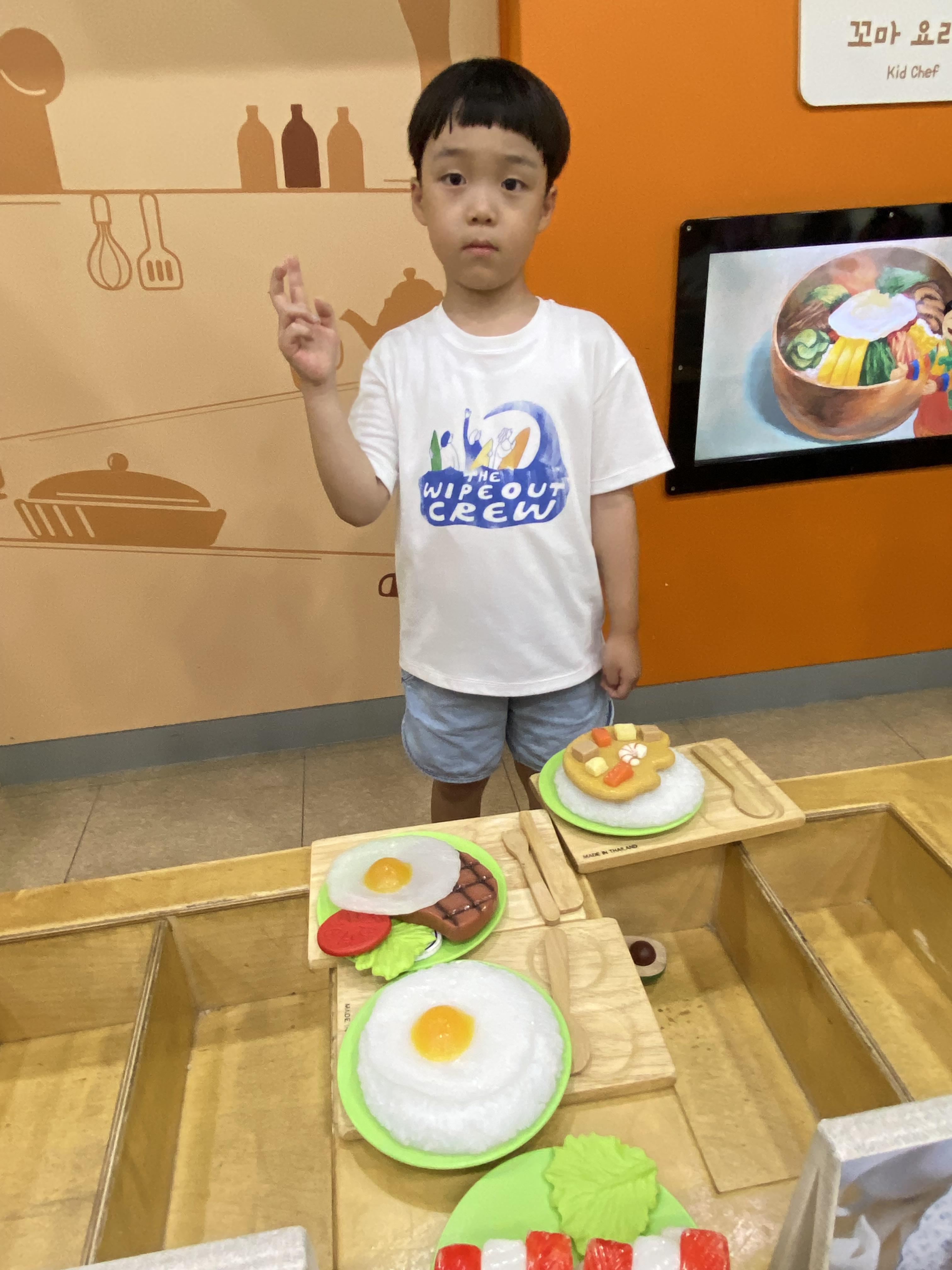 음식 소품 가지고 쉐프 체험도 해보는데요, 아들은 아빠에게 오므라이스, 초밥, 함박스테이크 등을 만들어 주셨답니다. 조금 이른 시간에 오면 지하 마당에 야외 체험 프로그램이 있으니 관심 있으신 분들은 따로 알아보시는 게 좋겠습니다. 물총 싸움도 했었고 놀이 선생님이 계셔서 다양한 놀이도 함께 했던 거 같아요.