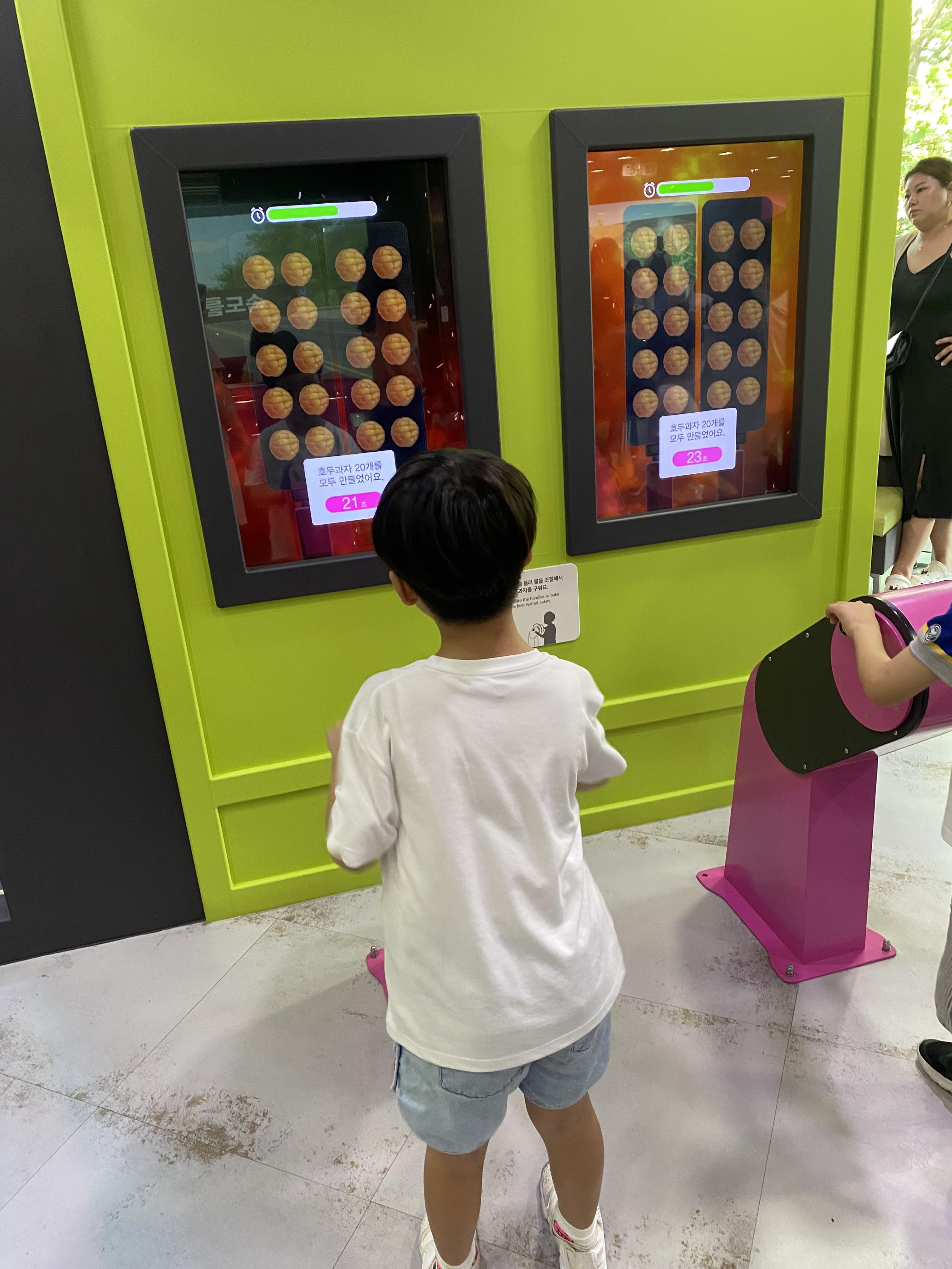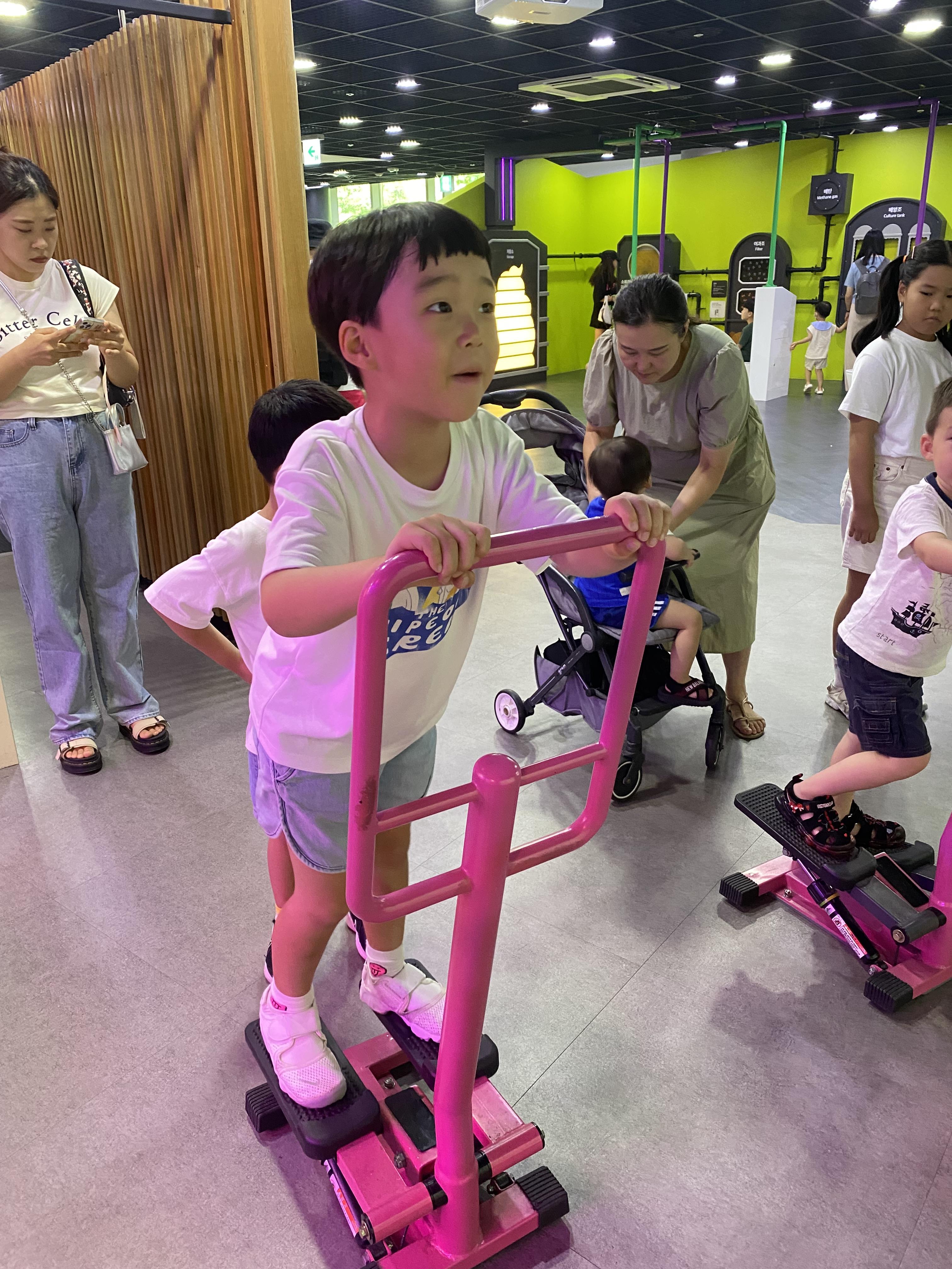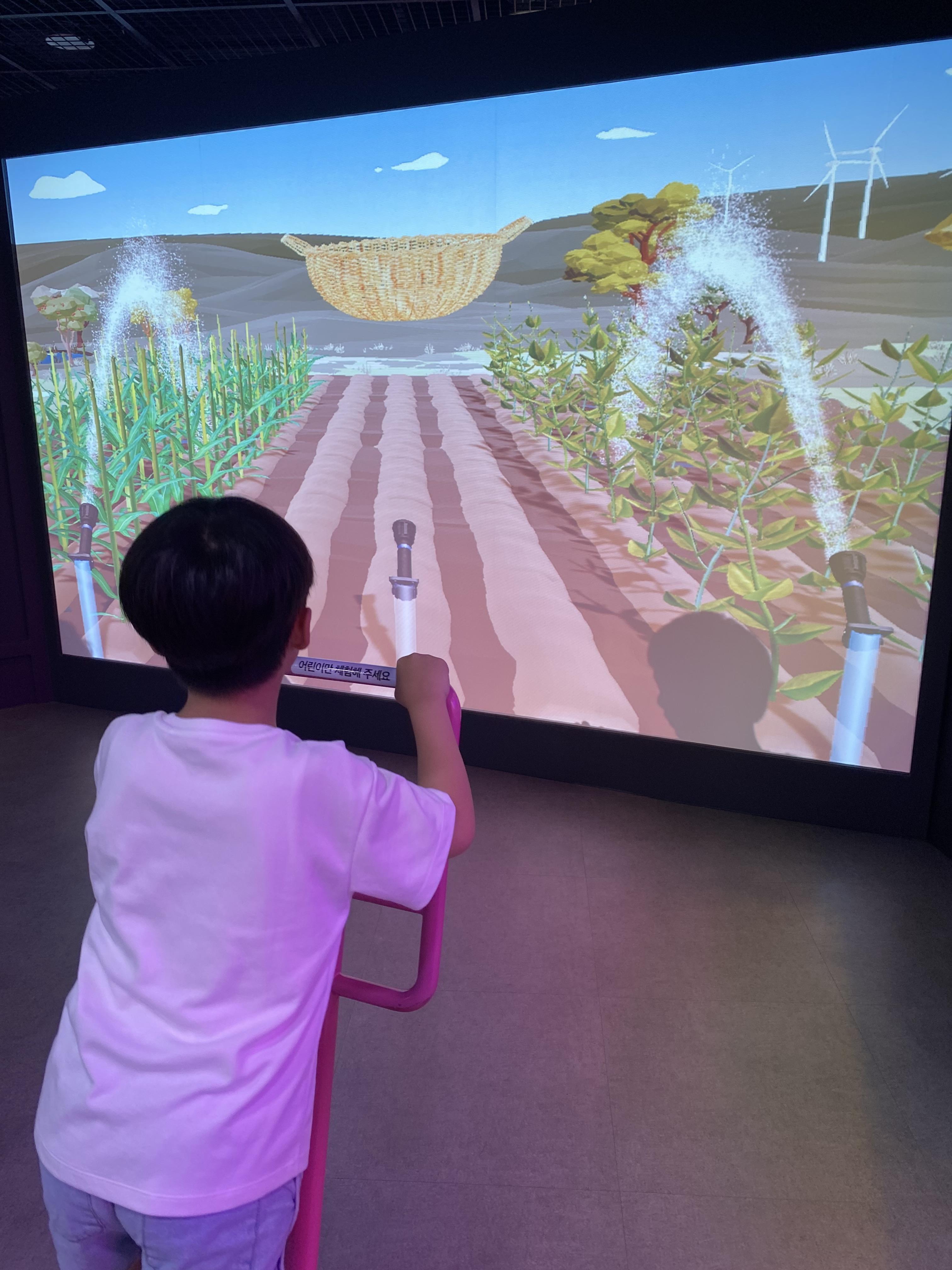 2층이 본격적으로 초등생 아이에게 즐거움과 새로운 경험을 쌓게 만드는 공간이었습니다. 몸으로 움직여 결과물을 만드는 그런 공간인데 게임적인 요소가 잘 섞여있어서 초등생 뿐만 아니라 동생들에게도 엄청난 인기 공간이었습니다. 스텝머신으로 밭에다 물을 주면 콩, 옥수수를 추수할 수 있는 게임이었어요.