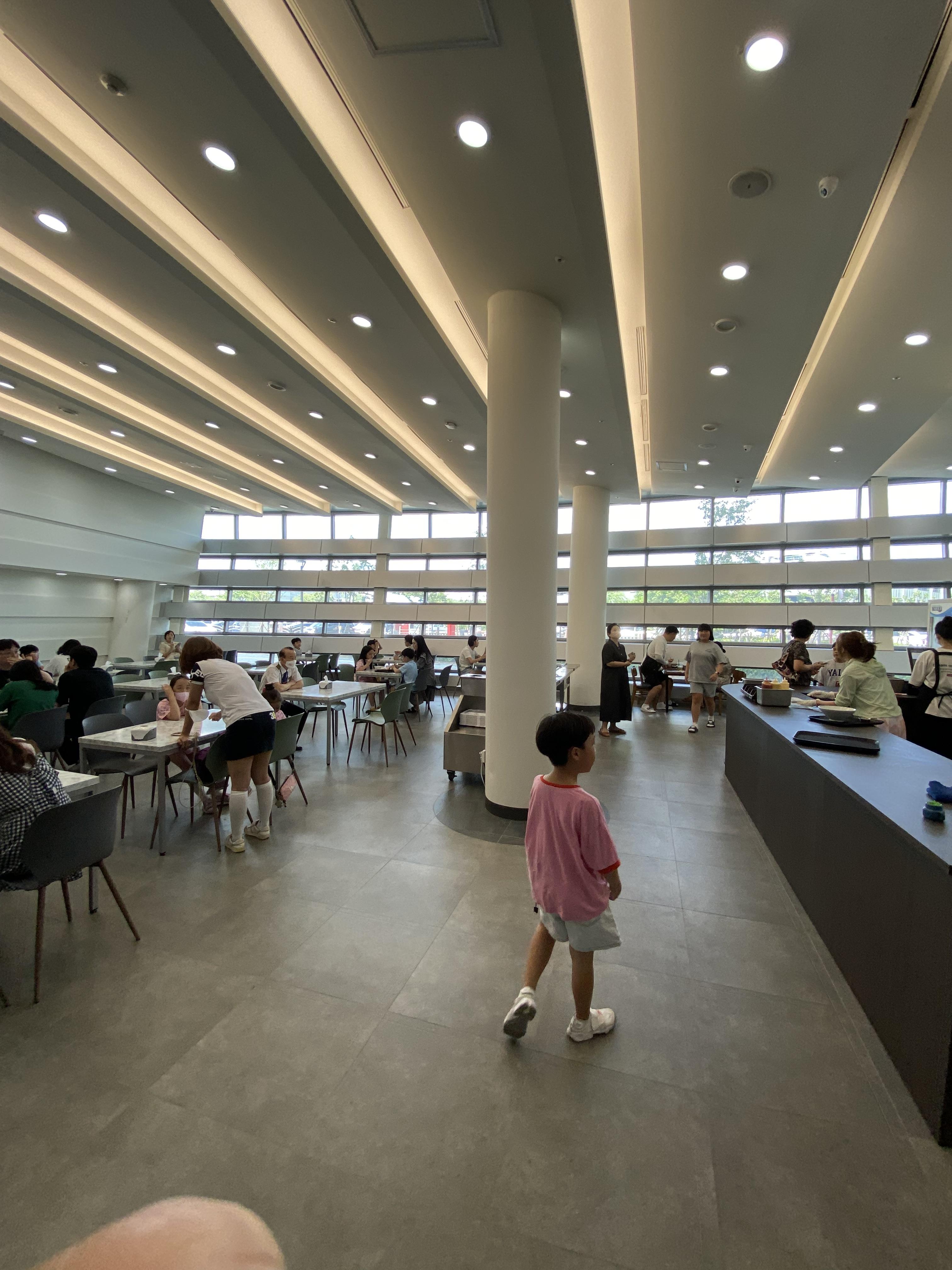 김포 공항철도역에서 쭉 걸어 나오면 김포공항 내부를 정확히 가로질러 외부로 나오게 되는데 외부로 나오기 직전에 바로 김포공항 내부 식당들이 양옆으로 길게 늘어져 있습니다. 김포공항에 도착했을 때 시간이 11시 반 정도였고 밥 먹고 가기엔 좀 애매한 시간이고 그렇다고 그냥 지나치기엔 맛있는 메뉴들이 너무 많은 거 같고 그래서 아들에게 밥 먹고 갈까 물어봤으나 단호히 거절!! 아들은 그저 국립 항공박물관에 가는 게 가장 우선이었던 거죠. 그때 잘 설득해서 밥을 먹었어야 했는데....'국립 박물관인데 그까이꺼뭐 식당 하나 없을라고' 이런 안일한 생각에 쭉 직진을 했습니다. 박물관 도착 후 1층을 둘러보더니 갑자기 배가 고프다고 그때부터 밥 타령을 하더라고요. 직원에게 물어보고 1층 구내식당이 있다고 안내를 받고 부랴부랴 달려간 곳이 바로 아래 사진 속의 공간입니다.