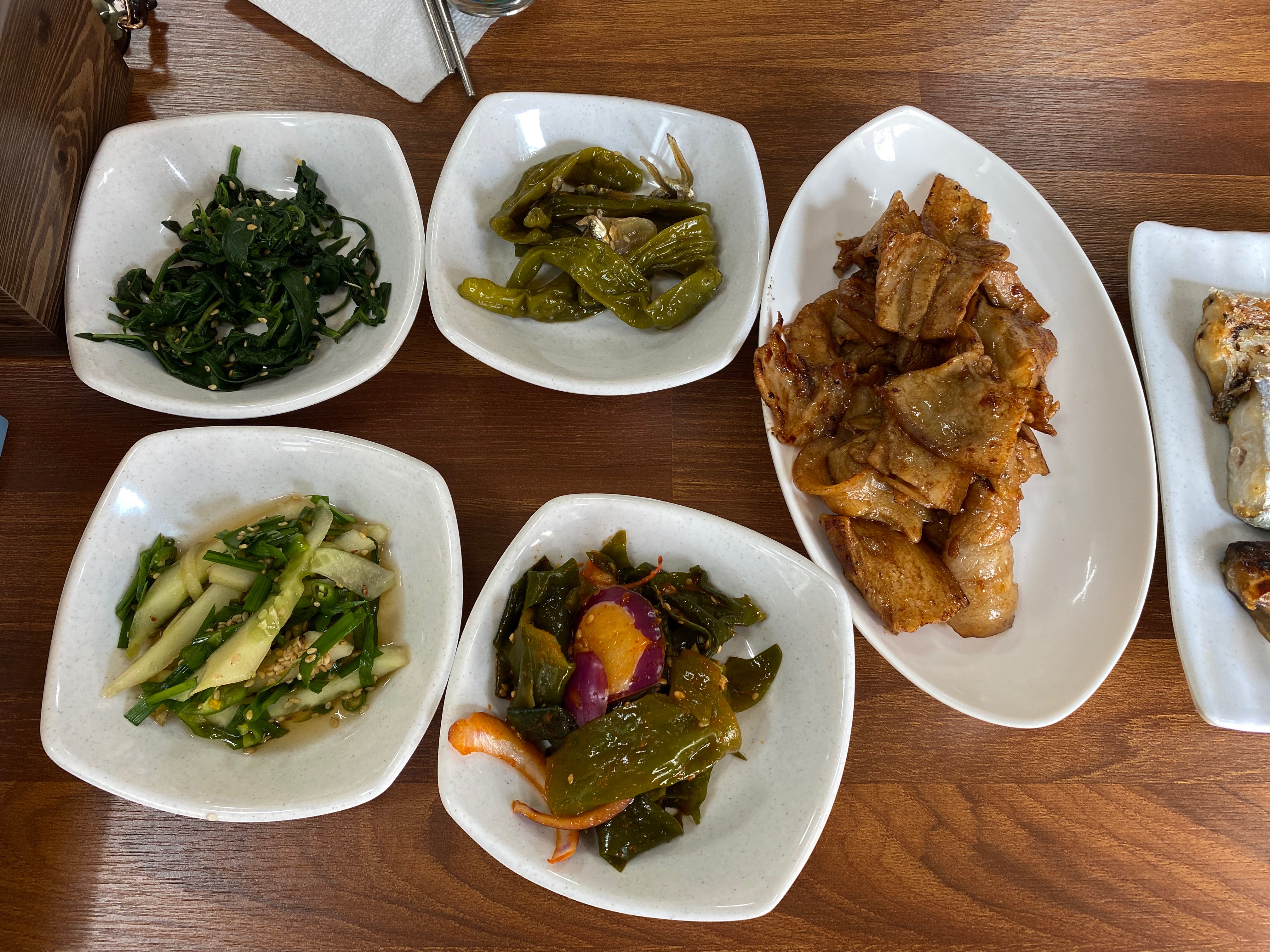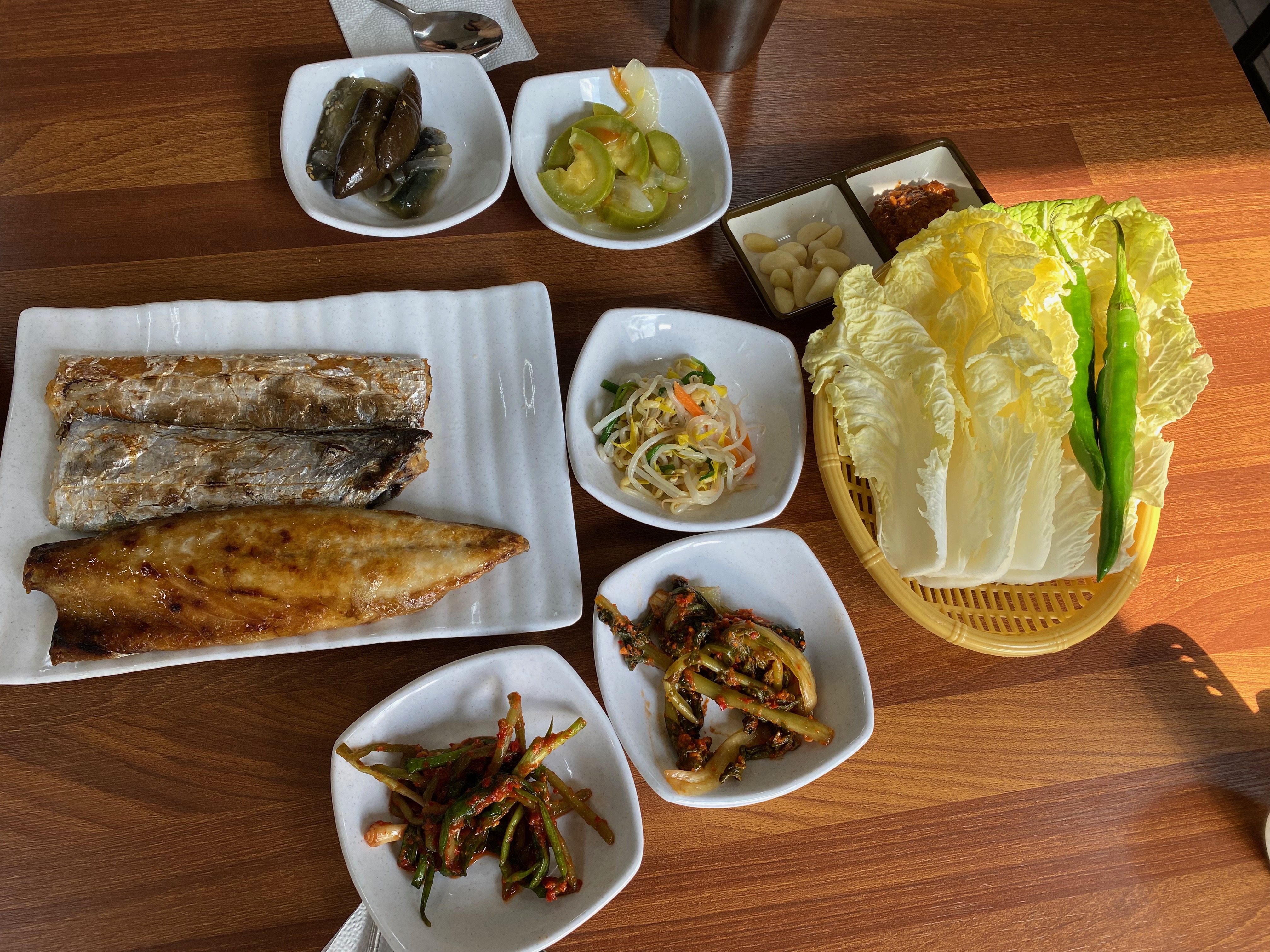 아침 상에 돼지 두루치기가 나오고요, 생선구이로 고등어, 갈치구이가 나옵니다. 그 외 맛있는 반찬들과 신선한 쌈 채소가~