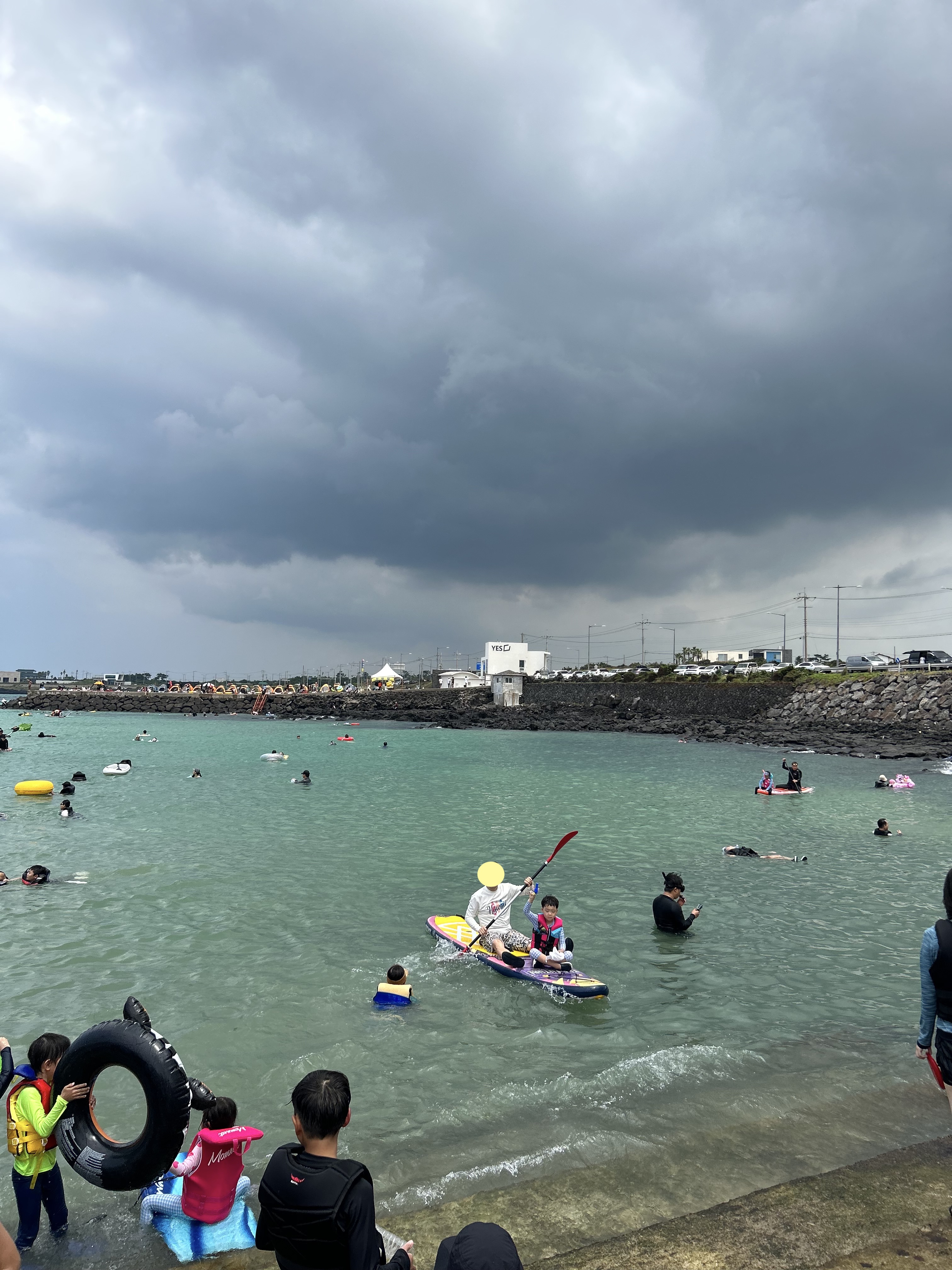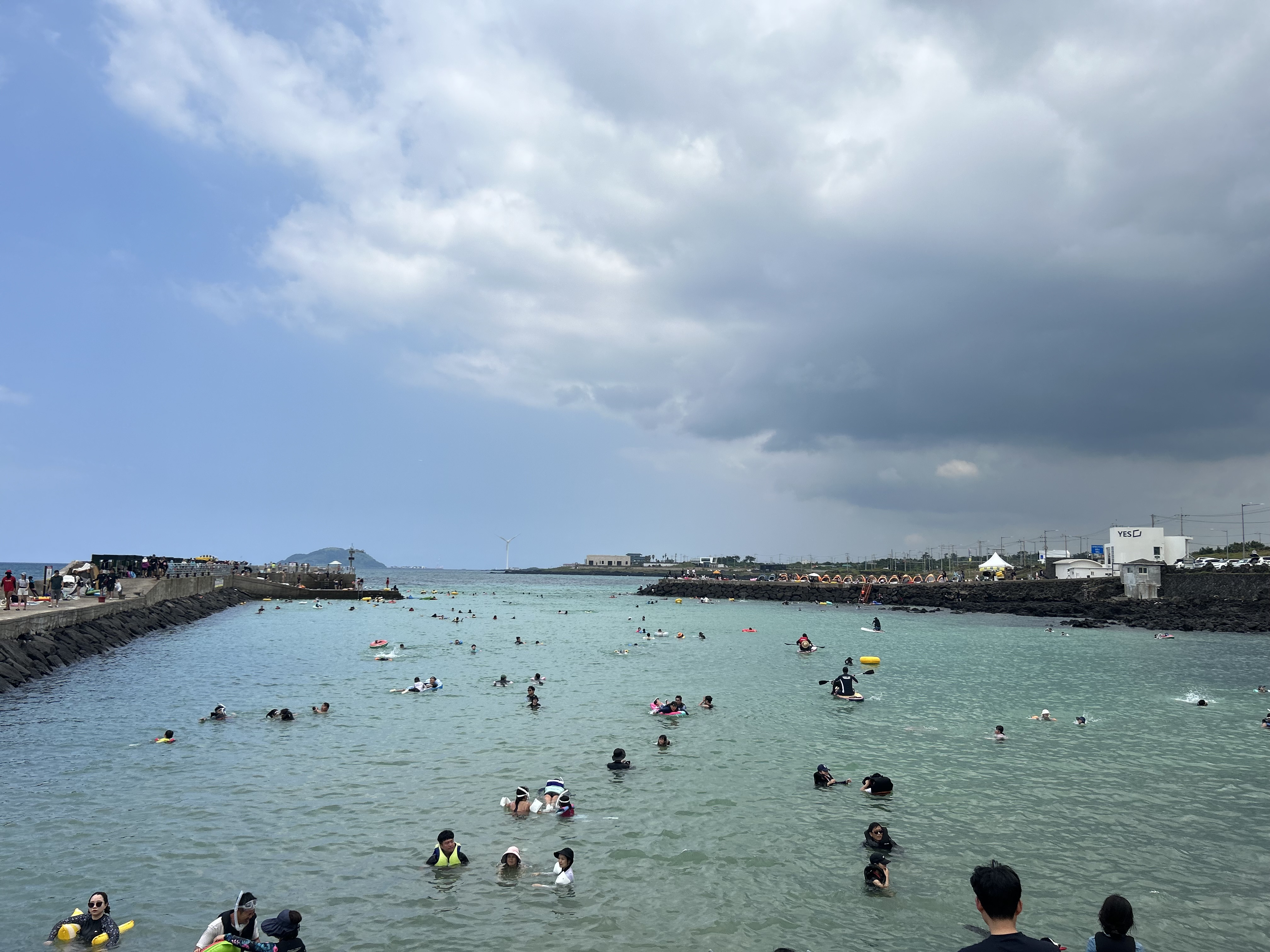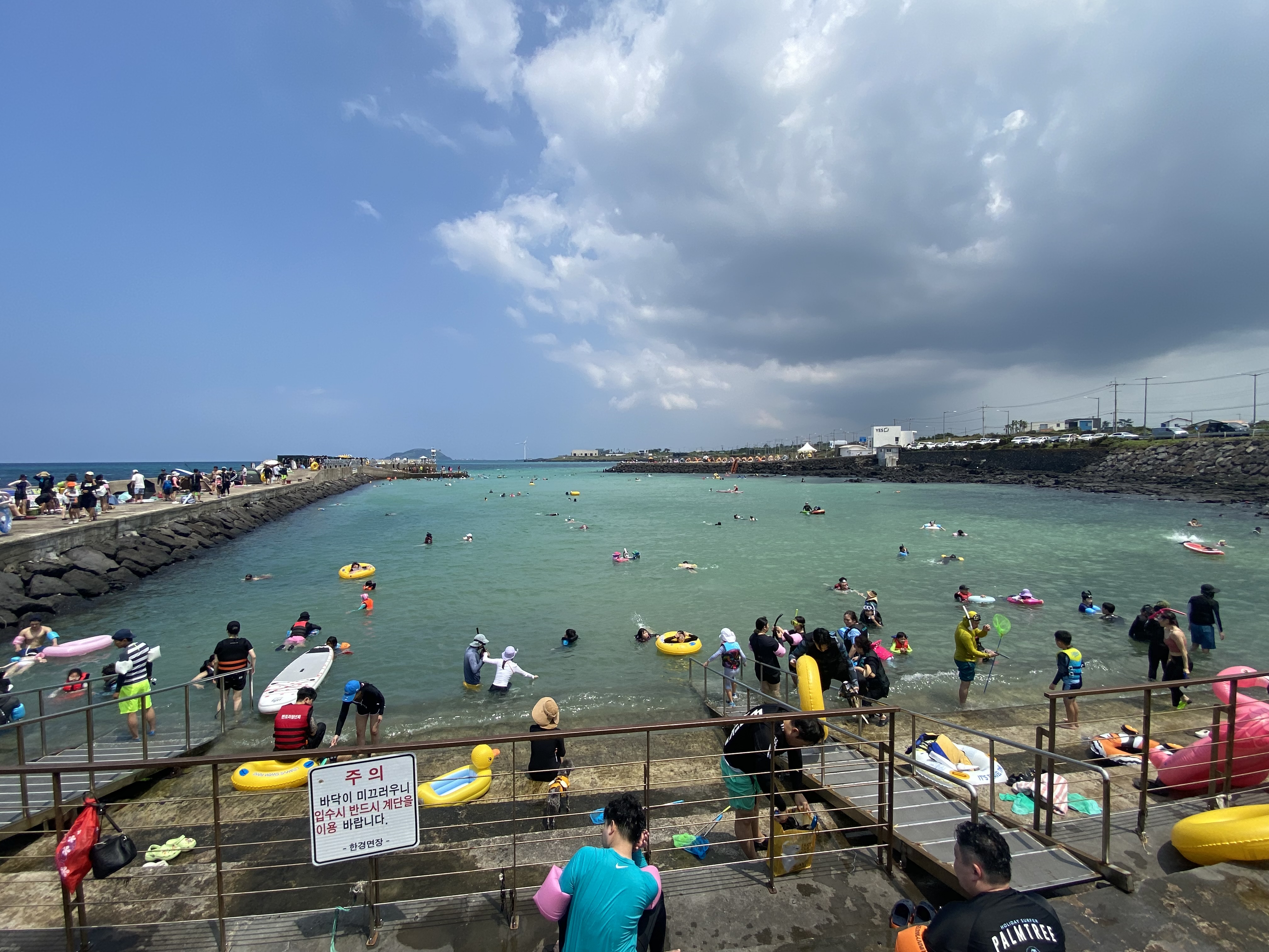 판포포구 바로 도착했을 땐 저 우측에 먹구름들이 거의 없었을 때라 포구에 사람들이 많았어도 물이 사파이어 색깔이 또렷하게 보여 무척 이뻤었는데 이것저것 챙겨서 물놀이하려는 타이밍에는 언제 저렇게 먹구름이 몰려왔던지 사진으로만 봐왔던 판포포구의 물빛은 볼 수가 없었습니다. 아마도 오전에 일찍 왔더라면 때깔 쥐기는 바다 빛을 볼 수 있었겠죠? 방파제 쪽 끝에는 도착 당시 물 수심이 제법 있던지 다이빙하는 사람들로 가득하더군요.