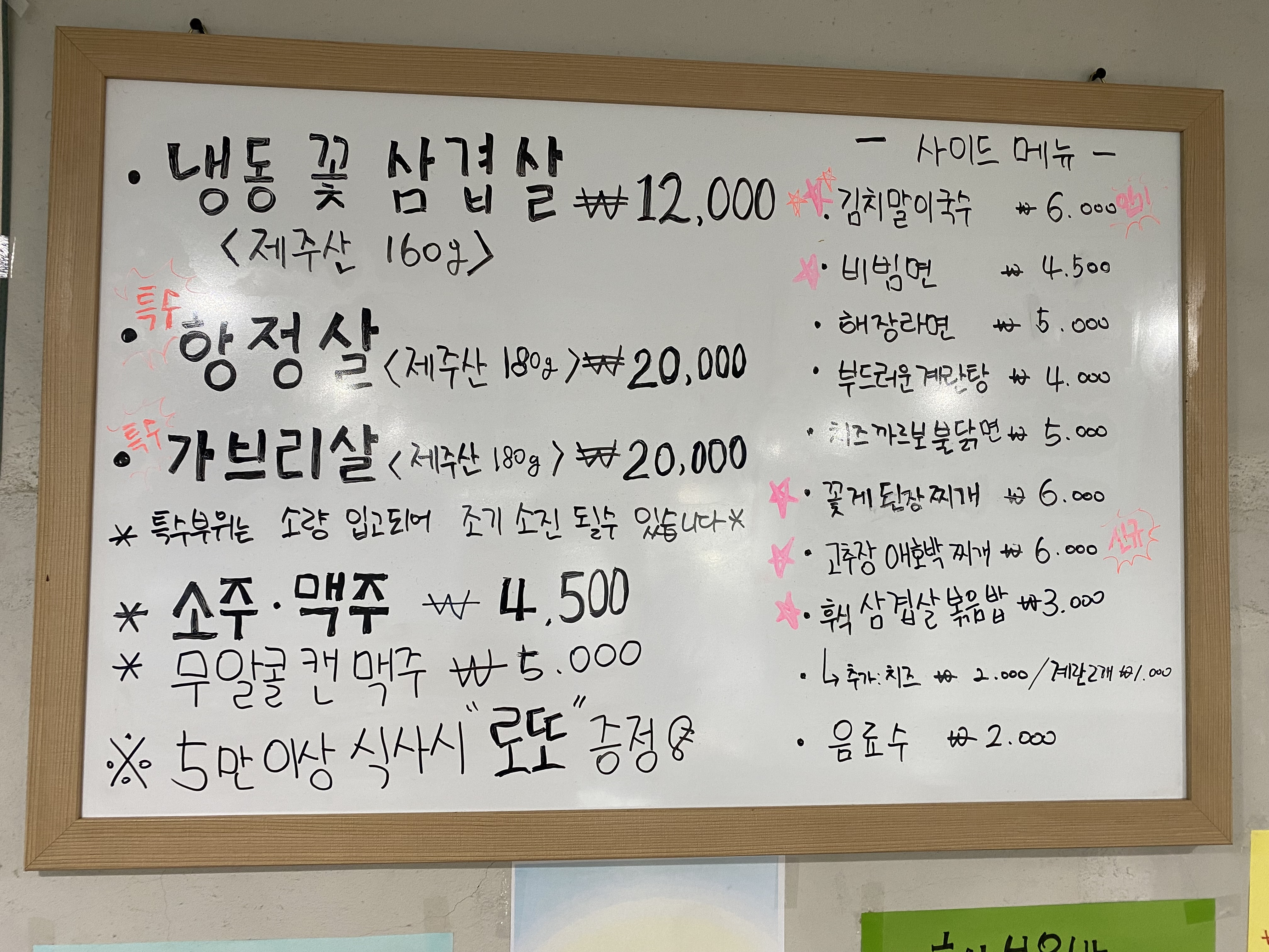 아빠가 먹을 몫이 구워지자 겨우 한 컷 남길 수 있었습니다. 여기는 숯불구이 아니니 오해 마셔요~ 가스불에 굽는 고긴데도 물놀이를 씨게 해서 그런가? 아님 고기 맛이 평타 이상으로 맛이 있어서 그런가? 아빠 몫의 고기도 그야말로 순삭!!! 가격은 7만 원 중반대로 나왔는데 여기서 잠깐~ 흑돼지는 과연 얼마길래 한림냉삼으로 와야 했을까요? 작년에 흑돼지 바베큐 먹었을 때는 3인 식구 배부르게 먹어도 7만 원 정도였었는데 요즘 제주도 흑돼지 구이는 대충 계산해도 10만 원 훌쩍 넘어버리는 넘사벽 가격이더라고요. 가격을 떠나서 한림냉삼 생고기 굳이 안 먹고 냉삼겹살만 추가해서 먹어도 충분히 맛있는 고기였습니다. 대패삼겹이 아니고 두껍게 썰린 삼겹살로 식감도 좋고 제주 돼지라 맛도 좋고요. 냉동삼겹이 맛이 좋아서 항정살이랑 가브리살 맛도 궁금해서 각 1인분씩 추가해 먹었지만 냉삼겹도 충분히 맛이 좋아 굳이 궁금하지 않으신다면 냉삼겹만 추가해 드셔도 됩니다. 지극히 개인적 입맛 기준으로 사장님과 알바생 매우 친절하며 가계 위생상태도 깨끗하고 고기 맛도 좋아서 제주 고기 맛집으로 강추해 볼게요^^