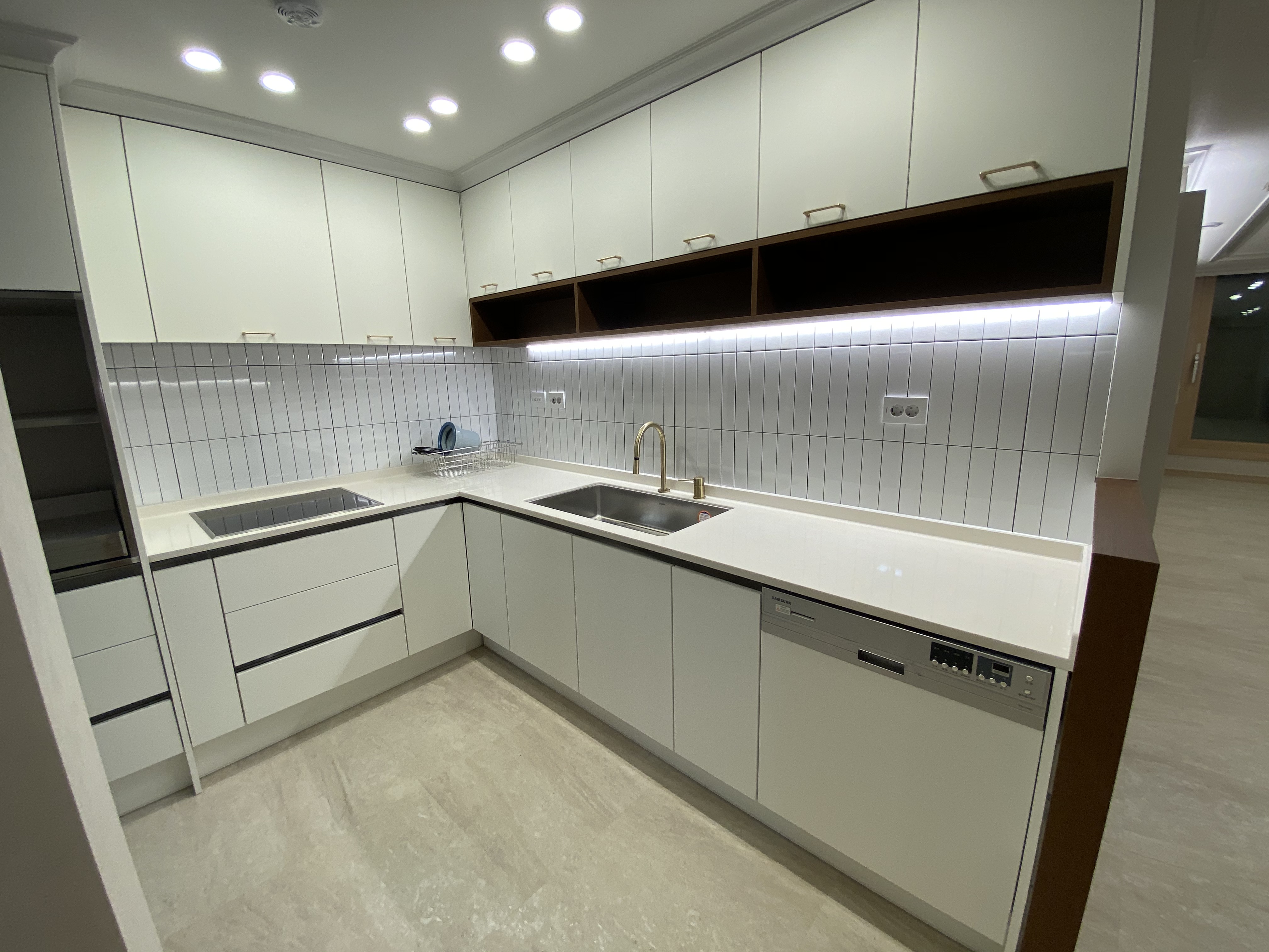 요기가 주방 싱크대가 설치되어 있는 공간이며 인덕션과 싱크대 수전은 저희들이 해외 직구로 구입해 설치까지 해주셨습니다. 기존 좌측에 잘린 부분이 냉장고가 있던 곳인데 그 공간만큼 수납장과 전자레인지, 밥솥 공간을 만들었습니다.