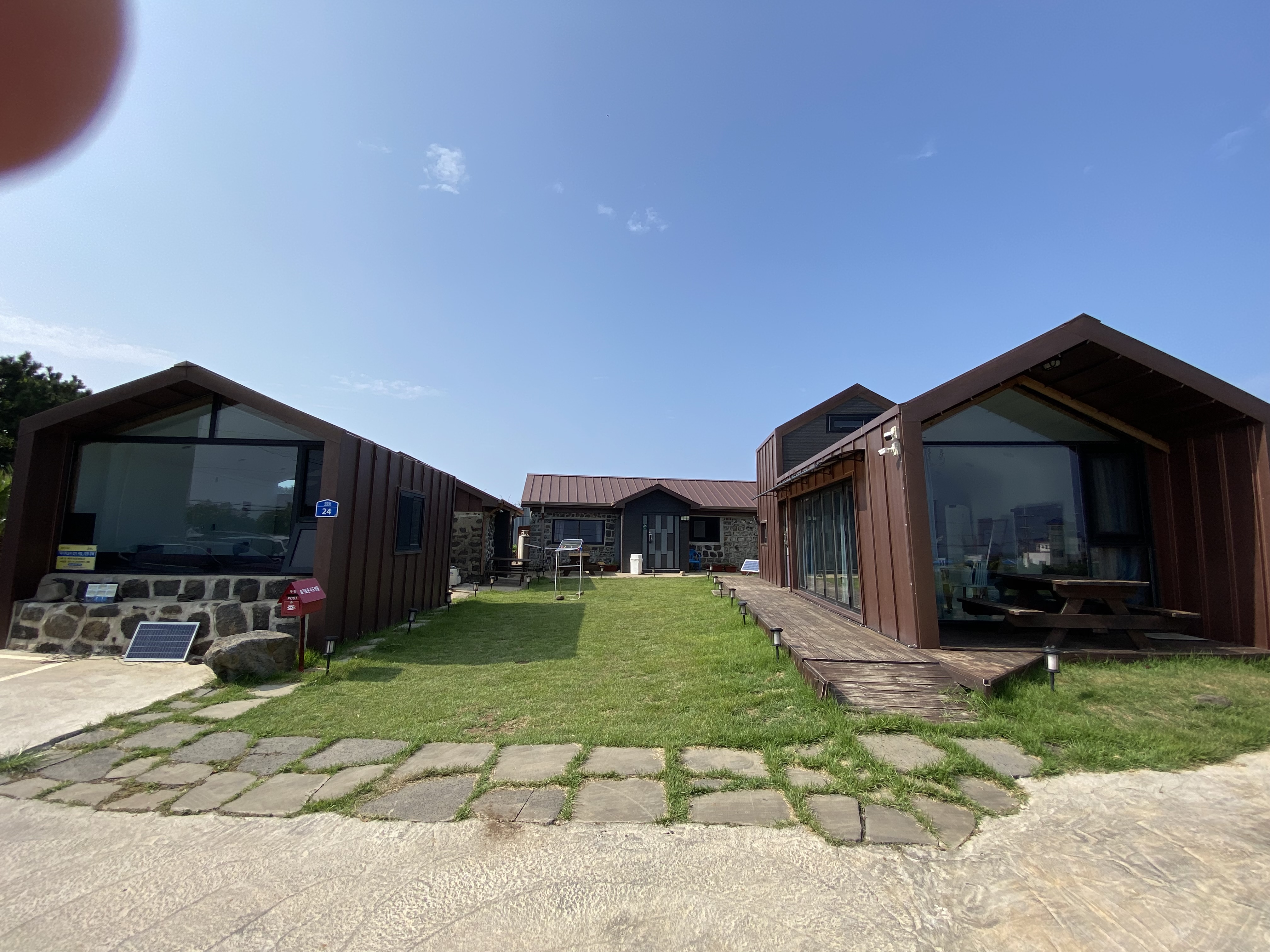 안내한 주소로 차를 몰고 가보니 입구에 '슬기로운 우도생활' 돌 간판이 있습니다. 살짝 오르막길을 올라가면 짜잔~ 숙소 전체 뷰가 나오는데 정면에는 쥔장 어르신이, 좌측은 사무실, 우측 독채가 숙소로 운영되는 곳입니다.