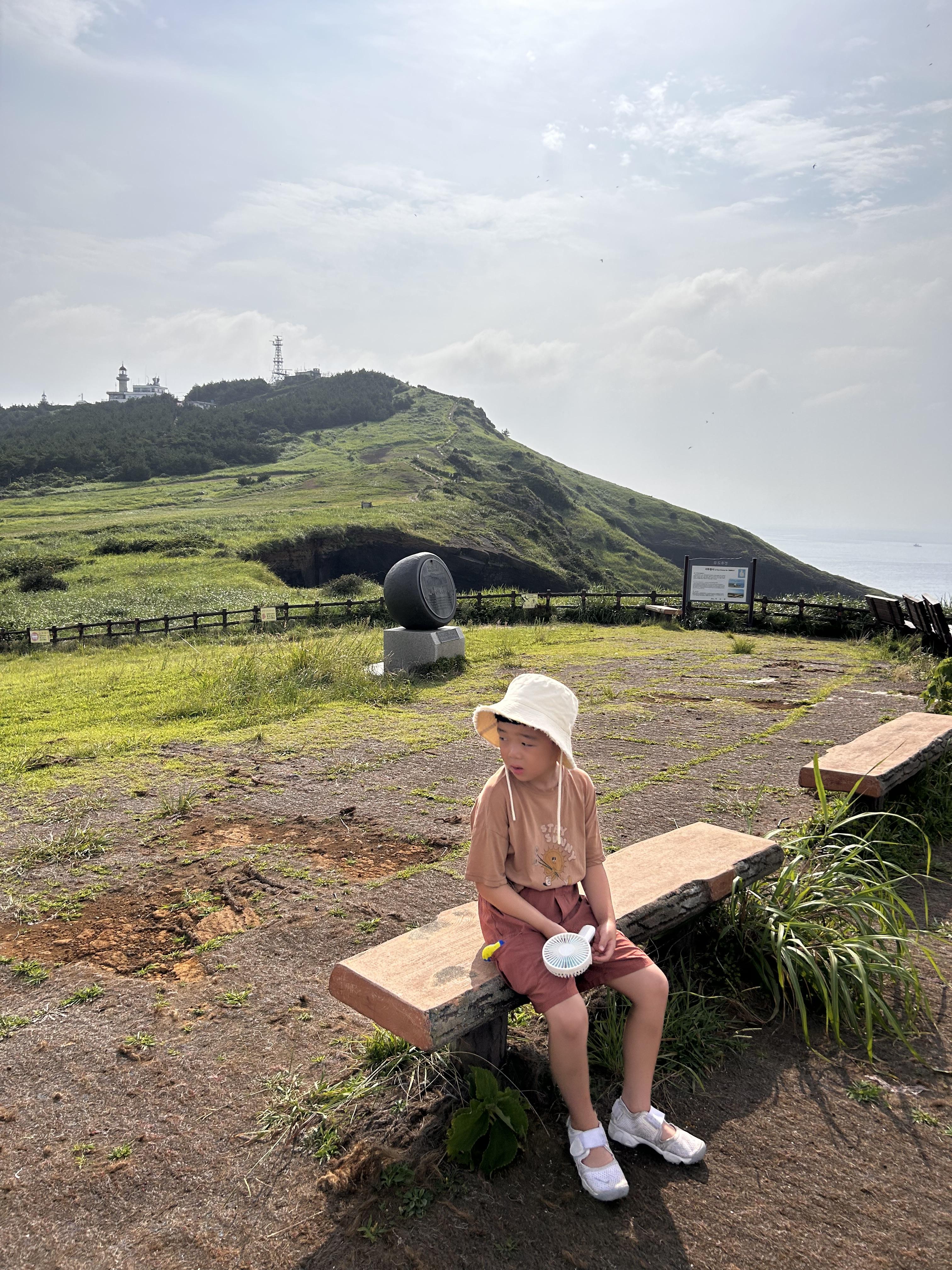 나름 이른 아침이라고 생각했던 오전 8시 즘이었나? 우도 등대공원에 가보기로 하고 서둘러 나왔는데 한낮 방문객에 비해 인적 드문 곳으로 괜히 왔나 싶다는 생각이 들었습니다. 구름이 많이 끼어 있어서 햇살이 그리 강렬하진 않았는데 아들은 입구 초입부터 더웠는지 핸드 선풍기를 ~~~ 우도봉을 향해 나름 가파른 오르막길을 걸어가는데 아직 초1 어린이라 힘든 티 팍팍!!