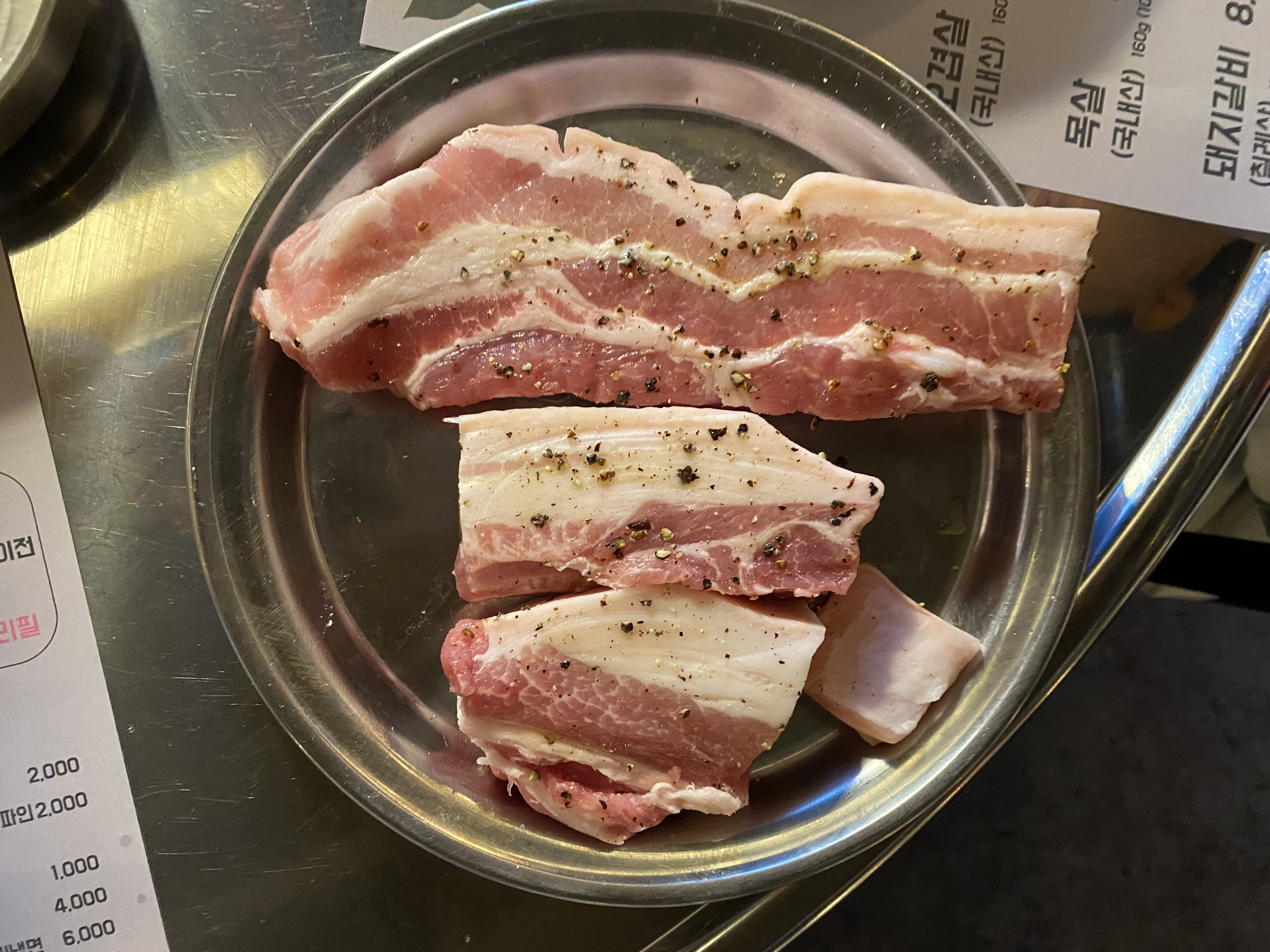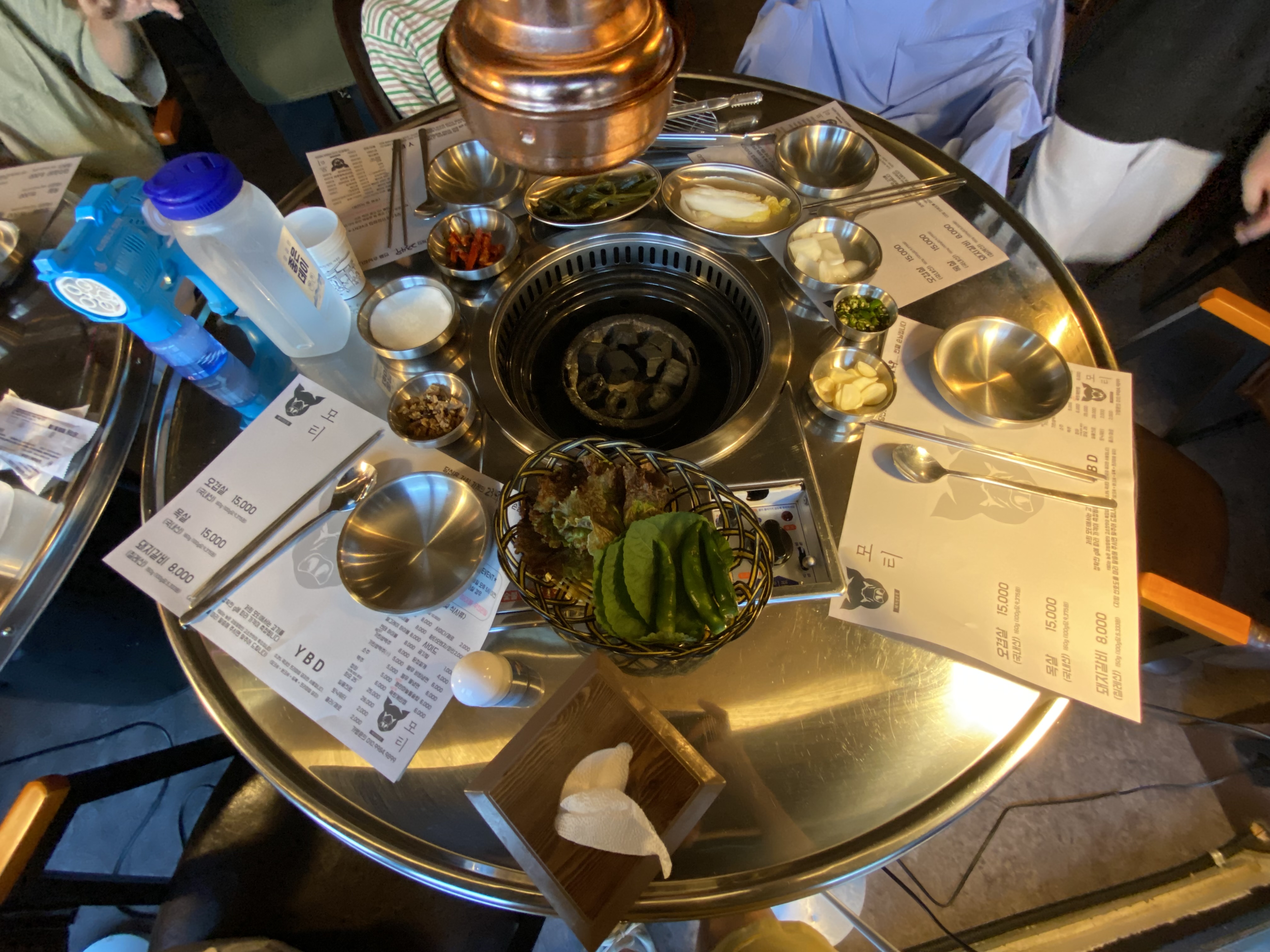 어른 네 명에 아이 세명 ~ 두 테이블에 나눠서 자리를 잡고 고기를 주문했습니다.