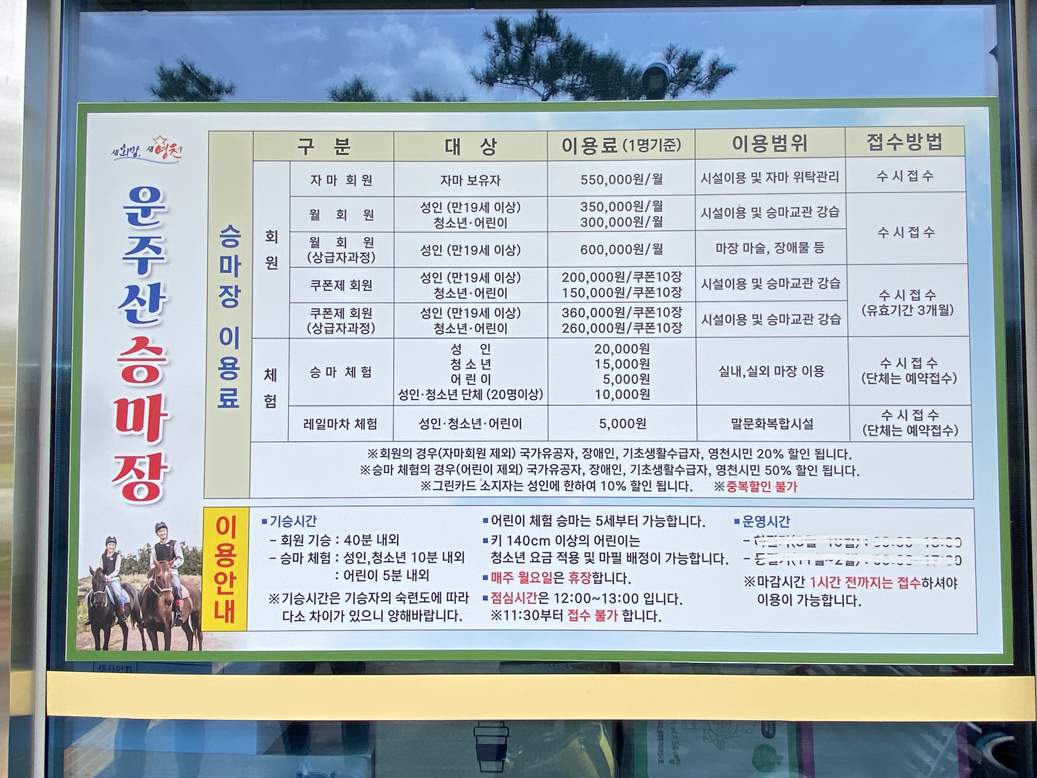 운주산 승마장 이용료를 잘 보시면 여기는 진짜 회원으로 등록해서 승마를 즐기고 싶다는 생각이 들었습니다. 아이들은 어린이 승마체험으로 5천 원, 그리고 말먹이 체험으로 2천 원 요렇게 지불했습니다.