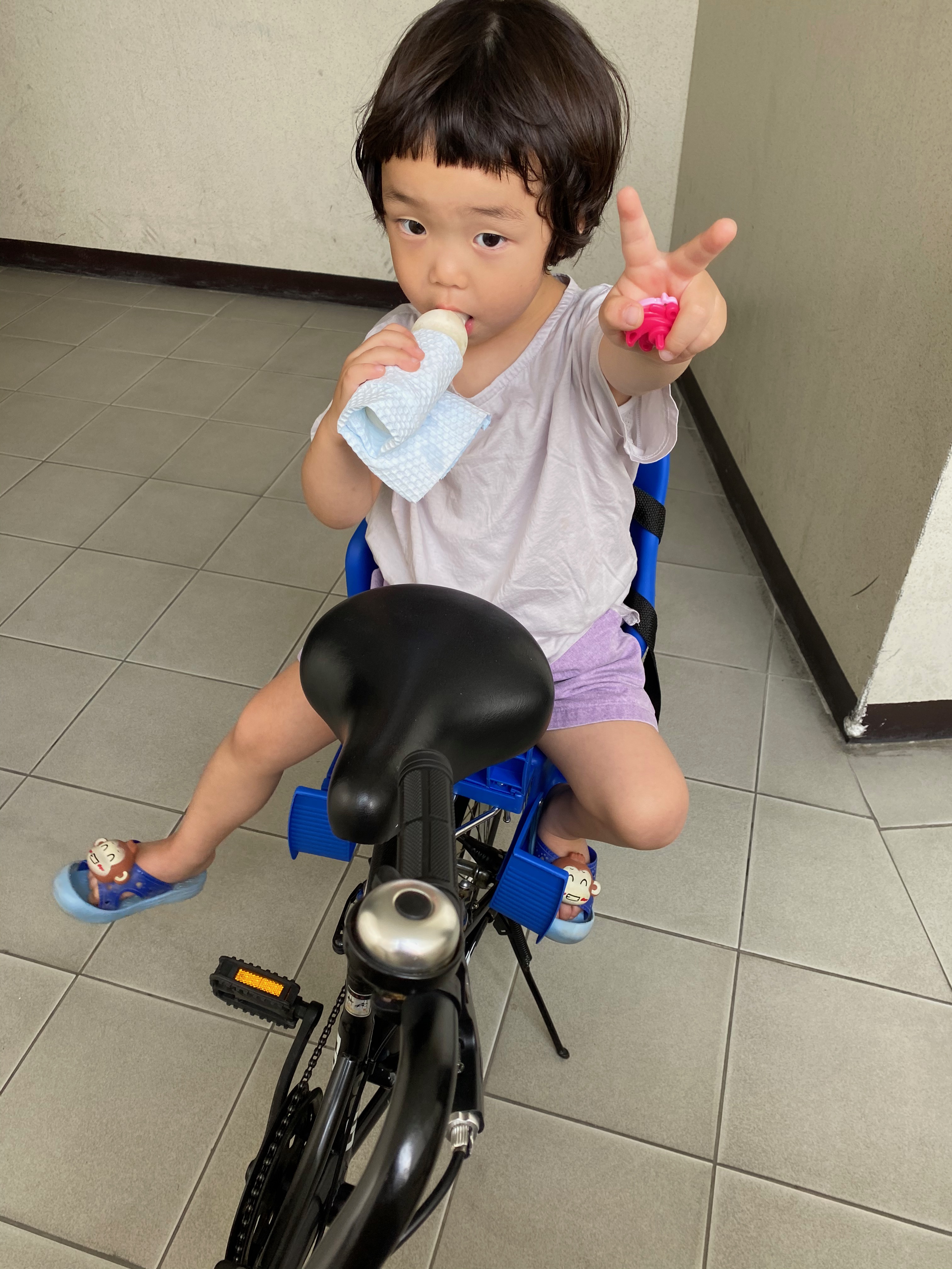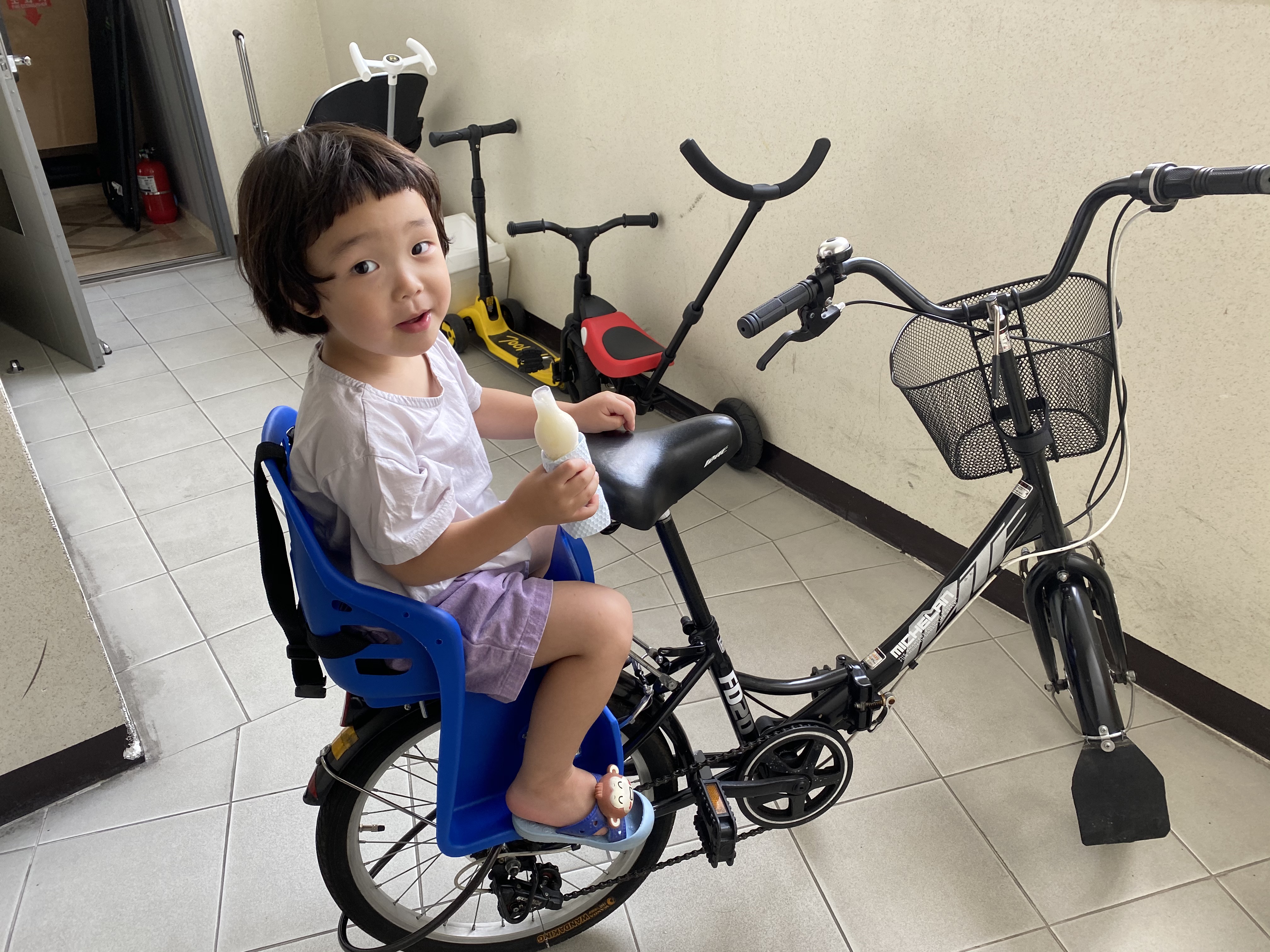노랑이 쿠션방석이 참 .... 거시기 하지만 그래도 없으면 방댕이가 아플거 같아 같이 장착해줬습니다. 조립은 굳이 설명서를 보지 않아도 될정도로 넘넘 쉽습니다. 아들 쭈쭈바 빨면서도 아빠랑 같이 나와서 마이독스 자전거 유아안장에 앉아보며 기쁜맘으로 모델이 되어 주셨다는~~ 확실히 발거치대가 4세정도 아이에겐 맞겠다는 생각이 듭니다.