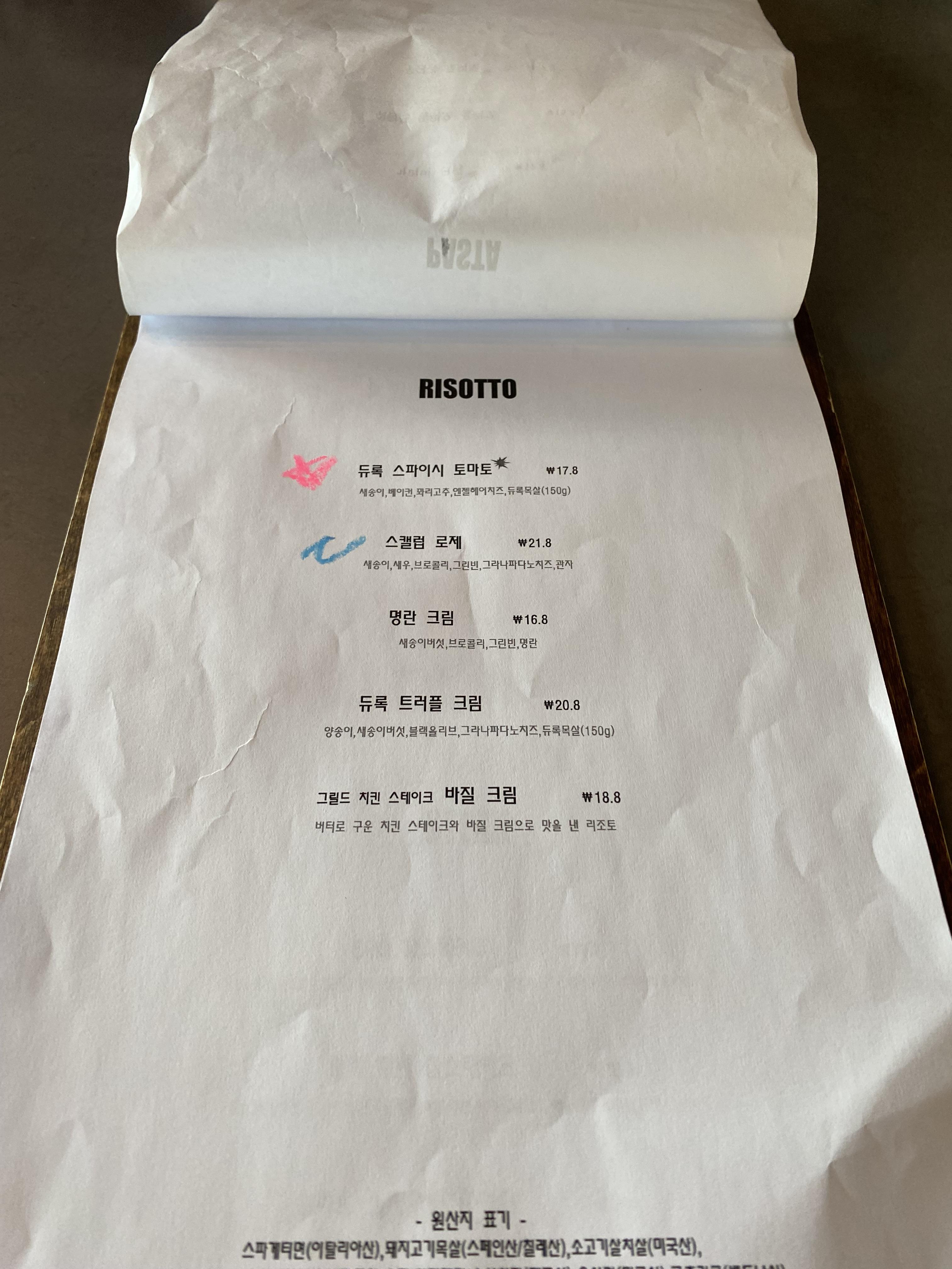 아들이 어쩐 일로 제일 먼저 알리오 올리오 파스타를 찍더군요. 항상 파스타집 일 순위가 카르보나라인데 의외였습니다. 그날은 아들이 선택해 준 메뉴 덕분에 까보는 제끼고 라자냐와 리조또를 추가했답니다.