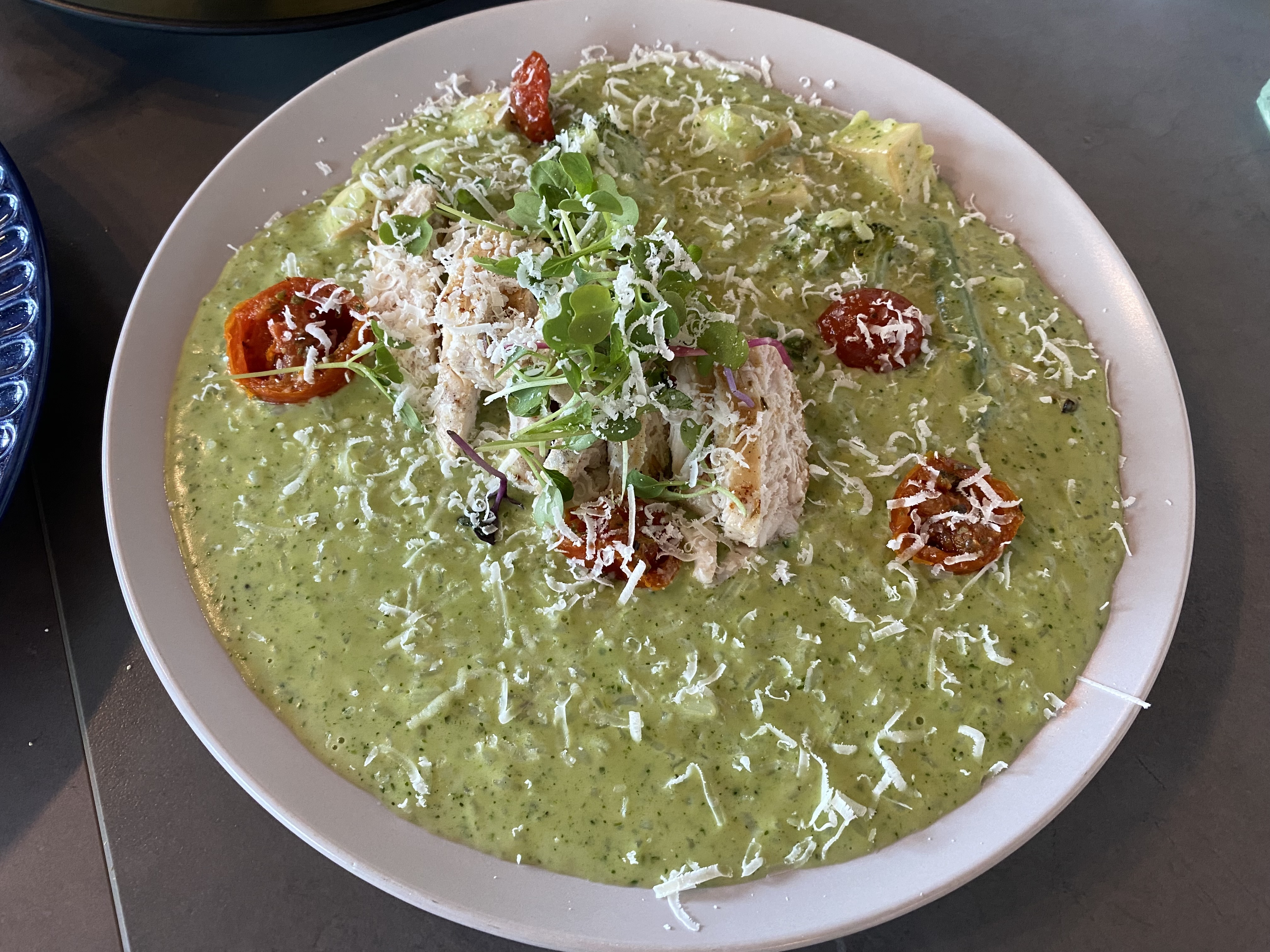 점심인데 면만 먹으면 헛배 부를까 봐 밥 메뉴로 선택한 치킨 스테이크 바질 크림 리조또가 나왔습니다.