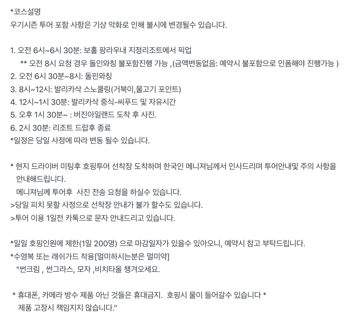 아래 캡처 내용은 본 상품의 주요 설명내용입니다. 오전 6시부터 픽업 장소로 인솔자가 오고요 그다음부터는 오후 2시 반까지 전체 일정이 나와 있습니다. 여기서 돌고래 굳이 보고 싶지 않은 분들은 사전에 협의해서 일정 조정을 하면 됩니다. 아침 일찍부터 움직이는 게 부담되면 돌고래 구경 패스~!! 그럼 두어 시간 오전 스케줄 여유가 생깁니다.