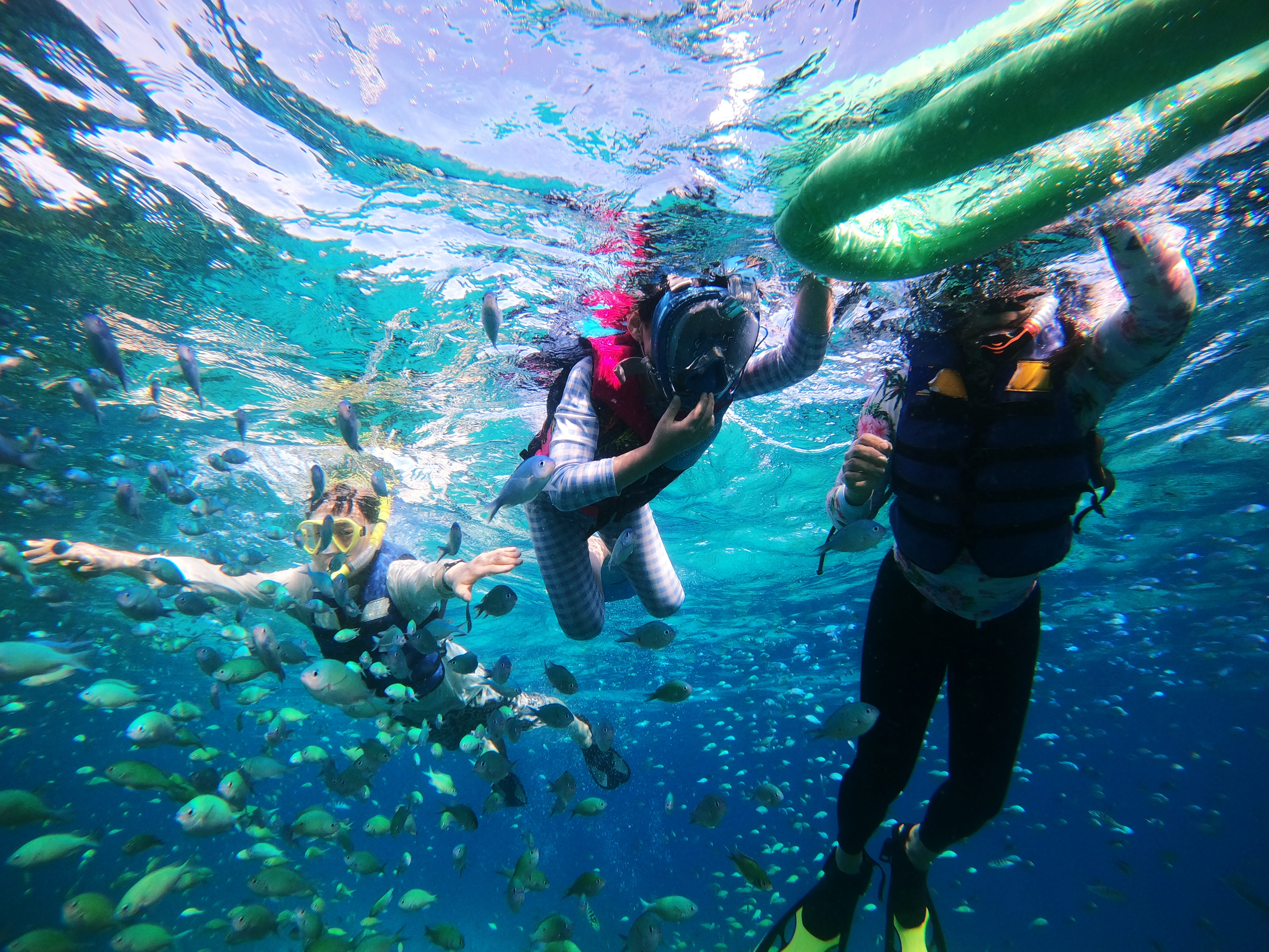 첫 번째 도착한 곳은 거북이 포인트로 발리카삭 섬 주변에 살고 있는 야생 거북이들이 모여있는 곳으로 보홀 여행에서 가장 기억에 남는 그리고 멋진 인생 샷을 남긴 그런 장소입니다. 포인트에 도착해 가이드 두 분이 열심히 장비를 챙겨서 먼저 바다에 입수하고 저희 가족 한 명씩 안전하게 바다에 입수하게 도와줍니다. 바다 스노클링은 그간 오키나와 바다에서 많이 해봐서 자신이 있었는데 말이죠~~다시금 '물놀이는 안전이 제일이다'~ 온몸으로 체험했습니다. 그날따라 물살도 쌔고 파도도 높아서 엄마와 아들은 물에 떠내려가기 무서워서 가이드가 준비해놓은 부력튜브에 한 몸 의지해 거북이와 인생 샷도 찍고 바닷속 뷰를 감상할 수 있었습니다. 저는 입수 전 라이프쟈켓을 입어야 하나 그냥 들어가야 하나 살짝 고민을 했었는데 바닷속 멋진 모습을 감상하고 싶어서 자신감 하나 믿고 바다에 입수했는데요~