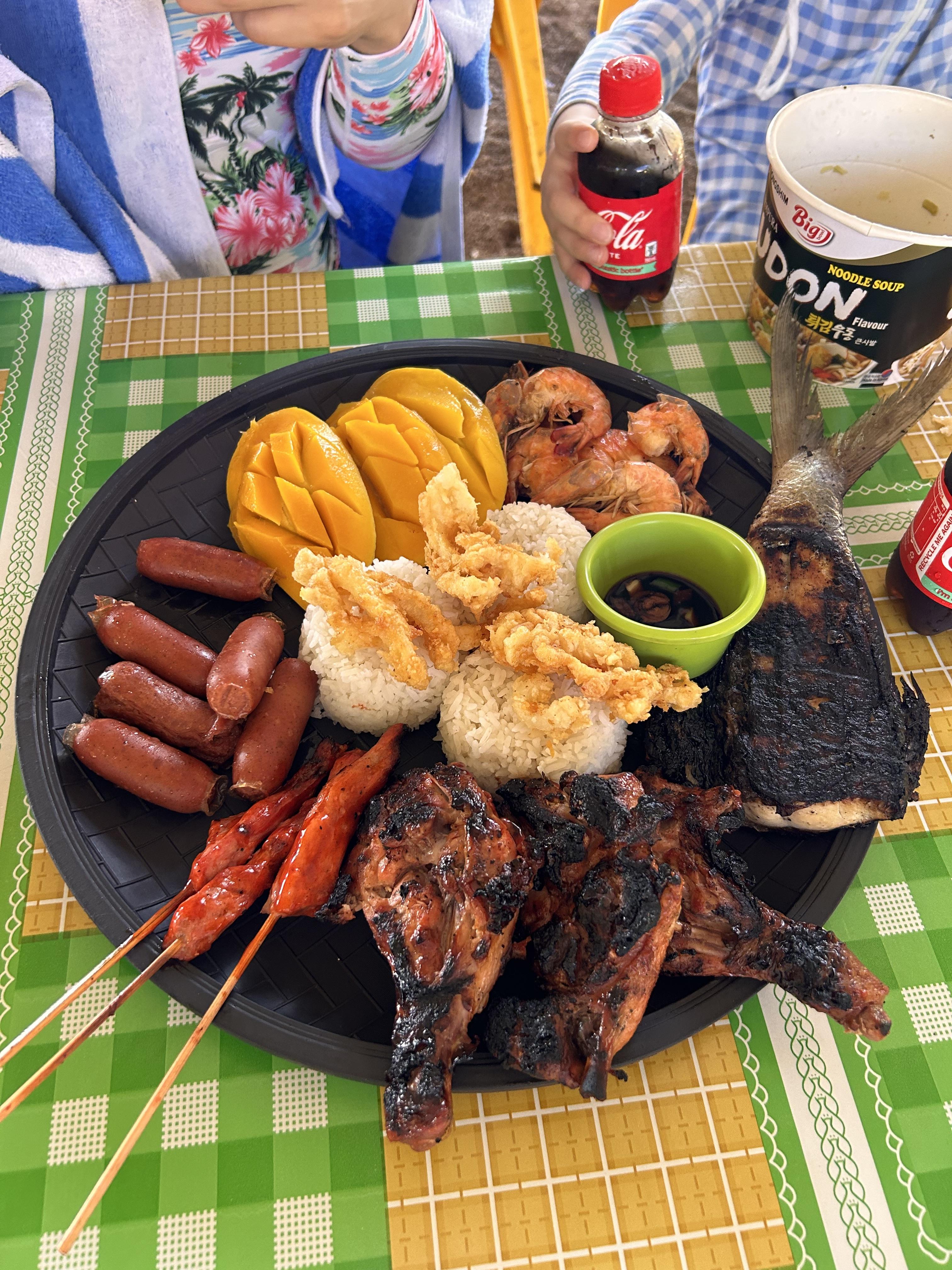 쨔잔~~ 드디어 아침 겸 점심으로 먹는 식사 거리가 제공되었습니다. 저렇게 한 접시가 세 식구 먹거리였는데 다른 건 다 익숙하고 아는 맛인데 꼬지가 뭔지 모르겠더군요. 저기서 가장 맛있었던 건 생선구이였습니다. 싱싱한 게 입에 착착 달라붙더라고요. 나중에 여행 가이드님과 마지막 날 보홀 현지 시장투어를 하는 시간이 있었는데 거기서 저 물고기가 보홀 현지인들이 가장 좋아하는 생선이라고 안내를 받았습니다. 진심 다시 한번 생선구이 맛을 보고 싶었다는......