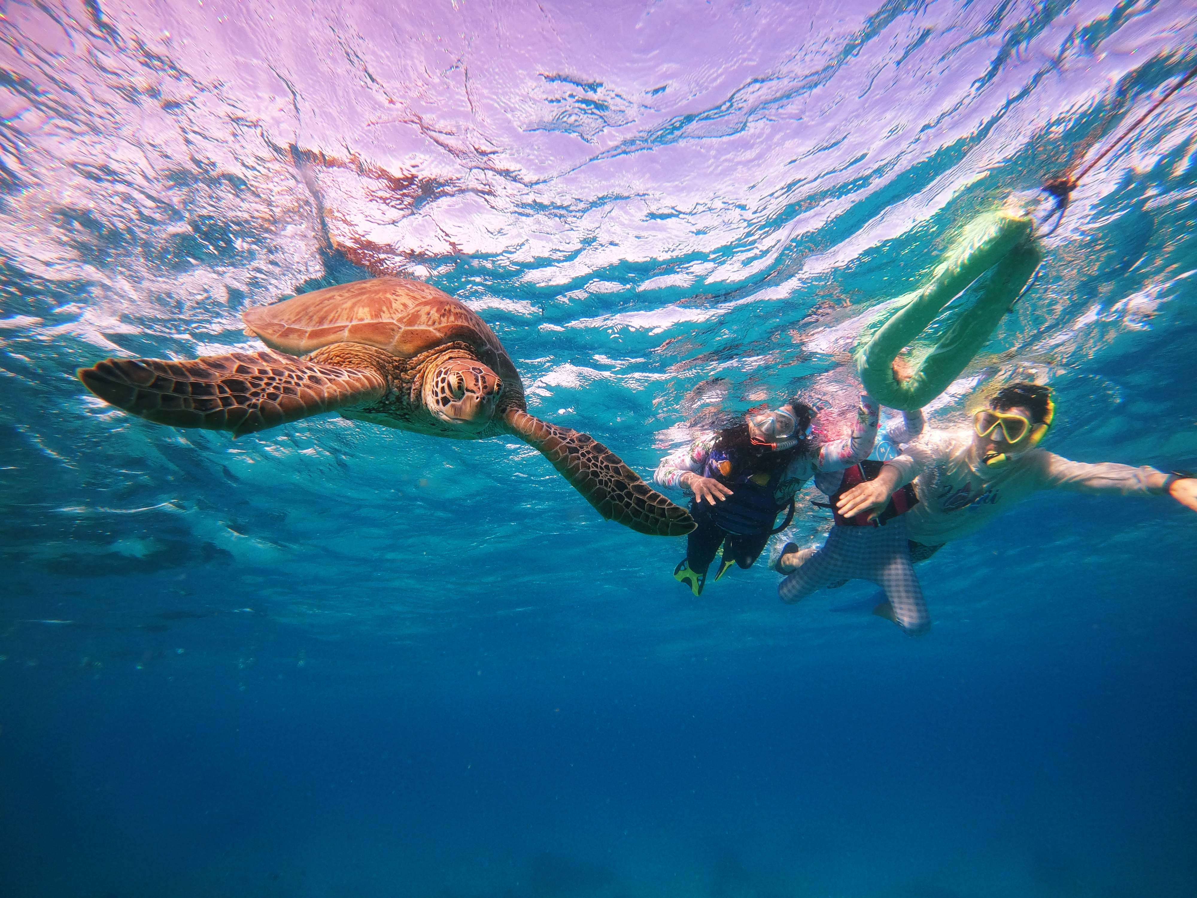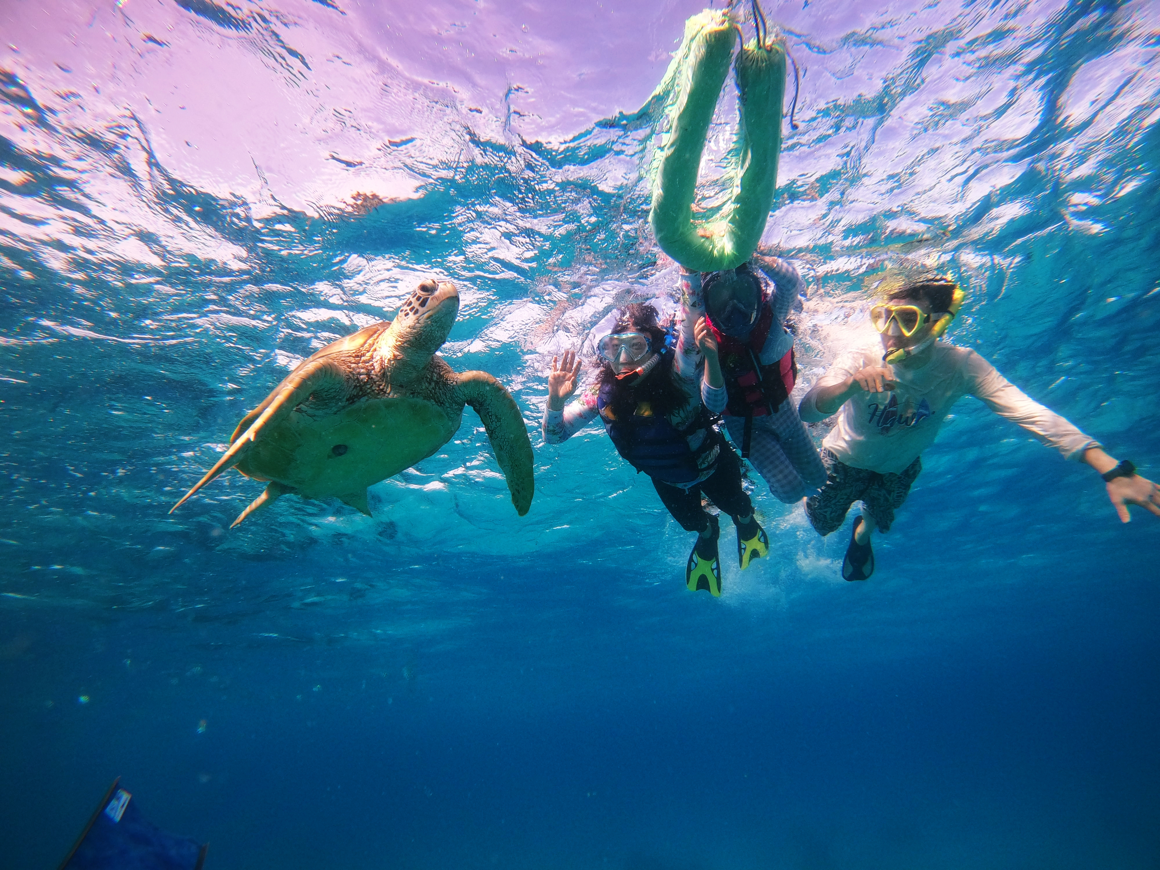 정말 야생 거북이를 수족관이 아닌 이렇게 가까서 맘껏 관람할 수 있다니~ 서로 감탄사 연발~!! 우와~ 우와~ 우와~~~~!!! 파도는 높아서 자꾸 입속으로 짠물이 들어오고, 조류도 심해 잠시만 물길질 멈추면 멀리 떠내려가고~ 거북이 관람은 즐거웠지만 한편으론 정신 똑바로 안 차리면 물고기 밥 되겠다는 생각이 들더군요.
