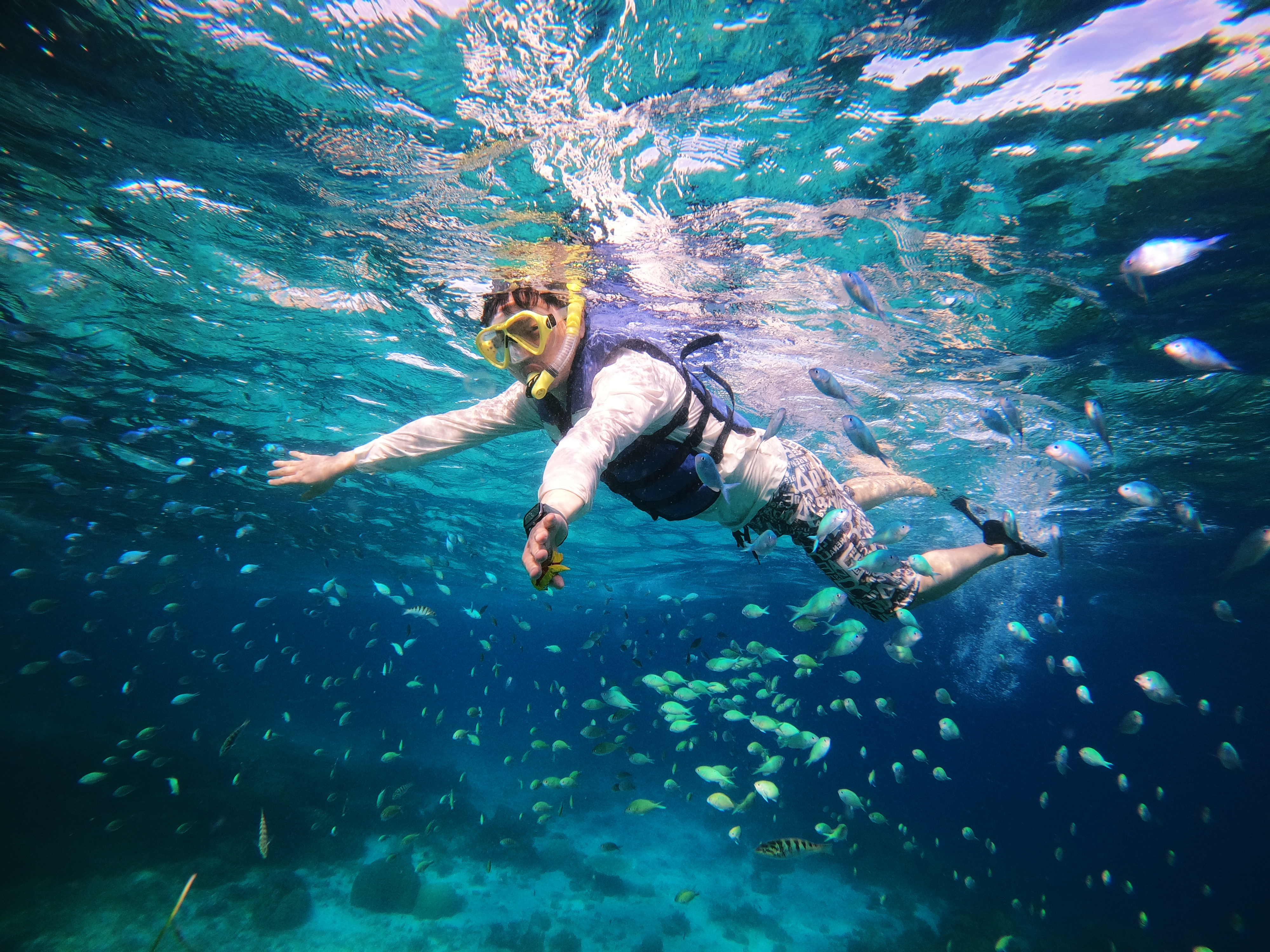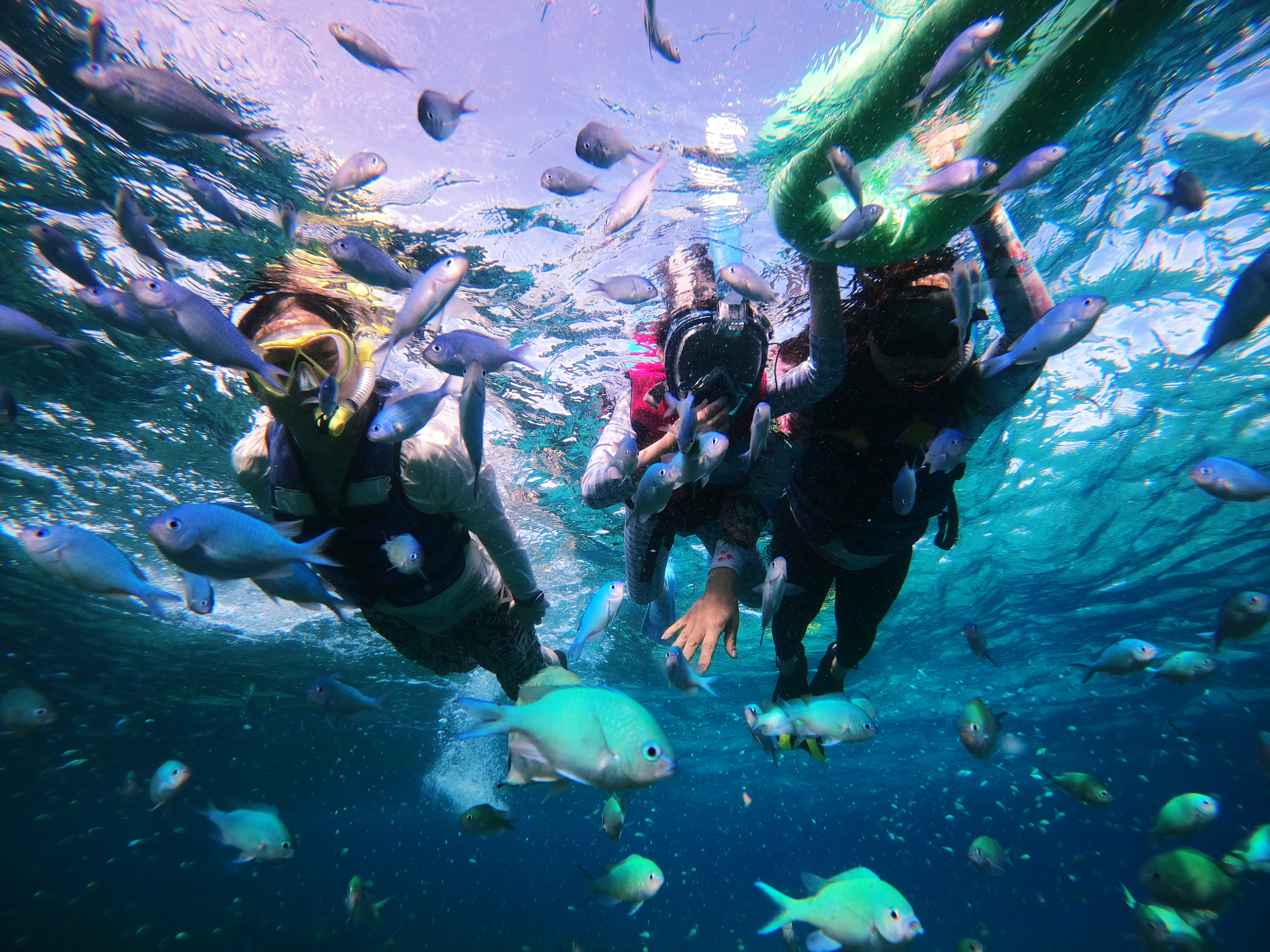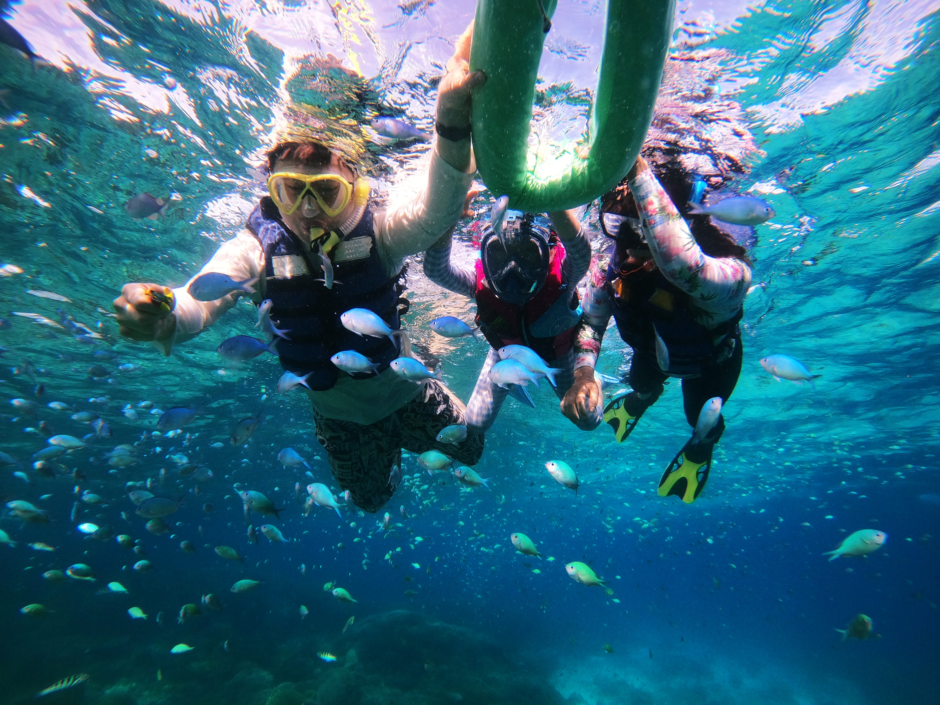 이어서 두 번째 발리카삭 물고기 포인트 자리로 이동을 합니다. 원래는 발리카삭 섬의 아름다운 산호초와 물고기를 함께 보는 상품 구성인데 그날은 위험하다는 판단 아래 거북이 옆에 있는 물고기가 많은 포인트로 정했습니다.