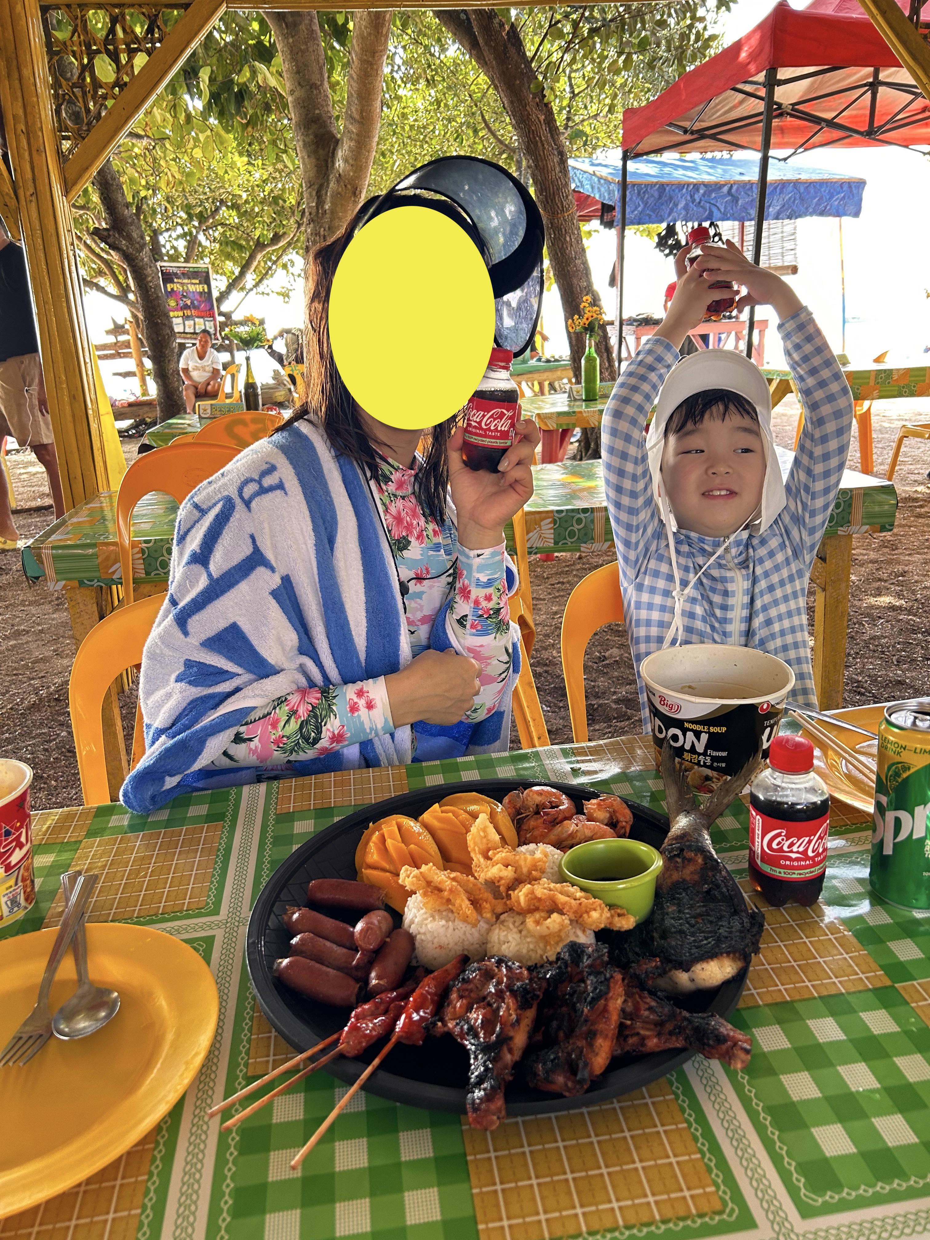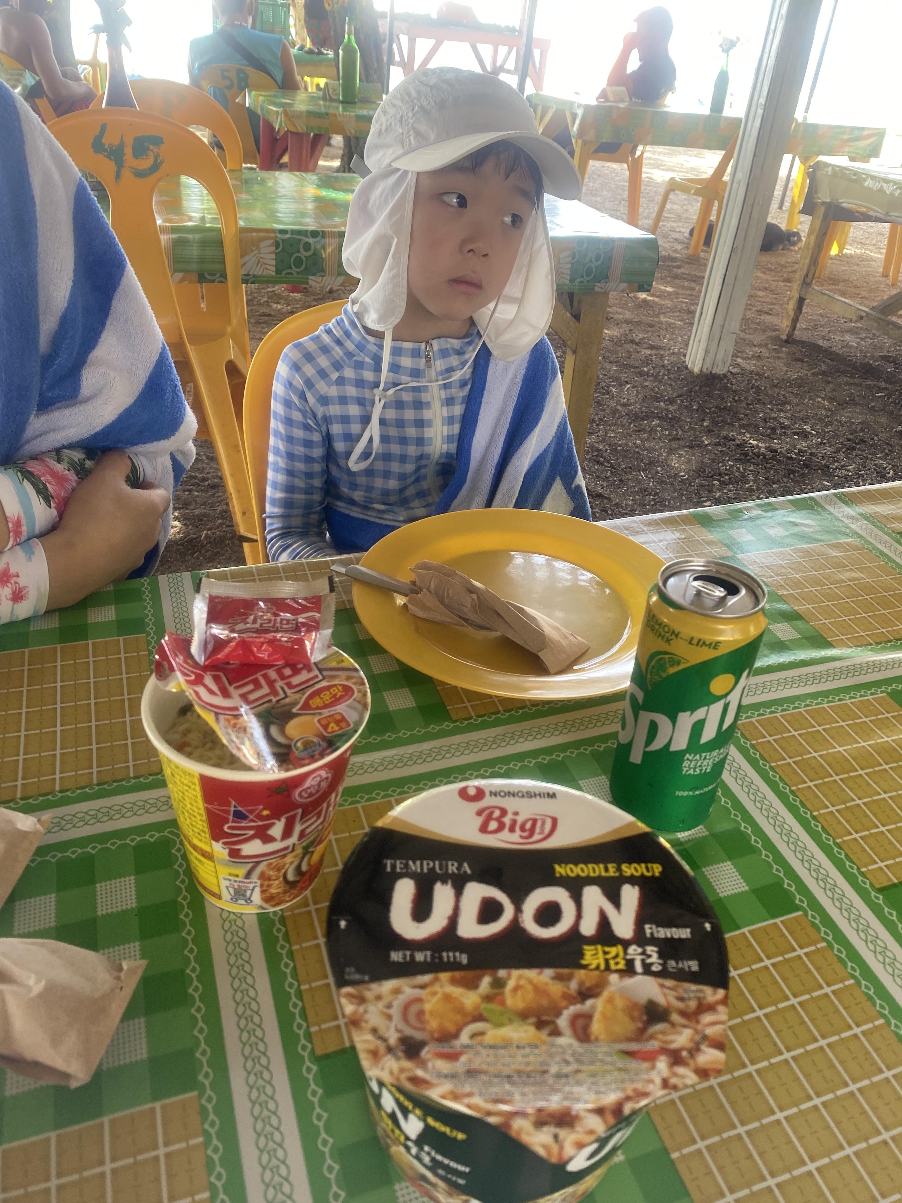 그렇게 발리카삭 스노클링은 한 시간도 체 못 채우고 마무리하며 서둘러 발리카삭 섬안에 마련된 노천 식당으로 안내를 받았습니다. 무인도 같았던 자그마한 섬안에 현지인 주민들이 관광객을 대상으로 식당을 운영하고 있었는데 신기하게도 한국 즉석 라면을 팔고 있더군요. 저희가 너무 일찍 들어와서 그런지 미처 점심 식사 준비가 덜되어 있어 기다리는 동안 따듯한 국물도 마시며 긴장도 풀 겸 해서 우동과 진라면을 먹었습니다. 가격은 생각이 안나용~ㅜㅜ(개당 삼사 천 원 정도 했던 거 같음)