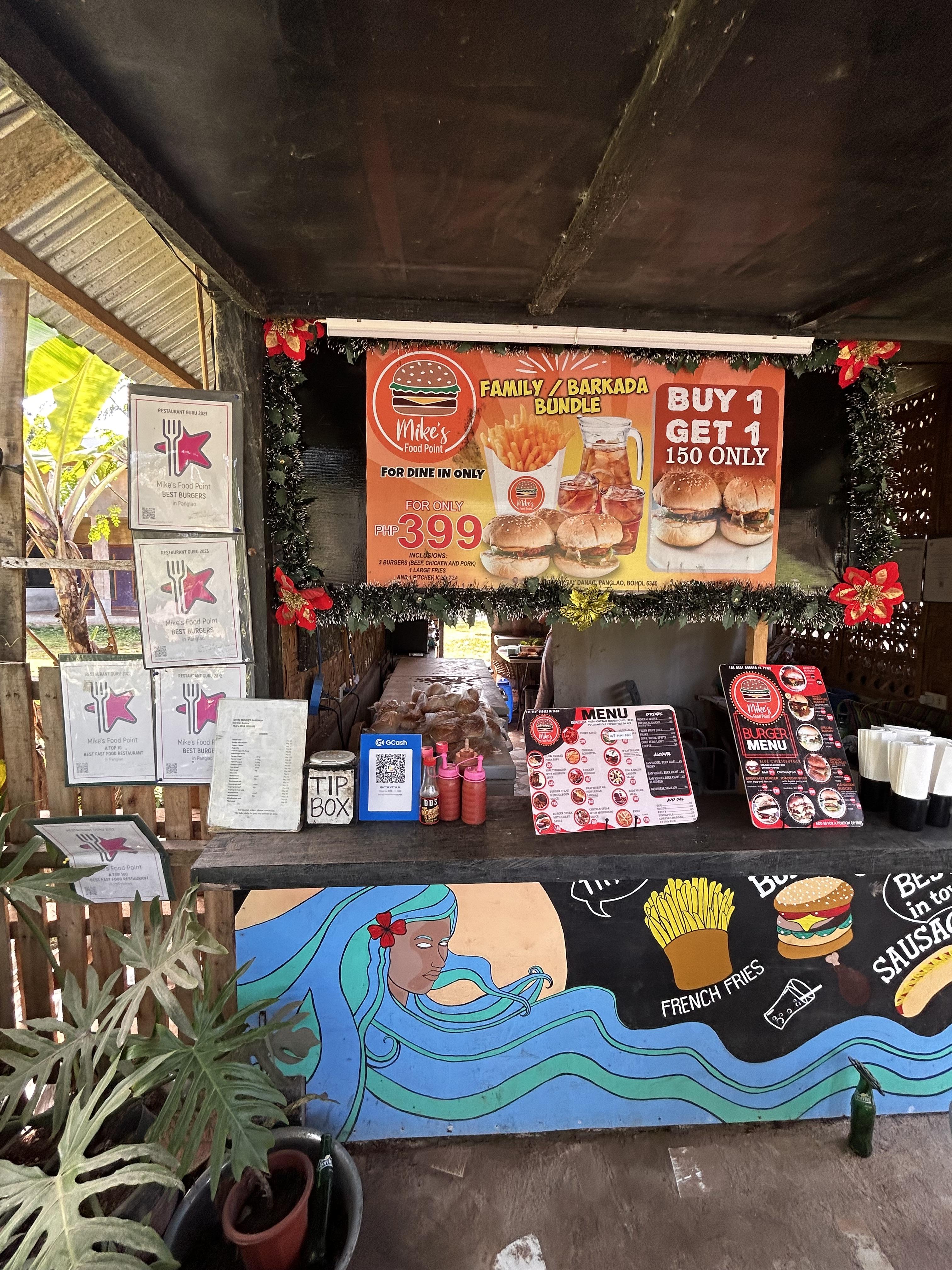 보홀 가족여행 2일차 발리카삭 호핑투어를 끝내고 숙소에 다시 복귀를 하니 대략 오후 3시쯤?? 아들은 물놀이가 성에 안 찼는지 숙소에 복귀하자마자 물놀이 타령을 합니다. 성화에 못이긴 엄빠는 결국 피곤한 몸을 이끌고 야외 수영장에 자리를 잡고 부족했던 아들 물놀이를 맘껏 할 수 있게 해줬지요. 노는 건 노는 거고 아점처럼 먹었던 식사가 소화가 다 되어서 배가 고프더라고요. 그래서 라메디 리조트 주변에 밥집을 검색해 보니 입구 바로 옆에 햄버거가 가격 대비 맛있다고 해서 당장 달려가 봤습니다.