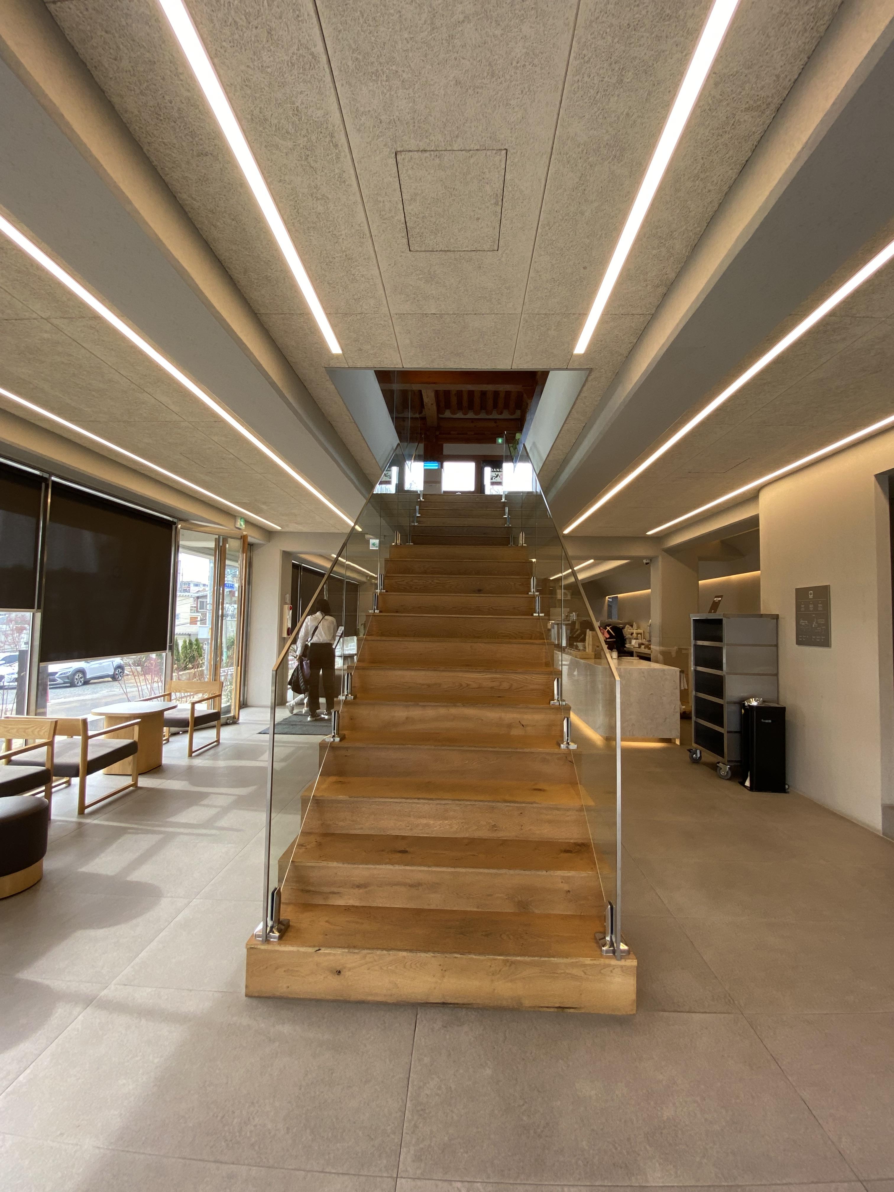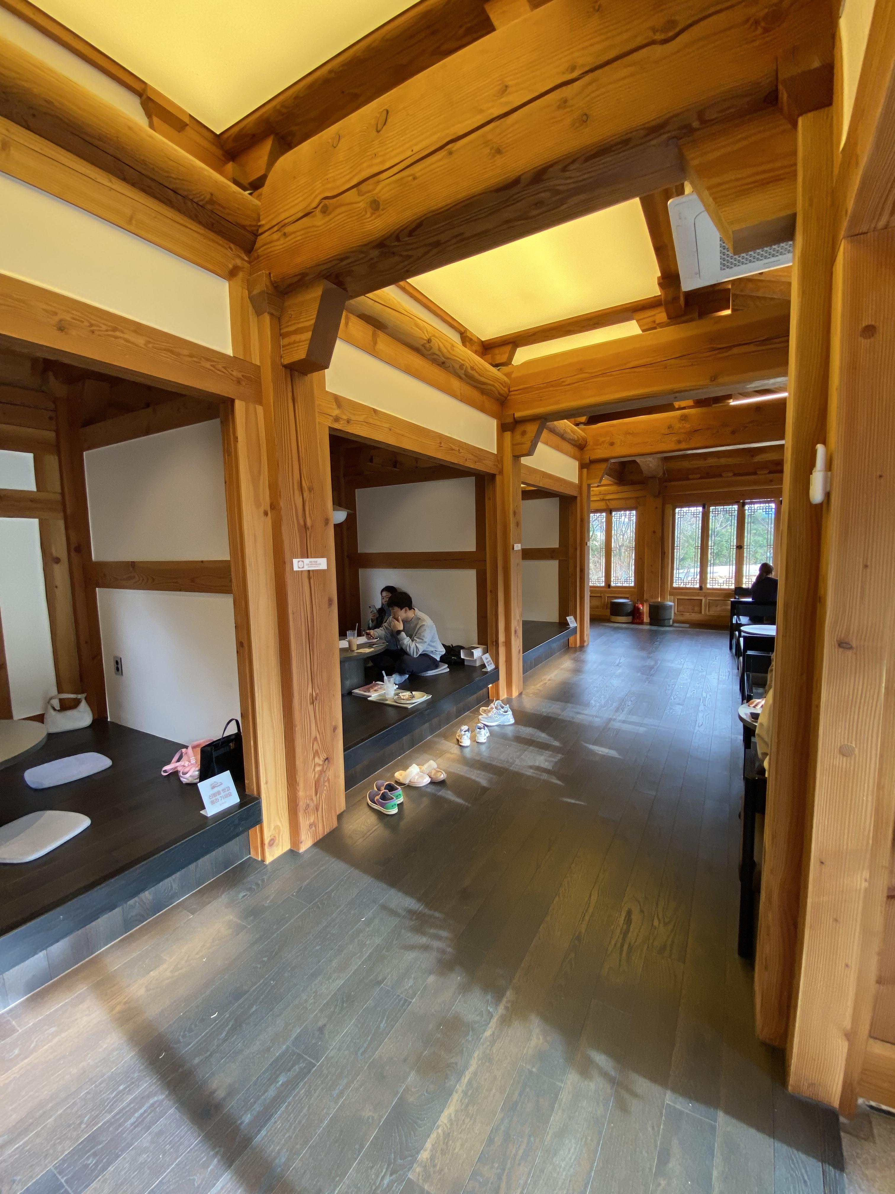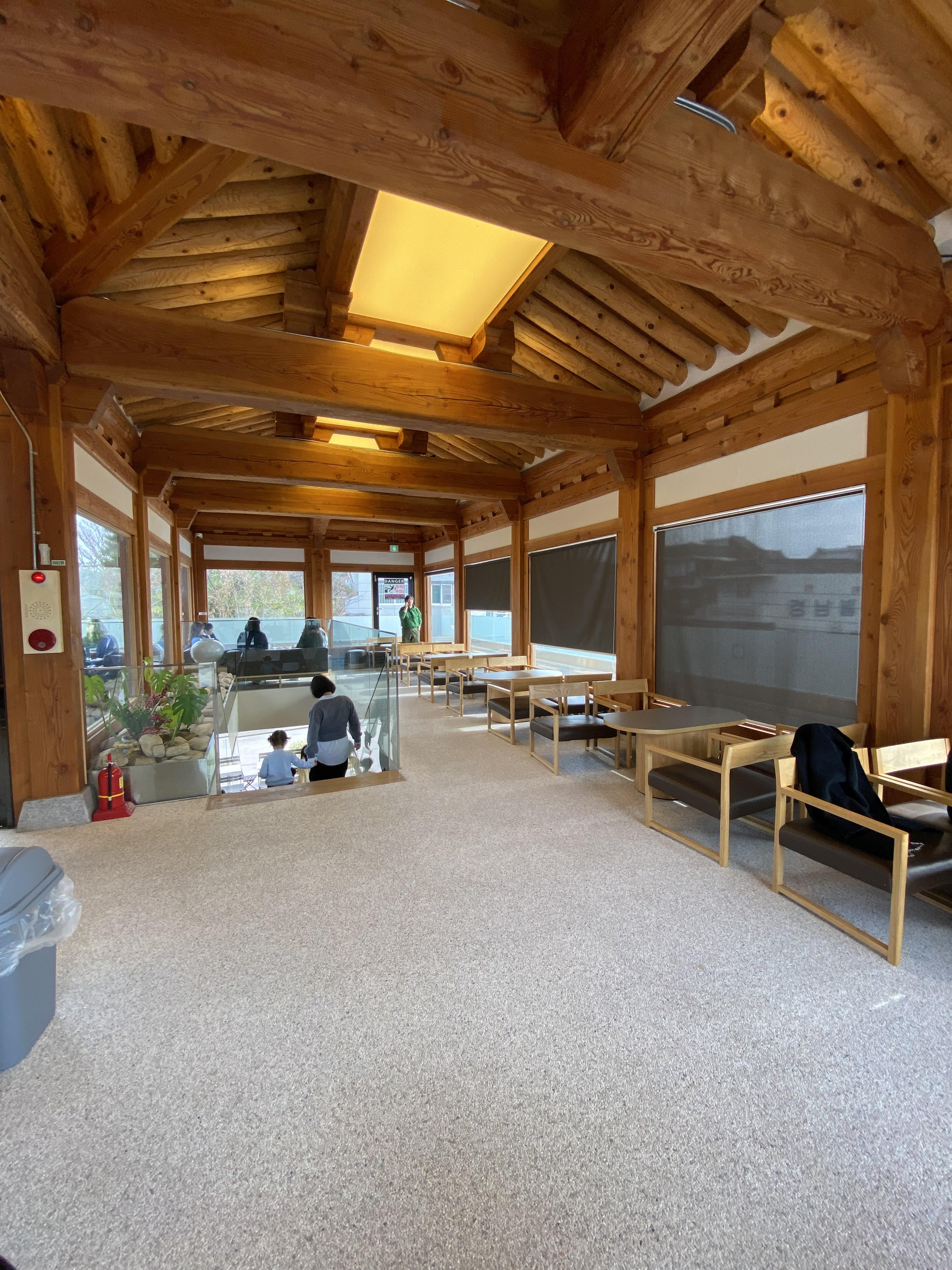 한옥 스타일의 2층으로 올라가면 1층과 연결된 공간의 실내와 한옥 단 독채로 지어진 건물이 나옵니다.