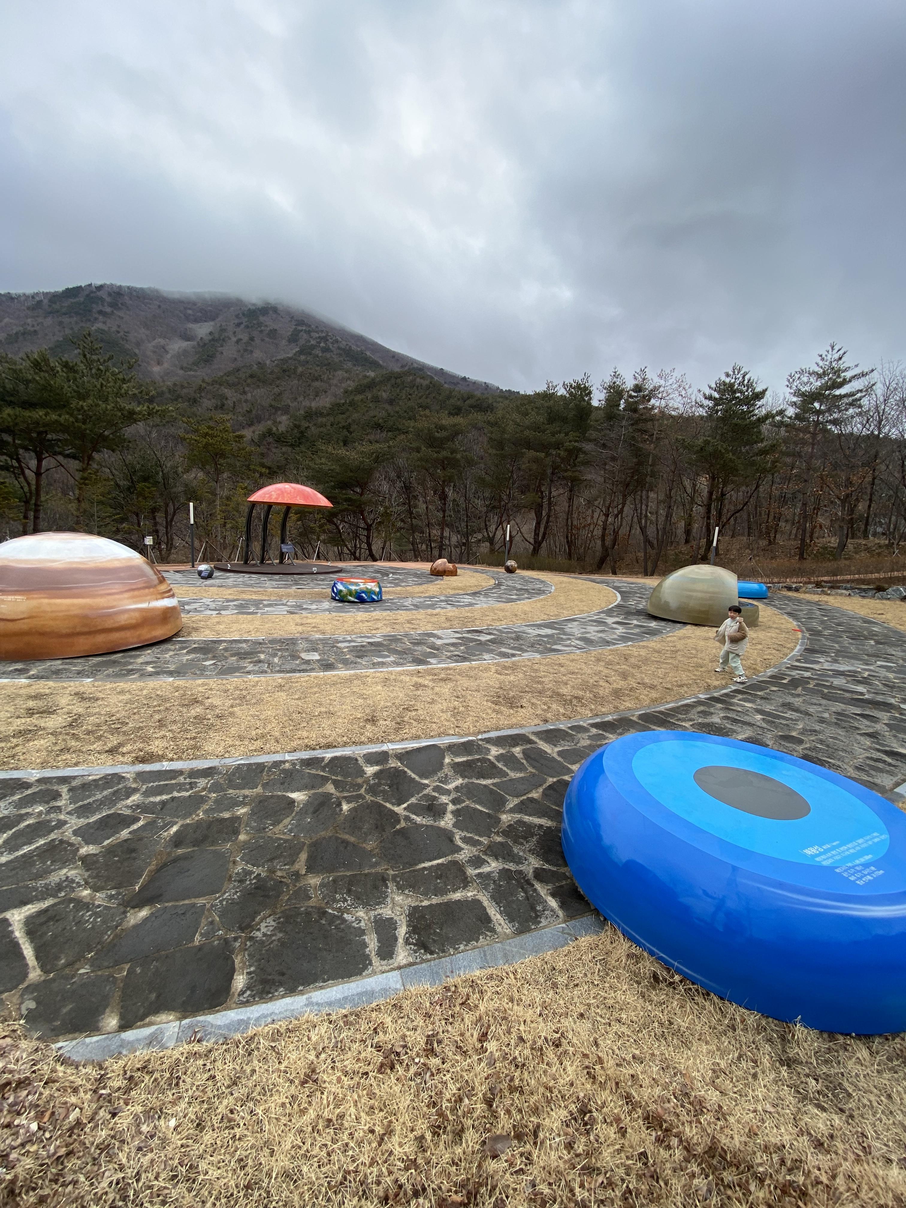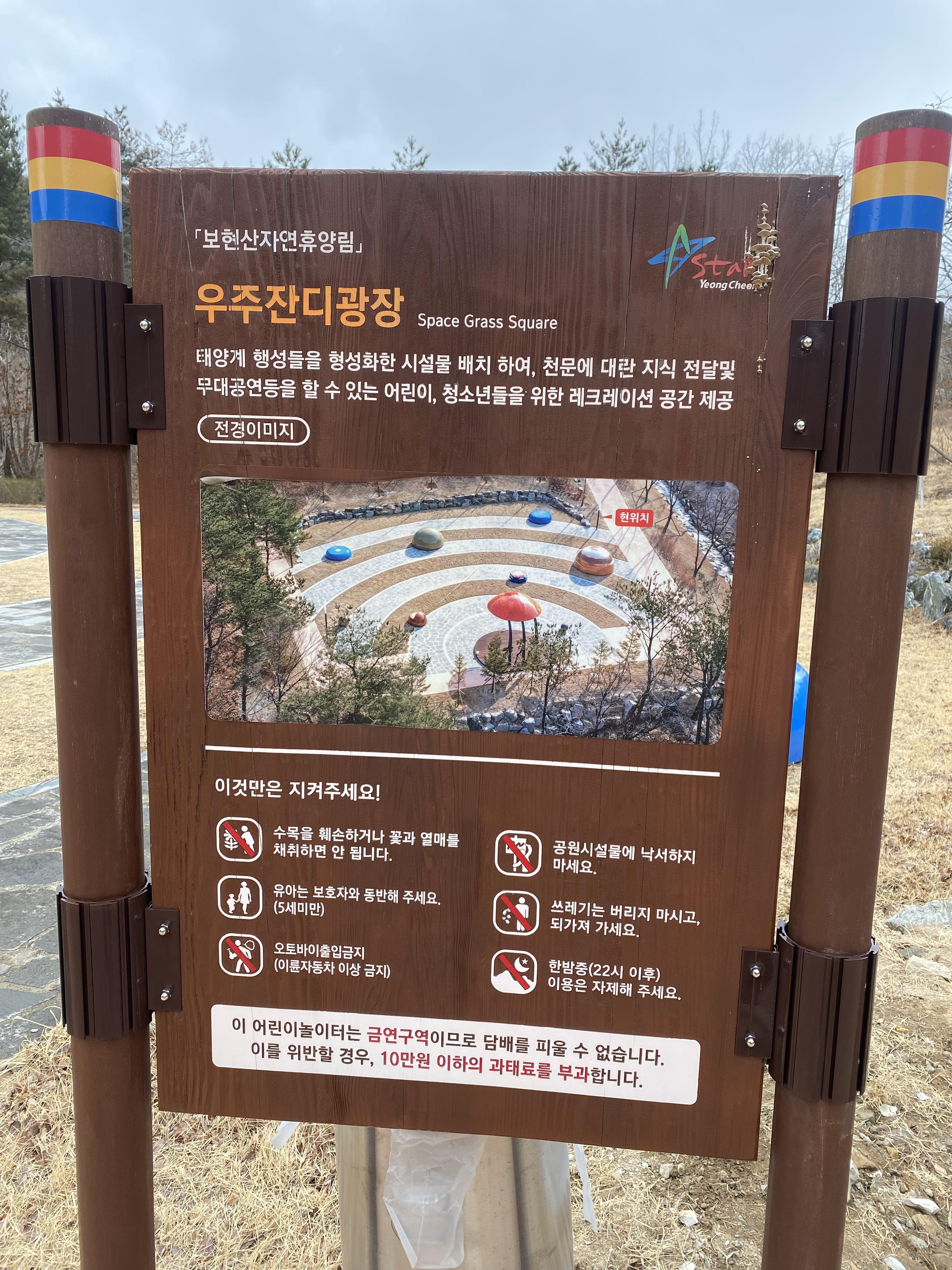보현산 천문과학관이 근처에 있어서 그런가? 야외 놀이공원에 우주 잔디광장을 만들어놨습니다. 태양을 중심으로 해서 돌고 있는 행성들을 거리순에 따라서 알기 쉽게 잘 꾸며놨습니다. 수,금,지,화,목,토,천입니데이^^