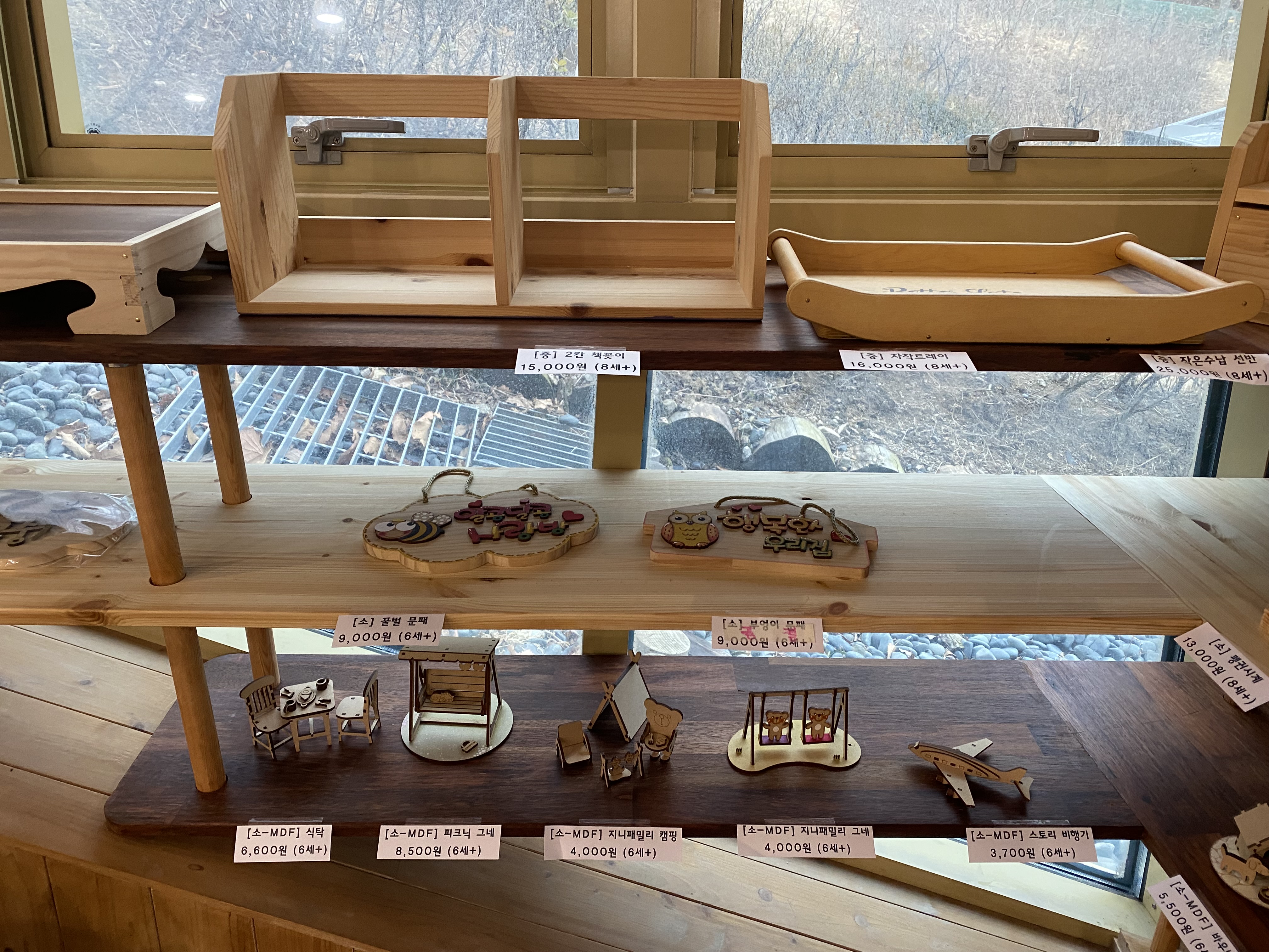 입구에 들어서면 다양한 모공 작품들이 전시되어 있는데 가격표가 같이 붙어 있습니다. 가격을 보고 맘에드는 목공 작품을 선택해 카운터에 가서 해당 작품을 말하고 결제하면 체험준비는 끝!!