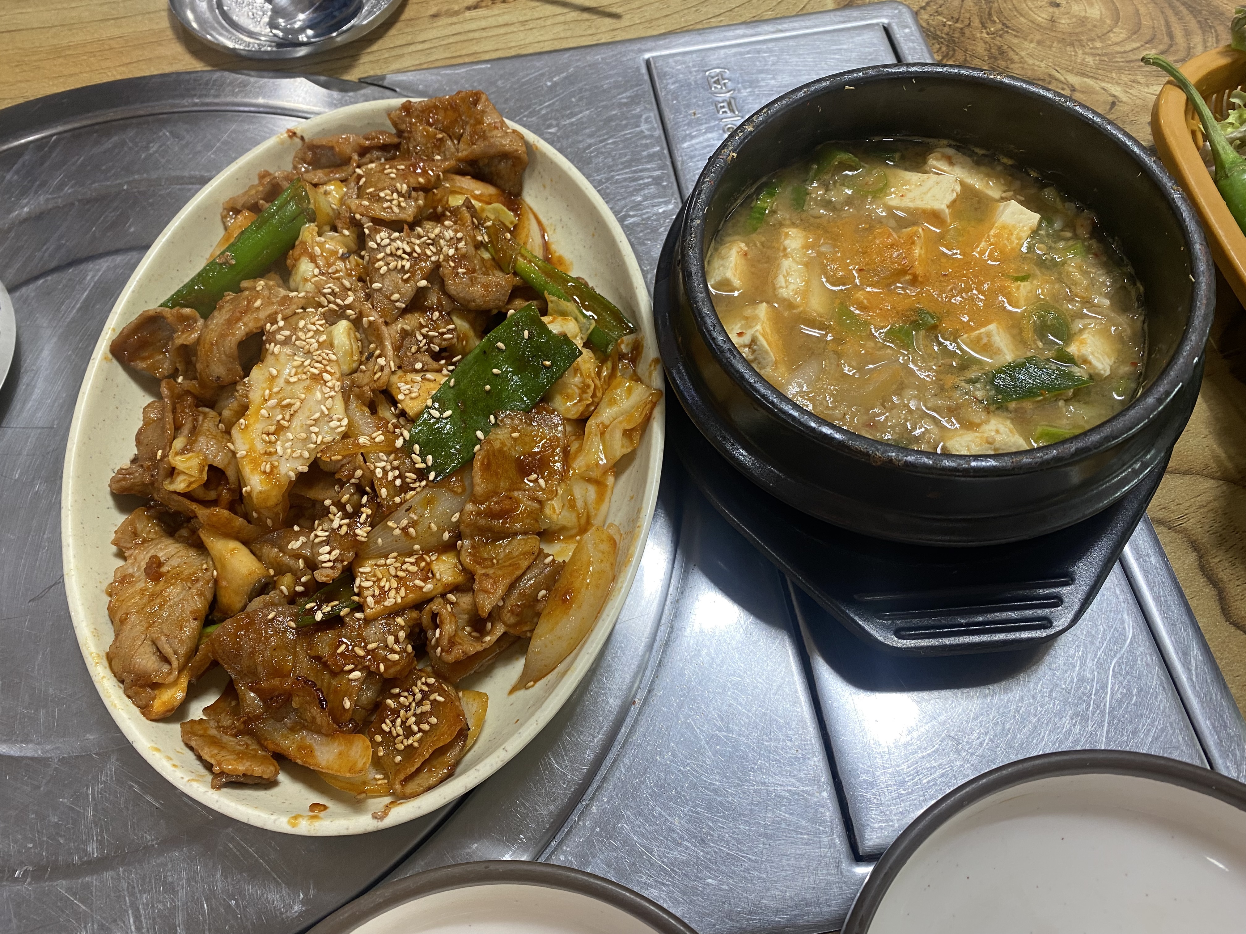 다양한 메뉴들이 대부분 2인 기본 주문이라 하나씩 다 맛보고 싶었으나 어쩔 수 없이 한 가지 메뉴를 선택해야 했지요. 차돌박이 된장, 소불고기 요런 것도 맛보고 싶었으나 결국 선택한 건 제육볶음입니다. 그리고 1인 메뉴 가능한 된장찌개 추가로 주문을 했습니다.