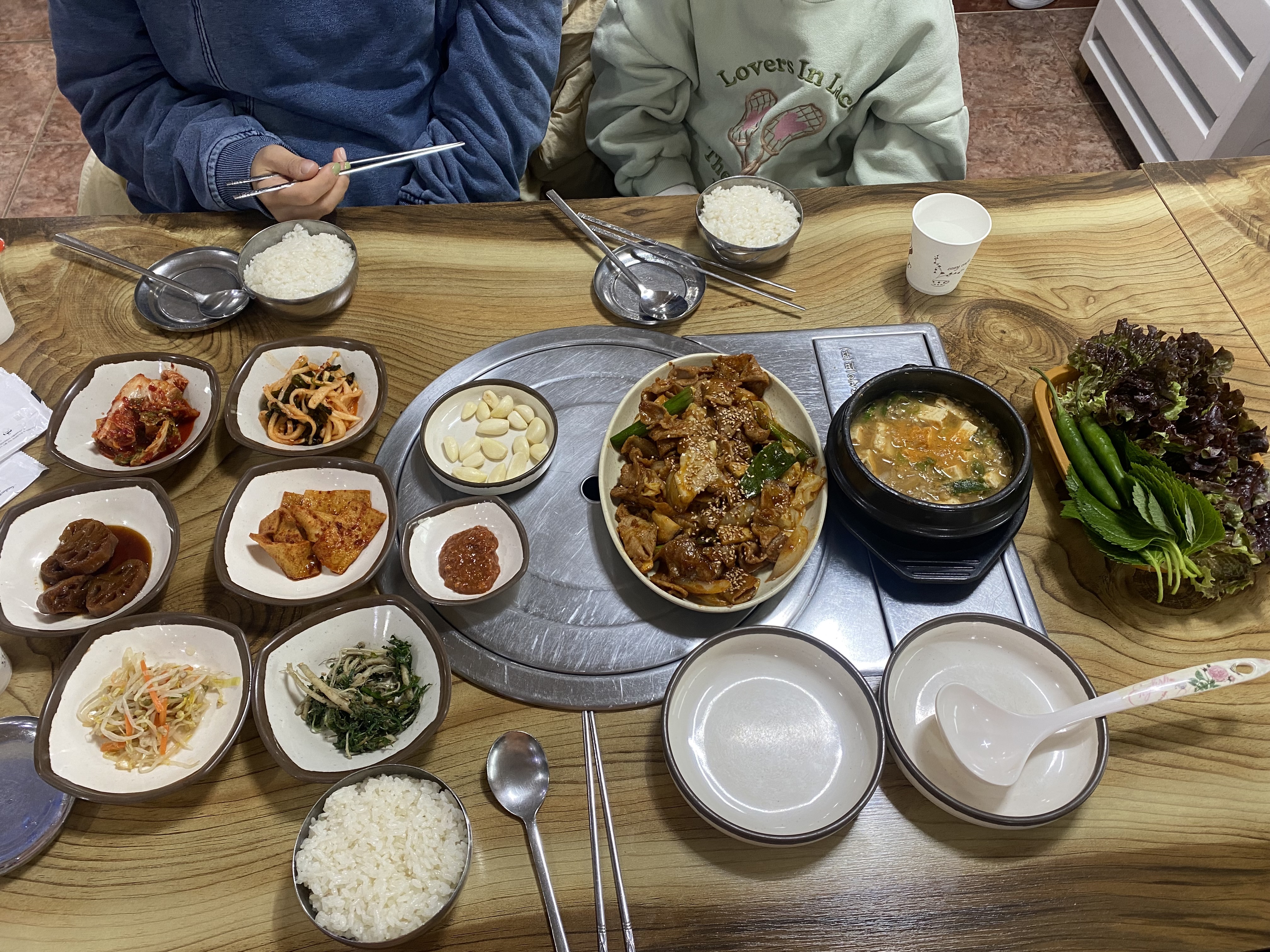저희 집은 저 빼고 소식좌들이라 2인분만 시켜도 충분하지만 맵찔이 아들을 위해 젤로 좋아하는 된장찌개를 시켜줬답니다. 한상 거하게 차려졌습니다. 우측 메인메뉴인 제육볶음과 된장찌개가 맛깔스럽게 보이쥬~~???!!