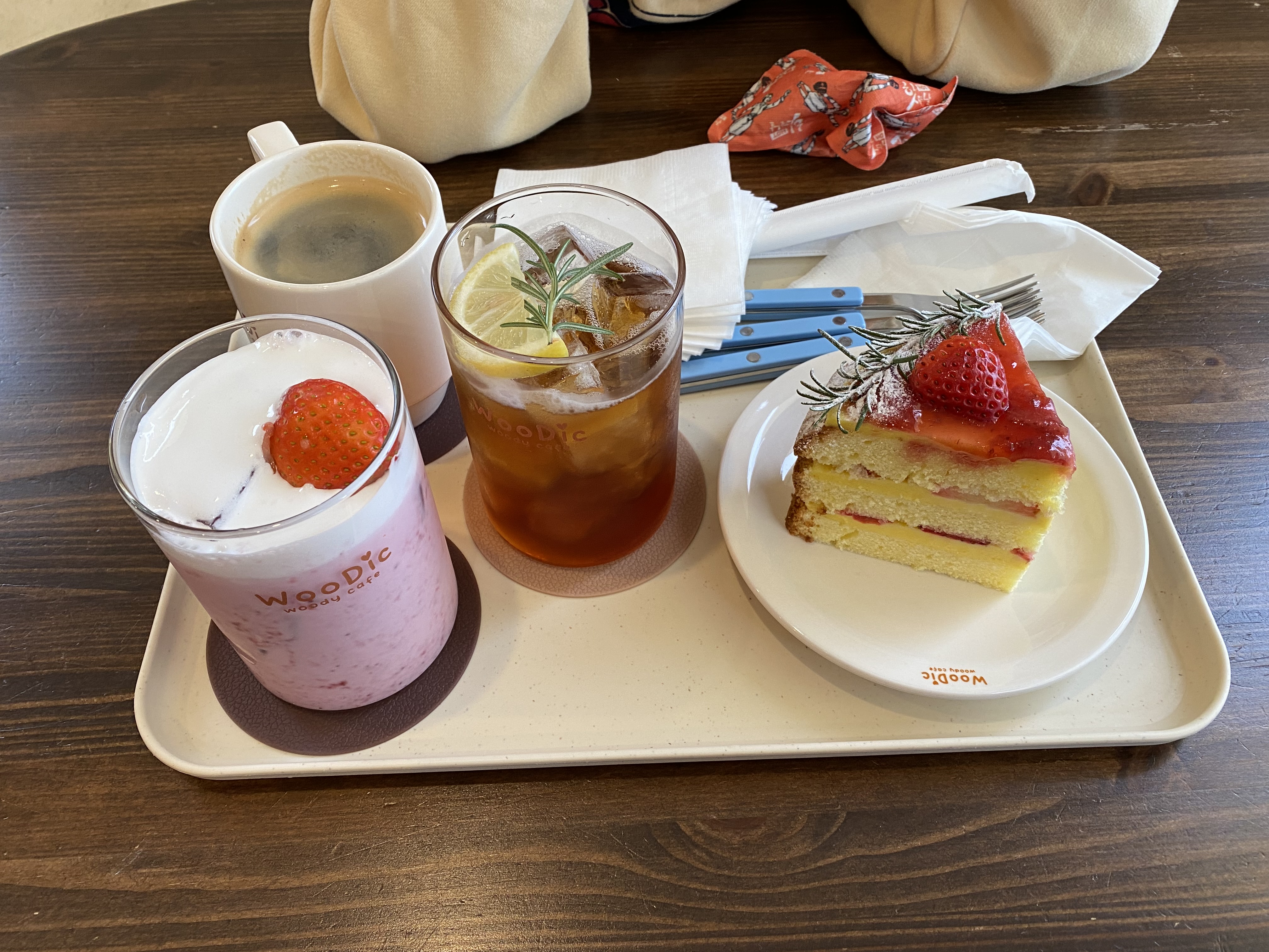 디저트 카페답게 맛있는 케이크와 빵류들이 있는데요, 다양하게 맛을 보고 싶었으나 배가 부른 상태라 딸기 케이크 한 조각만 주문했습니다. 그리고 음료는 아메리카노, 딸기라떼 그리고 나머지 한 잔이 기억이 가물가물한데 아마도 오미자 히비스커스였던 거 같습니다.